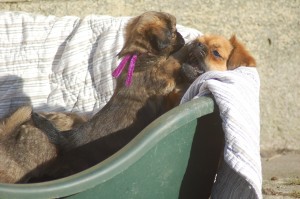 I dag kom solen og jeg fandt et sted hvor jeg kunne stille den store hundeseng så den var nogenlunde i læ, så hvalpene måtte lige lidt udenfor og få lidt frisk luft. De fik selvfølgelig deres mor med og lidt legetøj og så har man faktisk det hele når man er en lille hvalp.