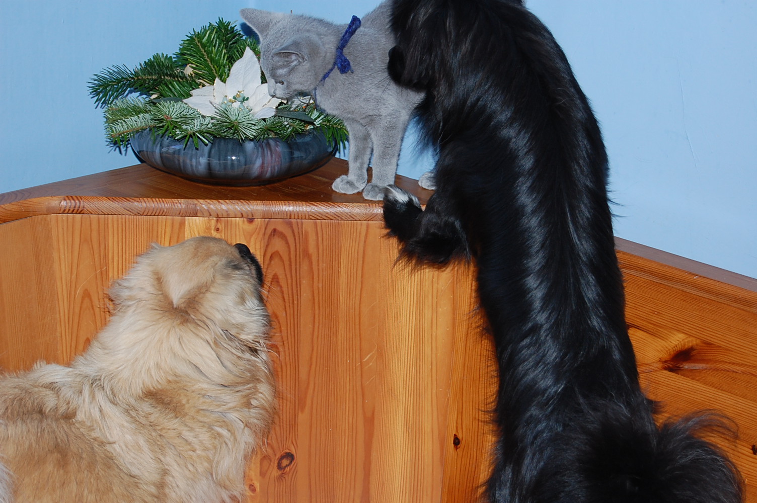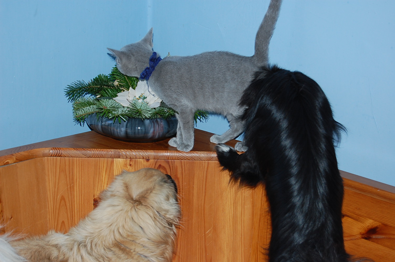 der med høj haleføring, og tryg og glad sammen med mine nysgerrige Tibetanske Spaniels Gya og Ghana, undersøger min juledekoration.
