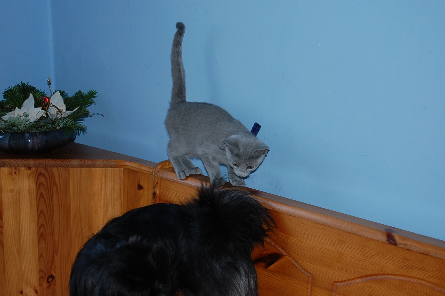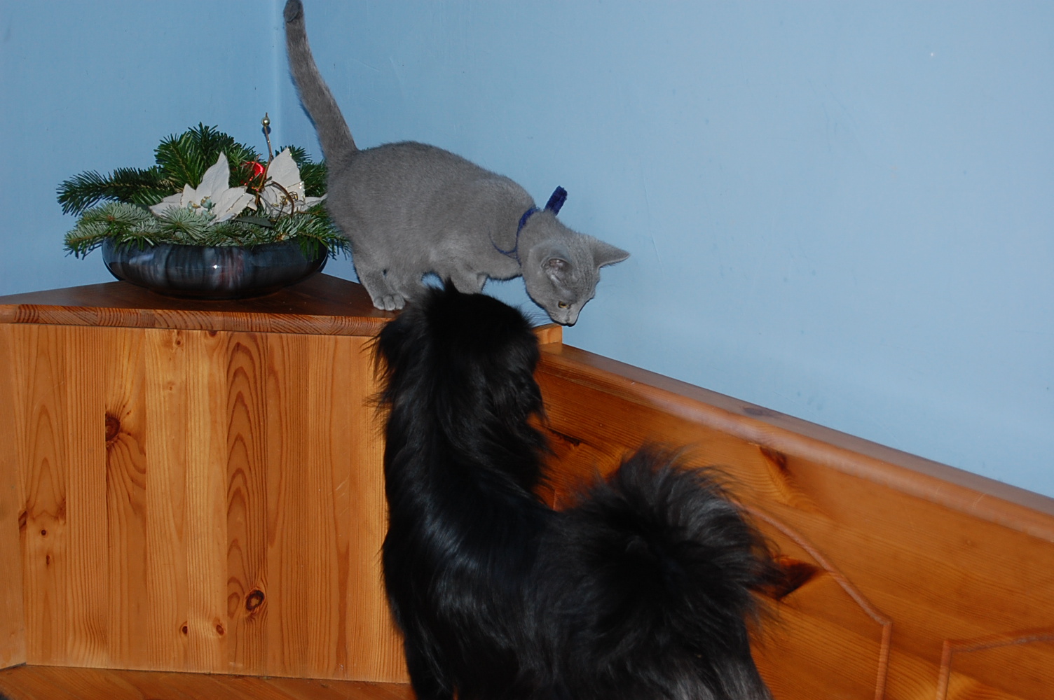 Indtil videre har hverken kat eller dekoration taget skade af mødet. Dekorationen er beregnet på at den skulle være farefri for nysgerrige katte. Stearinlys , glaskugler og lignende farlige sager er bandlyst i mit hus ! men man kan da godt jule lidt alligevel.