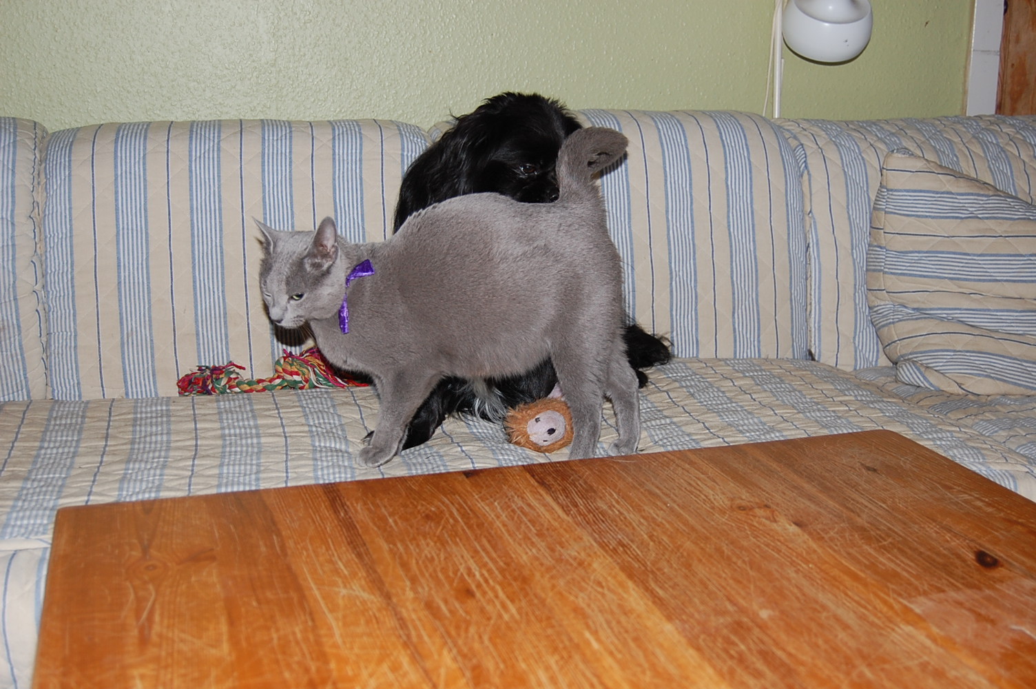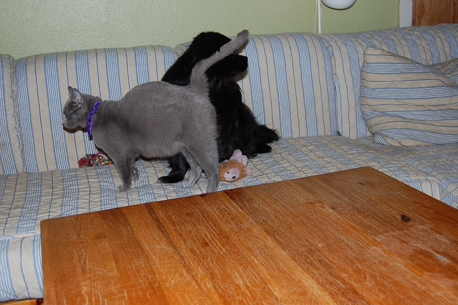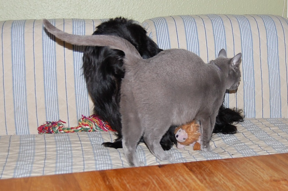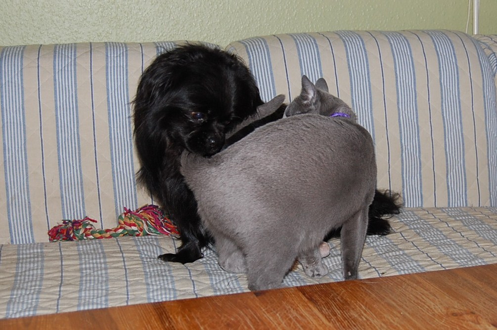 I dag fik jeg taget nogle billeder af min høj gravide hunkat Xantippe, der fandt min hanhund Oliver oppe i sofaen. Den måde de to opførte sig på og Oliver`s store interesse i Xantippe`s bagdel, får mig til at tro at hendes fødsel er meget nært forestående. Spændende om jeg får ret !