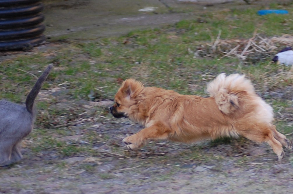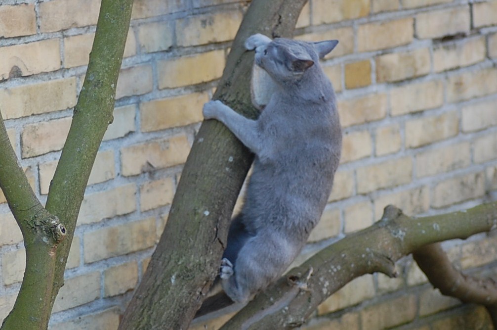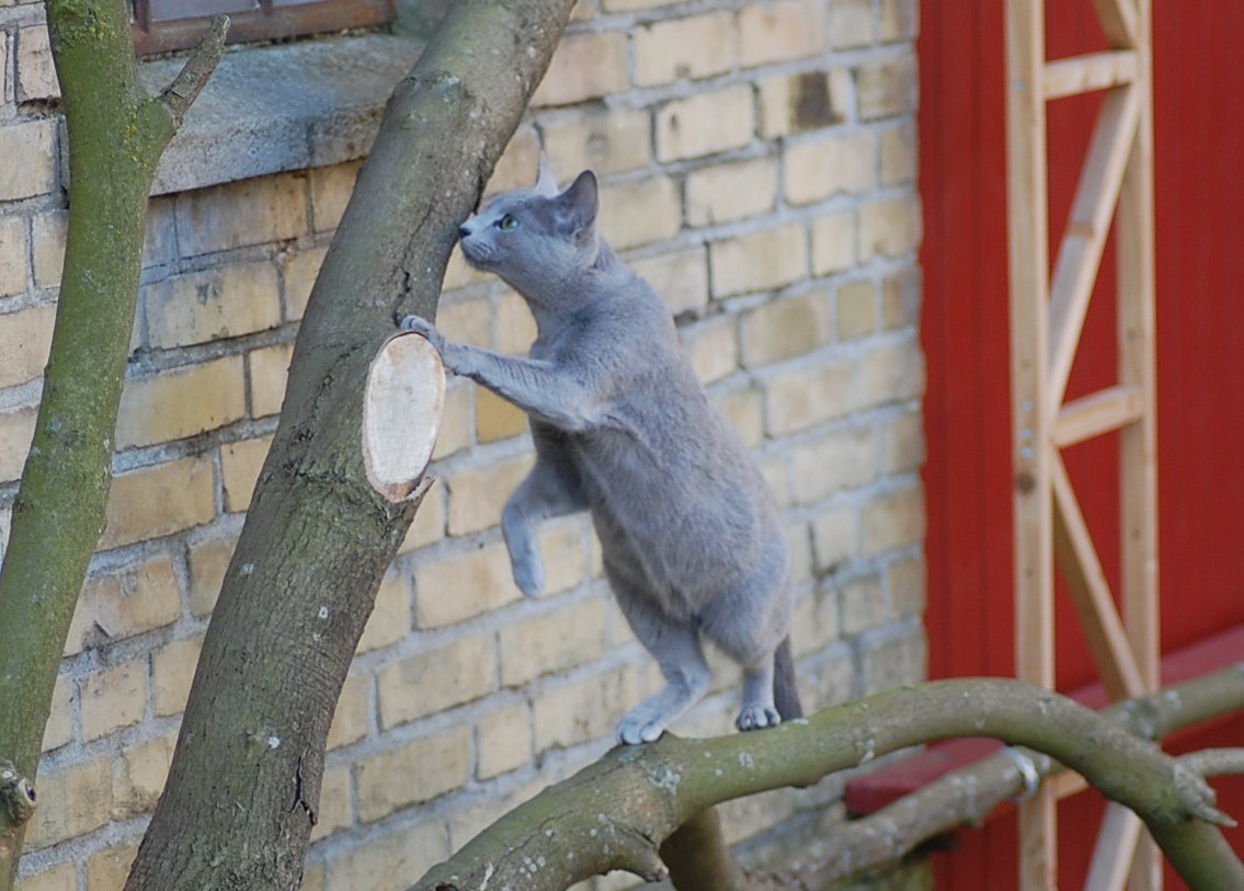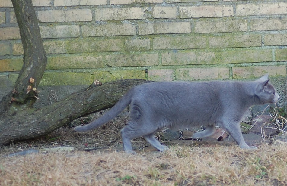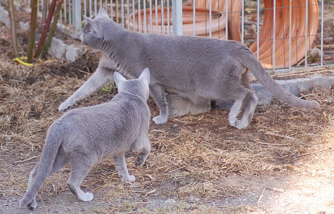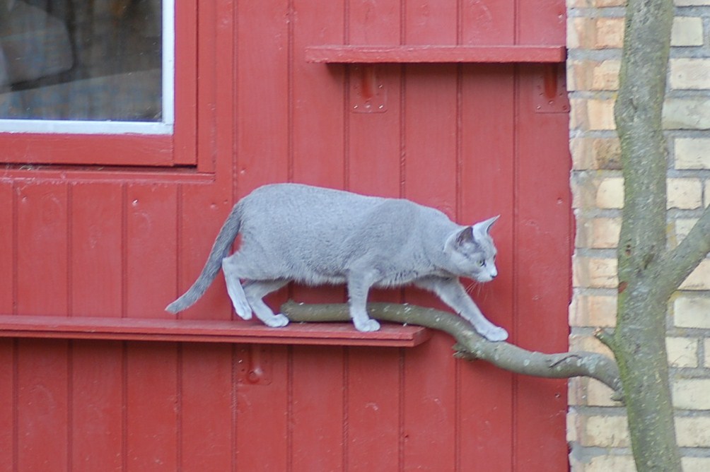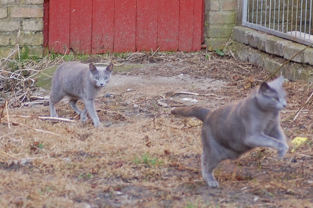 var ude på gårdspladsen fra morgenstunden og det kom der nogle ret gode billeder ud af. Kattene har fået lov til at gå sammen et stykke tid og det skulle der jo ikke ske noget ved, når hunkatten ikke var i løbetid, troede jeg. Jeg kunne nu godt få en mistanke om noget andet, når jeg ser på disse billeder. Ruby havde det mægtigt skægt med at løbe efter kattene og Oliver vær i nærkontakt med Kosmos, men de bedste billeder var nok dem af Juliana der hørte en due oppe på taget og bestemte sig for at gå på jagt efter den. Hun afslørede at der var en mulighed for en målbevidst og slank russer for at gemme sig totalt, men hun kunne ikke komme ind på loftet, og duen på taget kom hun slet ikke i nærheden af.