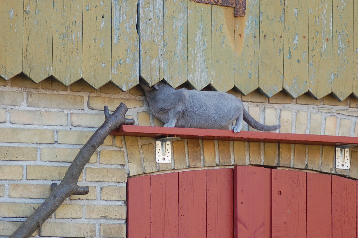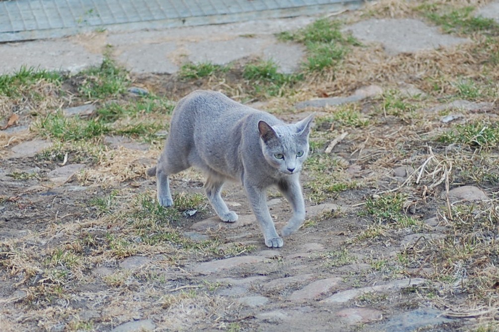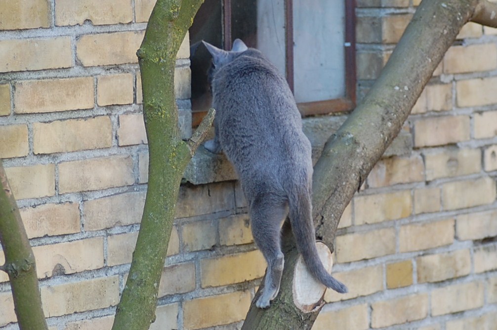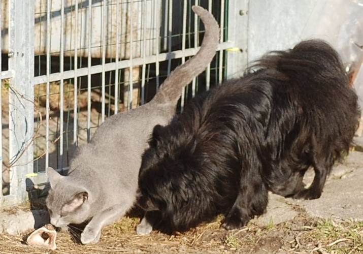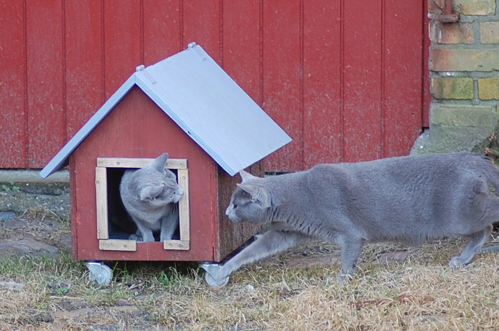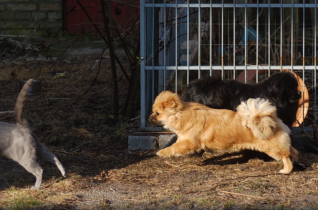 var ude på gårdspladsen fra morgenstunden og det kom der nogle ret gode billeder ud af. Kattene har fået lov til at gå sammen et stykke tid og det skulle der jo ikke ske noget ved, når hunkatten ikke var i løbetid, troede jeg. Jeg kunne nu godt få en mistanke om noget andet, når jeg ser på disse billeder. Ruby havde det mægtigt skægt med at løbe efter kattene og Oliver vær i nærkontakt med Kosmos, men de bedste billeder var nok dem af Juliana der hørte en due oppe på taget og bestemte sig for at gå på jagt efter den. Hun afslørede at der var en mulighed for en målbevidst og slank russer for at gemme sig totalt, men hun kunne ikke komme ind på loftet, og duen på taget kom hun slet ikke i nærheden af.