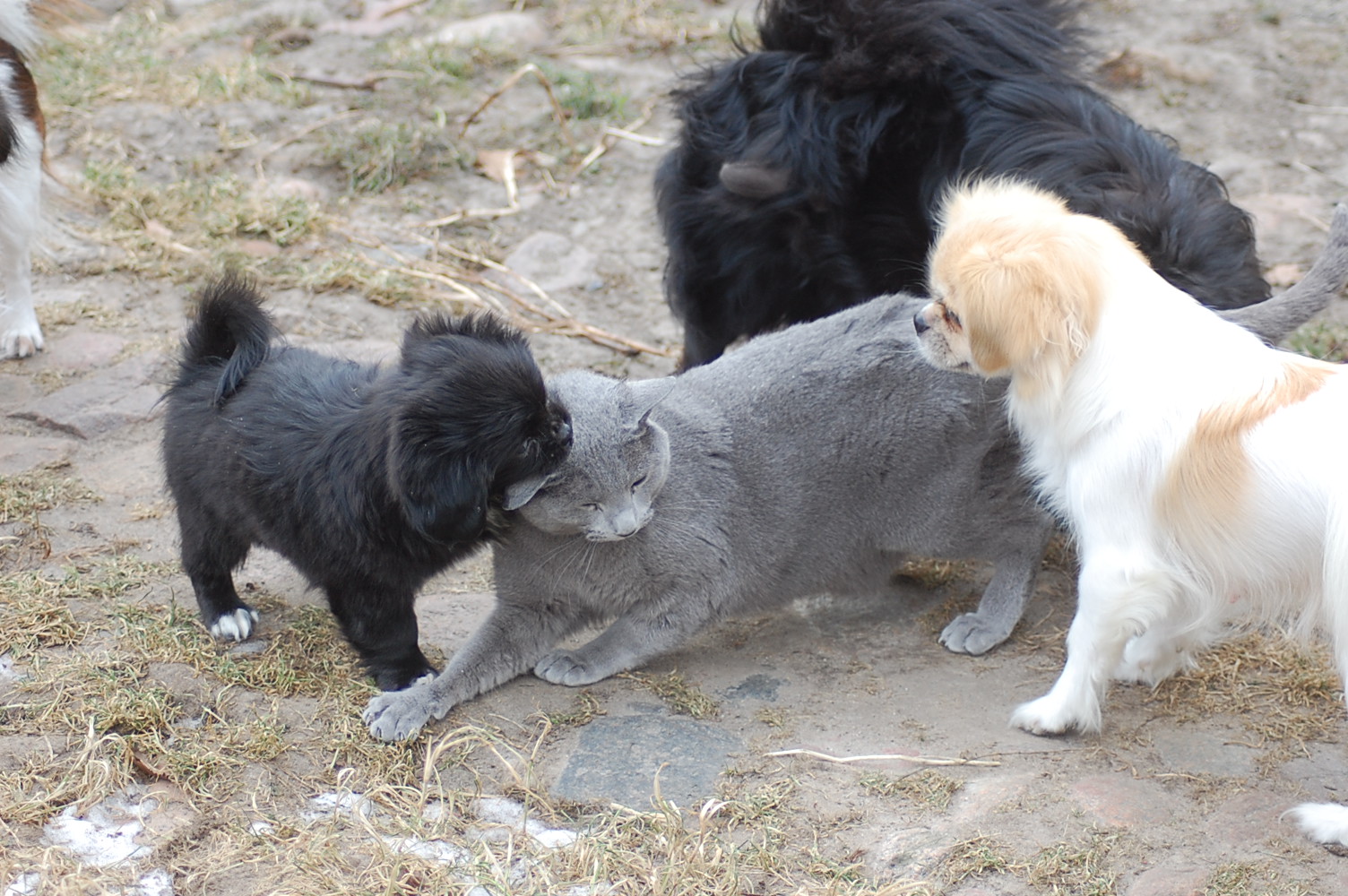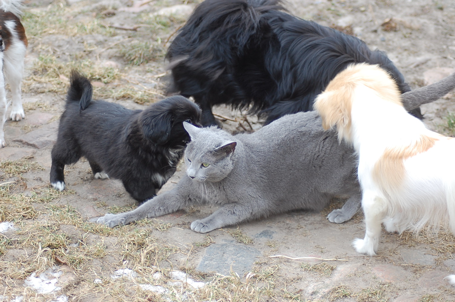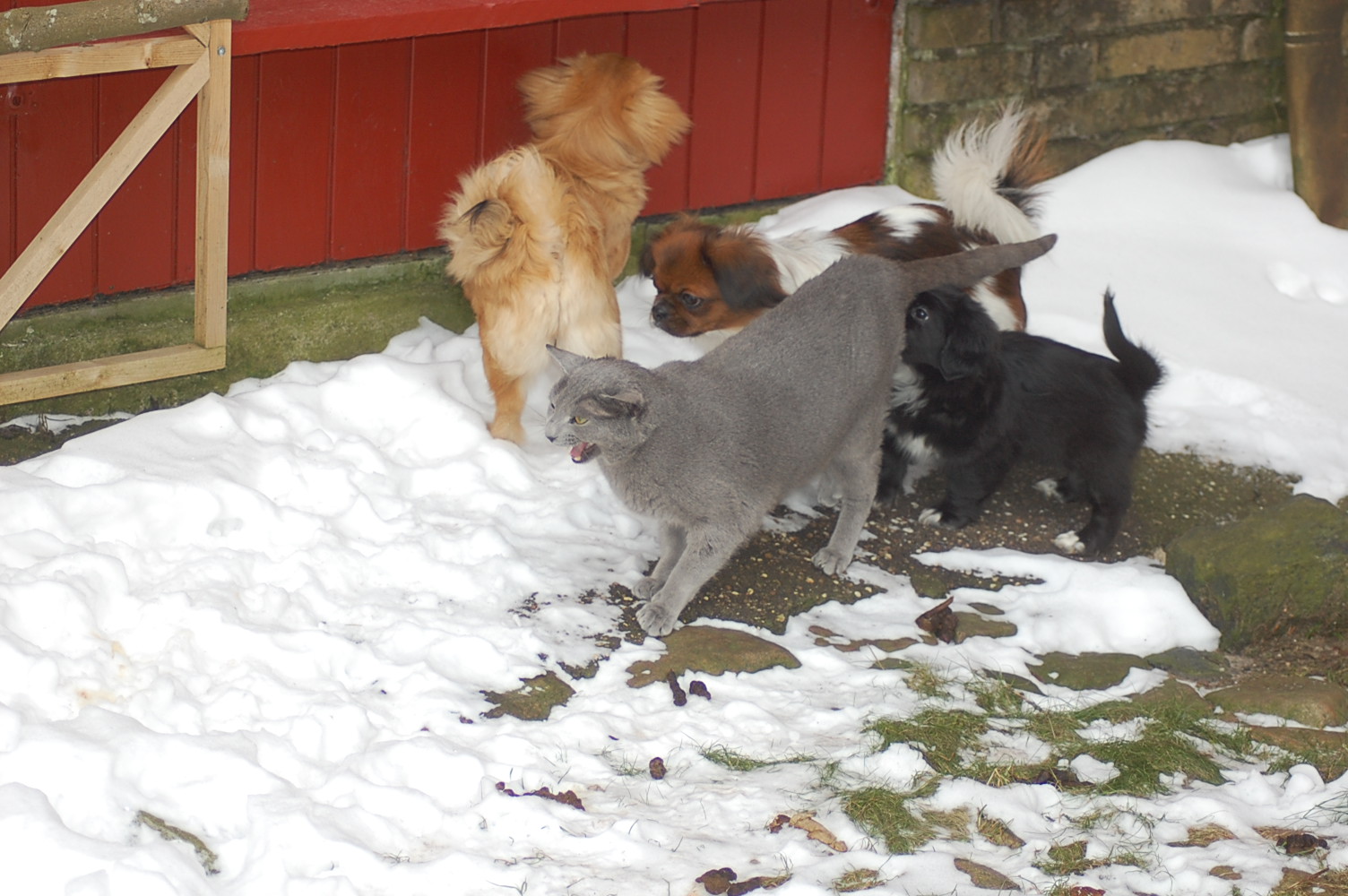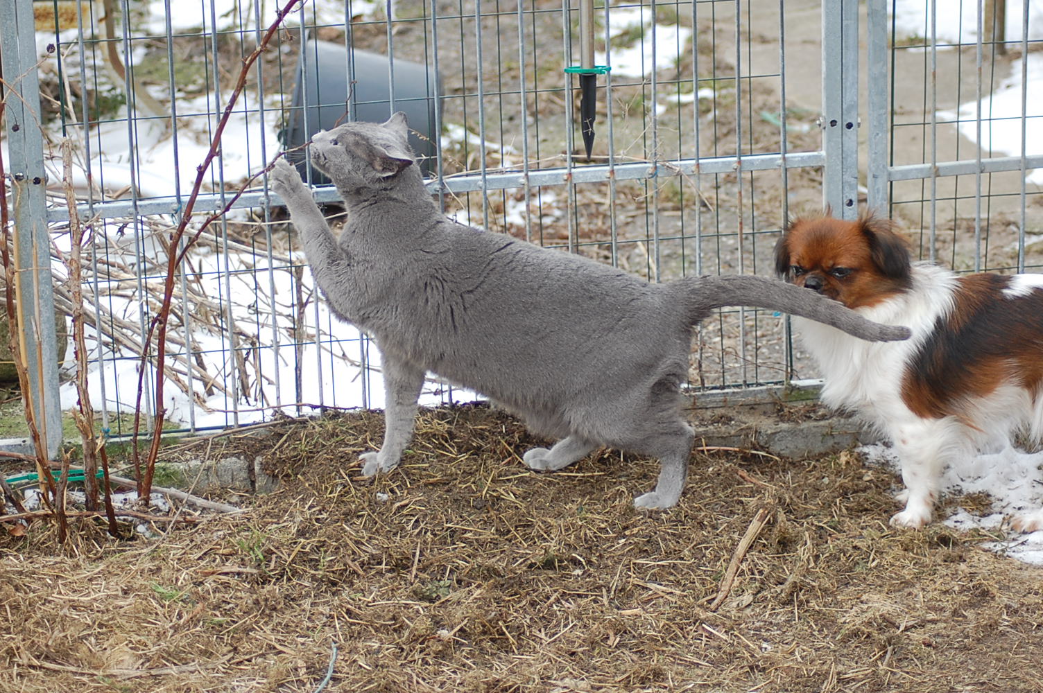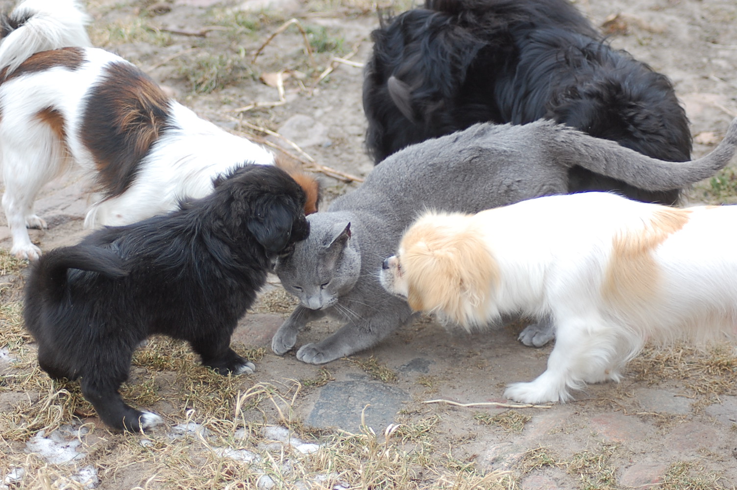 kommer fint ud af det med hinanden, men sommetider synes jeg at Kosmos burde finde sig i lidt mindre fra hundenes side. Når mine hunde møder en fremmed kat og de vil behandle den som et tøjdyr, så sker det at de får sig en grim overraskelse. I øjeblikket er det især Mio der tager sig rigtig mange friheder og bider kattene både i ører, hale og ben.