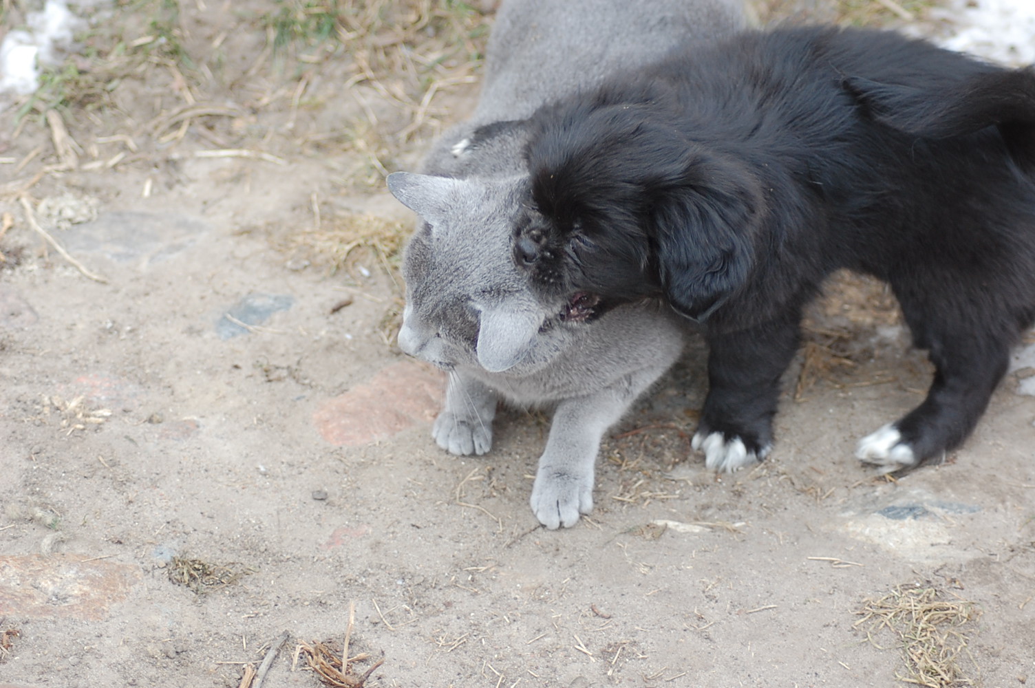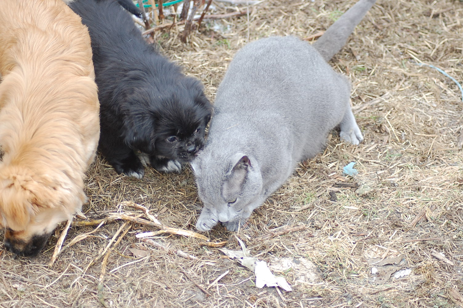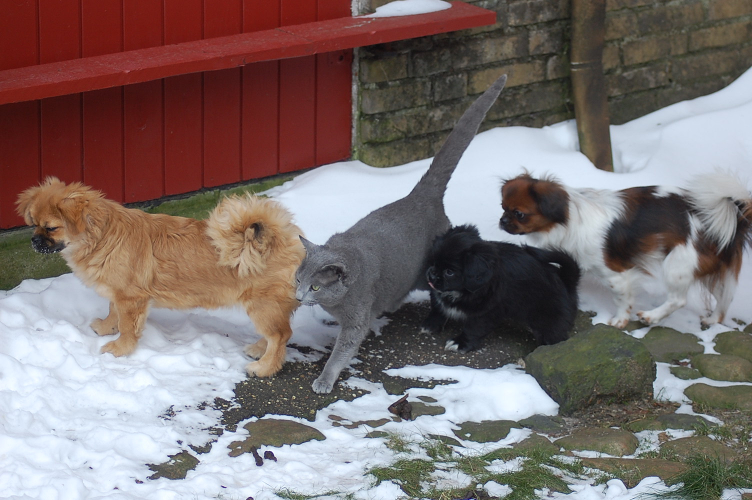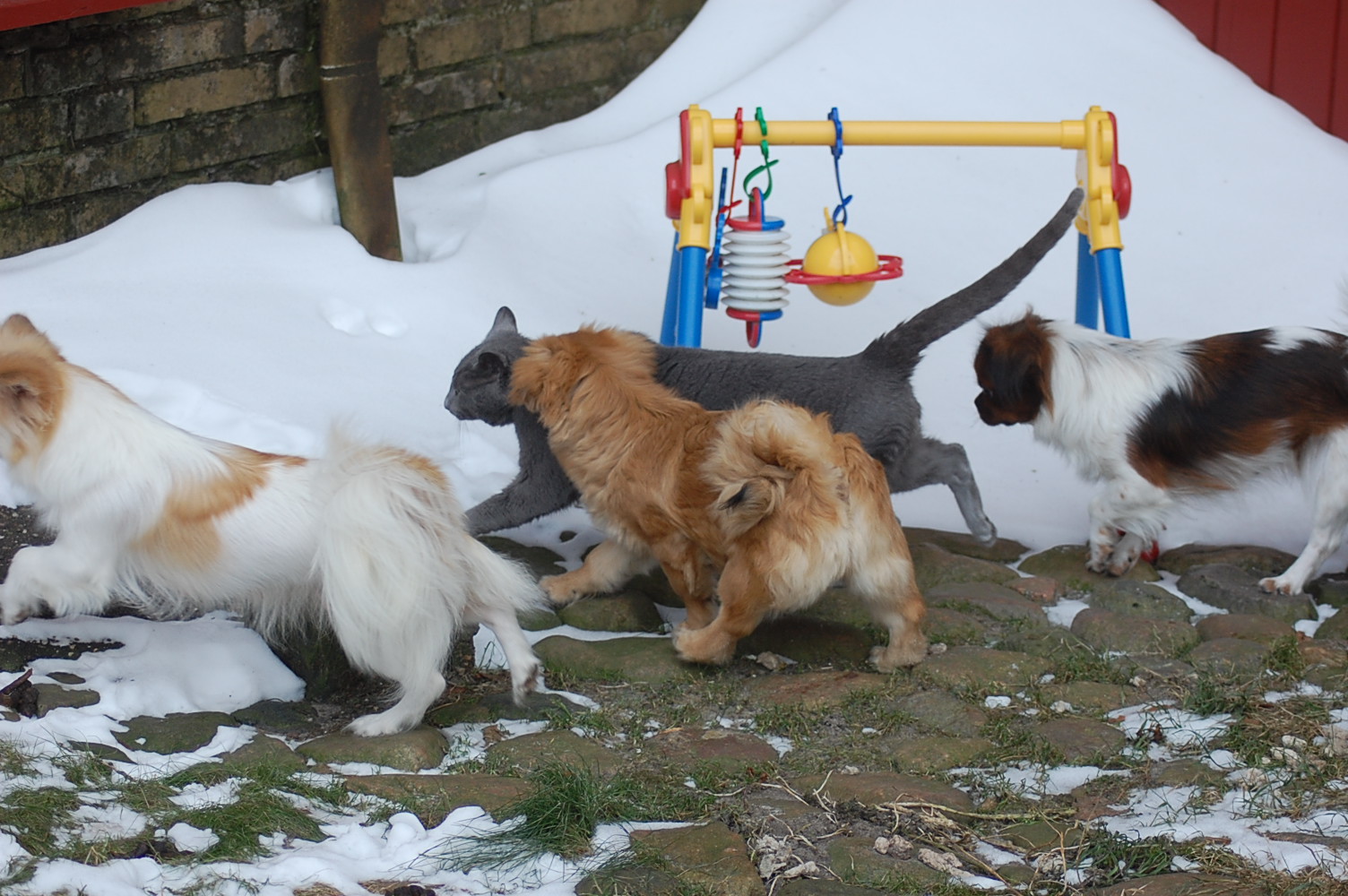 kommer fint ud af det med hinanden, men sommetider synes jeg at Kosmos burde finde sig i lidt mindre fra hundenes side. Når mine hunde møder en fremmed kat og de vil behandle den som et tøjdyr, så sker det at de får sig en grim overraskelse. I øjeblikket er det især Mio der tager sig rigtig mange friheder og bider kattene både i ører, hale og ben.