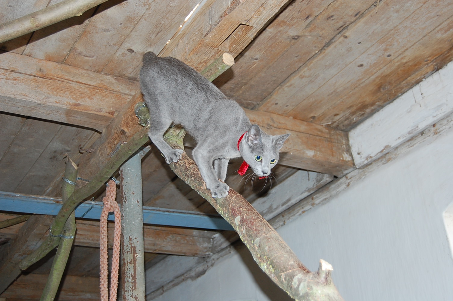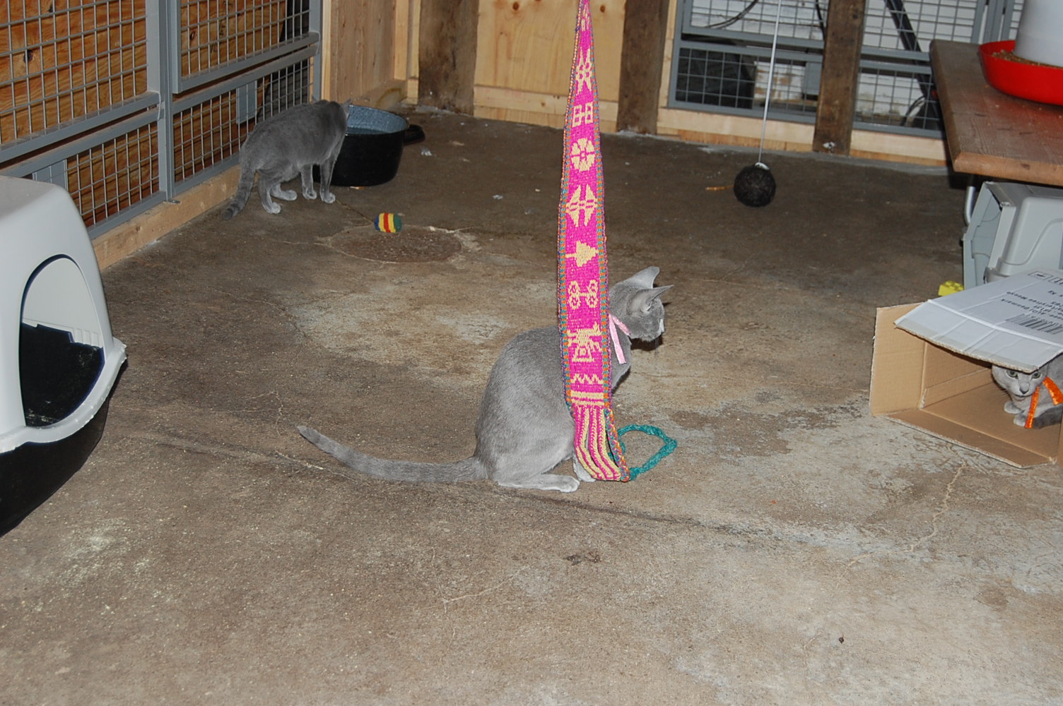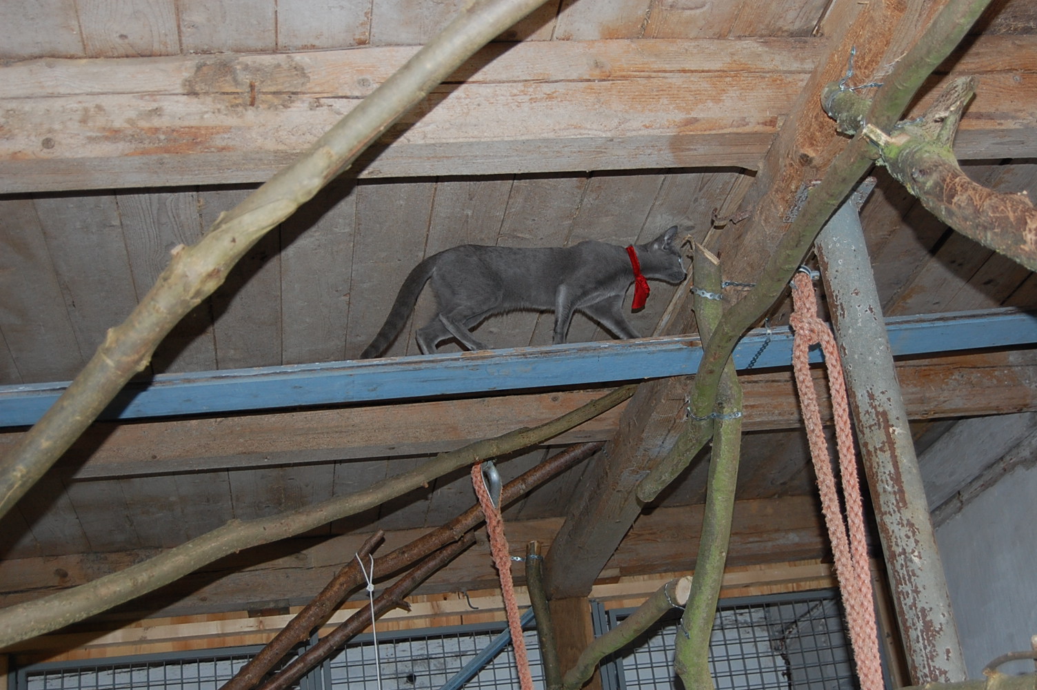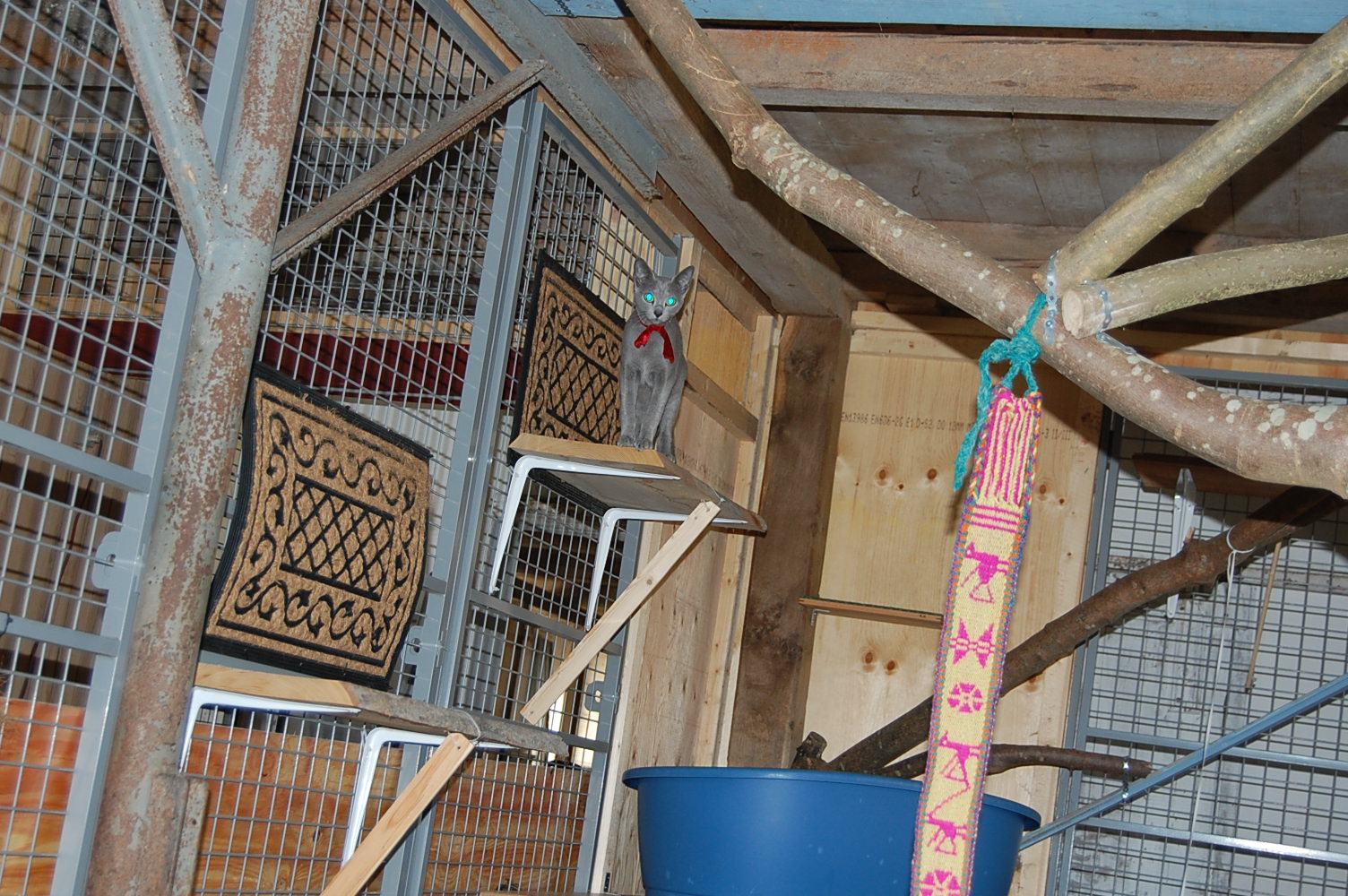 som jeg har indrettet til dem ovre i stalden har jo været et hit fra den dag det blev færdigt. Jeg har jo ikke haft det så godt med at gå igennem stalden , for det var jo der min lille pony og geden stod og hilste mig velkommen hver gang jeg kom derover. Det var et stort savn da de ikke var der mere og for at få lidt liv derover igen så fik jeg den idè at indrette et legerum til kattene. Jeg ved ikke om alle russere er lige så glade for at klatre højt op som mine er, men jeg satte et par brædder fast helt oppe på loftsbjælkerne og kattene elsker at klatre derop og ligge og holde øje med det hele.Kraftige grene der er fastgjort solidt er også gode at klatre på og hylderne jeg har sat op er gode liggepladser. Alt kan jo bruges bare kattene synes om det og selvfølgelig måtte der et par katte wc èr derover også og lidt legetøj der er hængt op. Et par papkasser og en gammel vasketøjskurv, foder og vand, en kattelem så de kan komme og gå som de vil, har jeg monteret i det ene staldvindue, for så kan mine små hunde ikke komme derind og kattene kan have rummet for sig selv.
