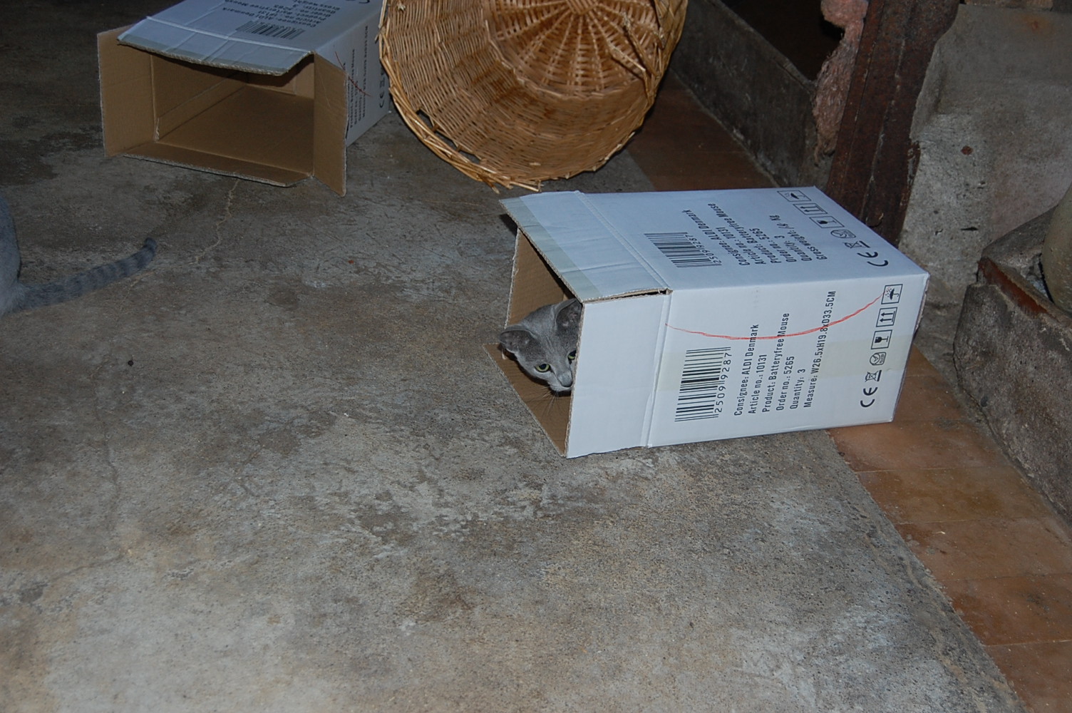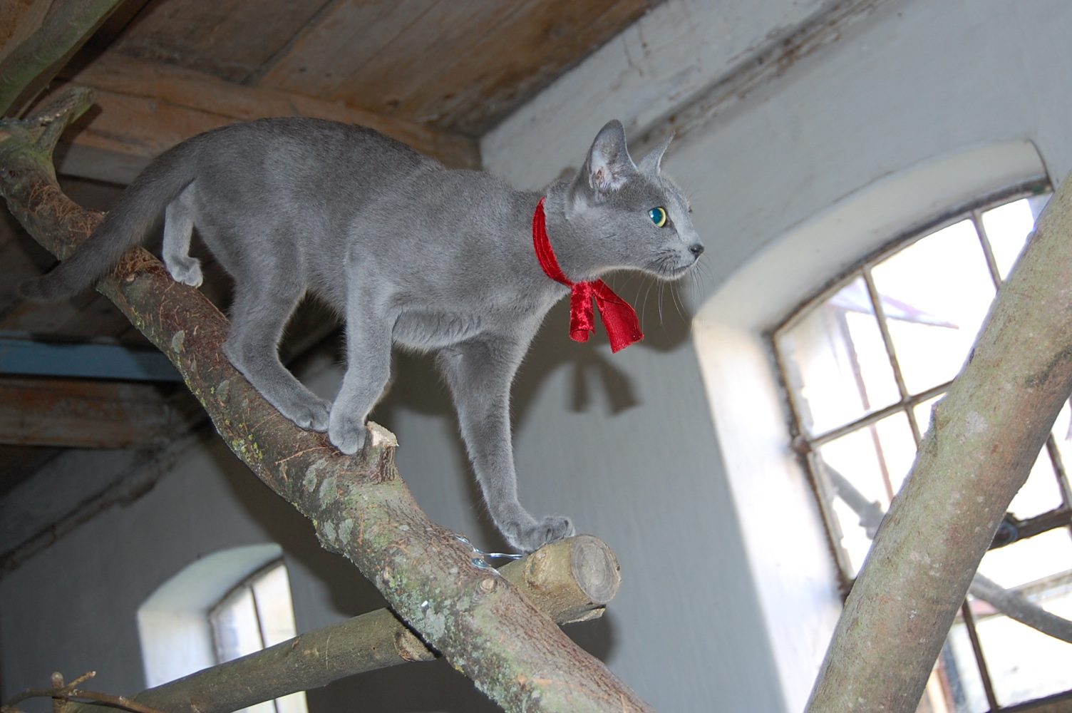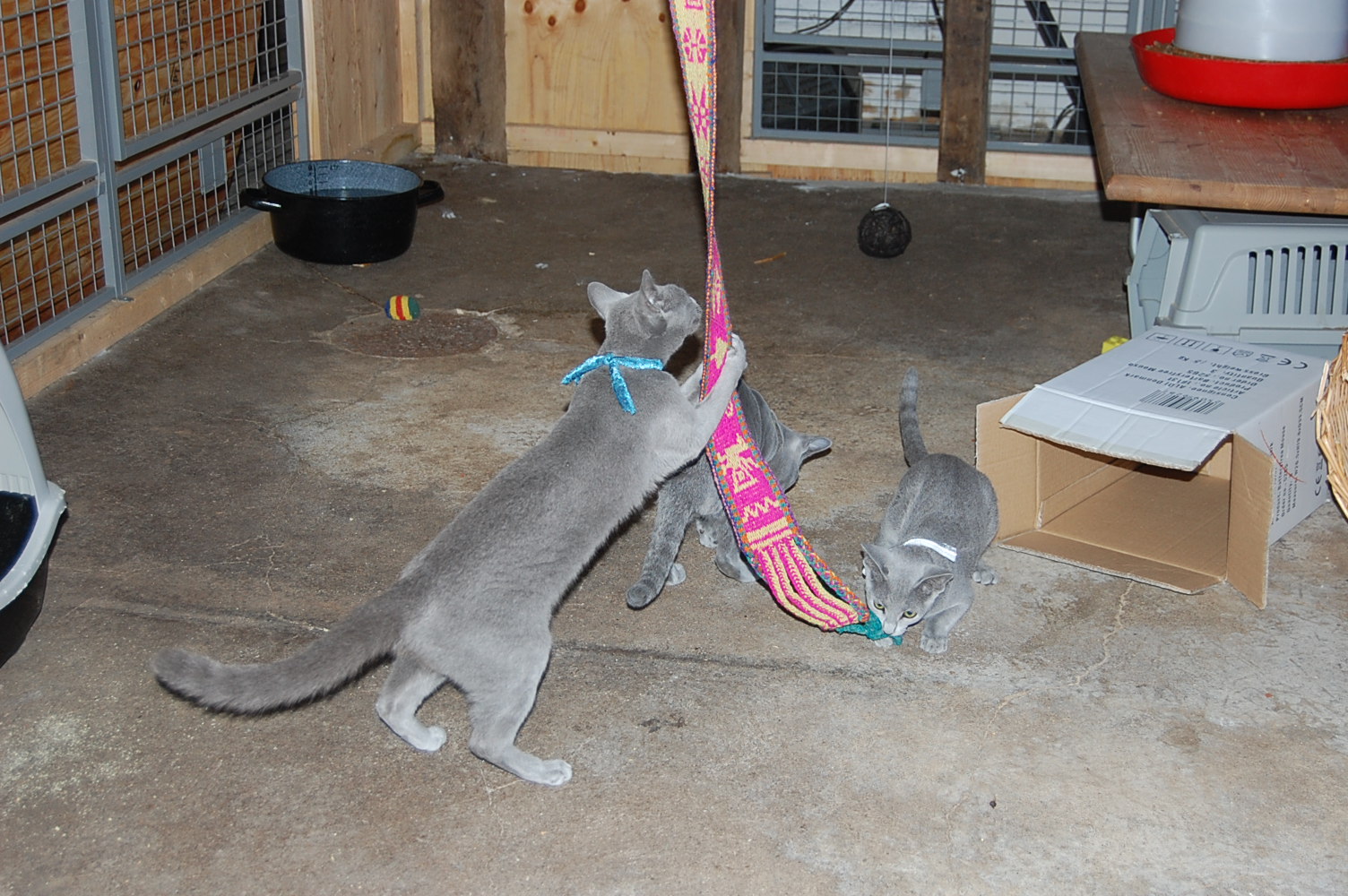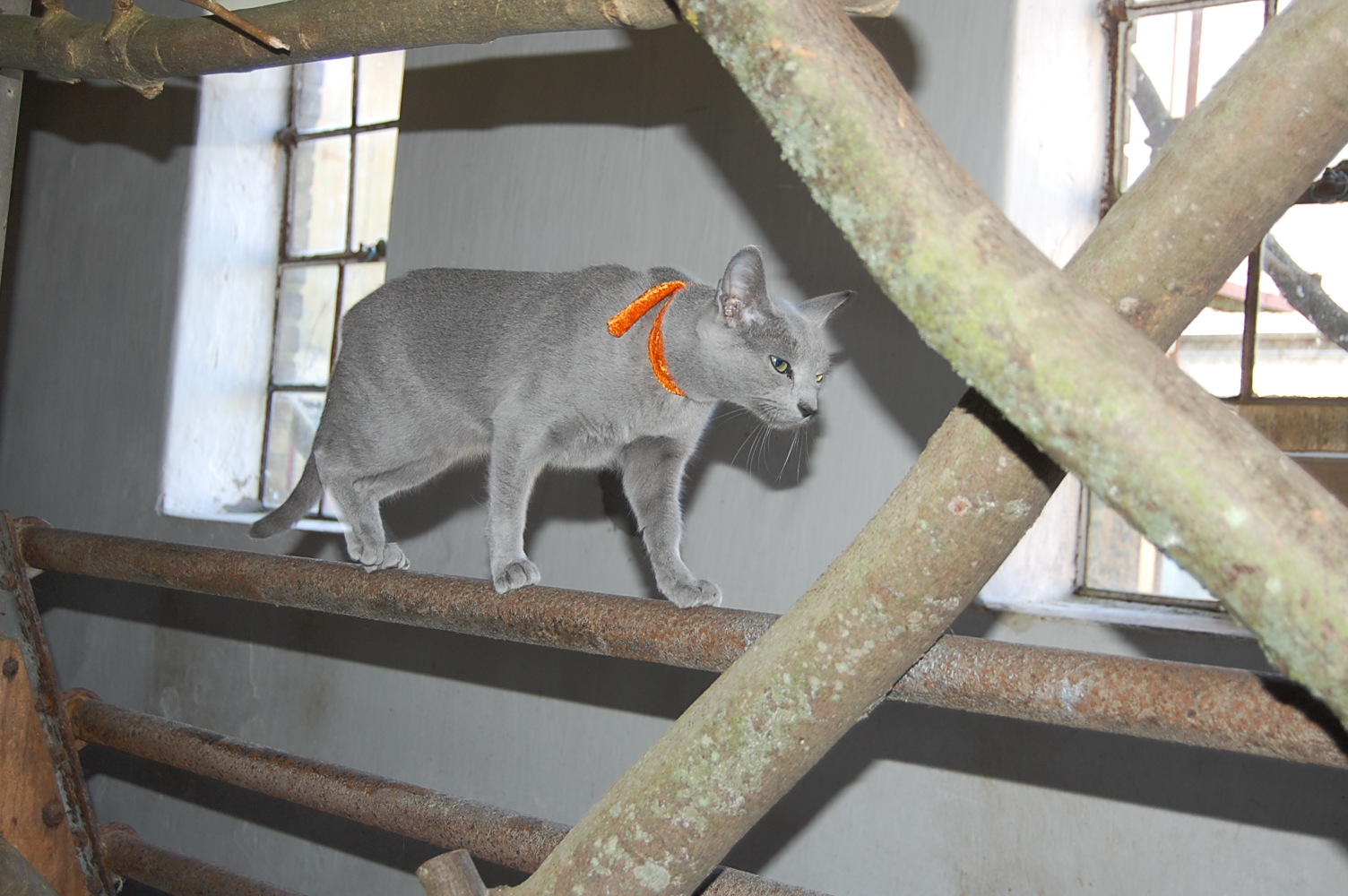 som jeg har indrettet til dem ovre i stalden har jo været et hit fra den dag det blev færdigt. Jeg har jo ikke haft det så godt med at gå igennem stalden , for det var jo der min lille pony og geden stod og hilste mig velkommen hver gang jeg kom derover. Det var et stort savn da de ikke var der mere og for at få lidt liv derover igen så fik jeg den idè at indrette et legerum til kattene. Jeg ved ikke om alle russere er lige så glade for at klatre højt op som mine er, men jeg satte et par brædder fast helt oppe på loftsbjælkerne og kattene elsker at klatre derop og ligge og holde øje med det hele.Kraftige grene der er fastgjort solidt er også gode at klatre på og hylderne jeg har sat op er gode liggepladser. Alt kan jo bruges bare kattene synes om det og selvfølgelig måtte der et par katte wc èr derover også og lidt legetøj der er hængt op. Et par papkasser og en gammel vasketøjskurv, foder og vand, en kattelem så de kan komme og gå som de vil, har jeg monteret i det ene staldvindue, for så kan mine små hunde ikke komme derind og kattene kan have rummet for sig selv.