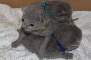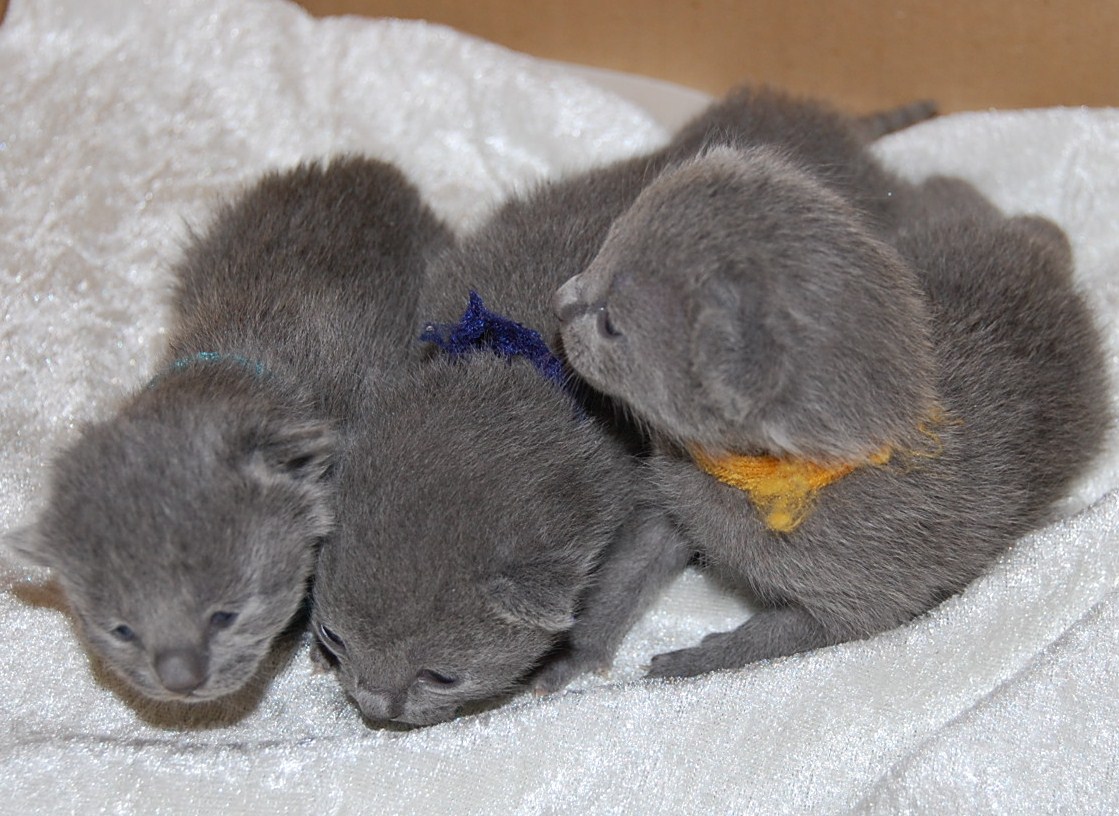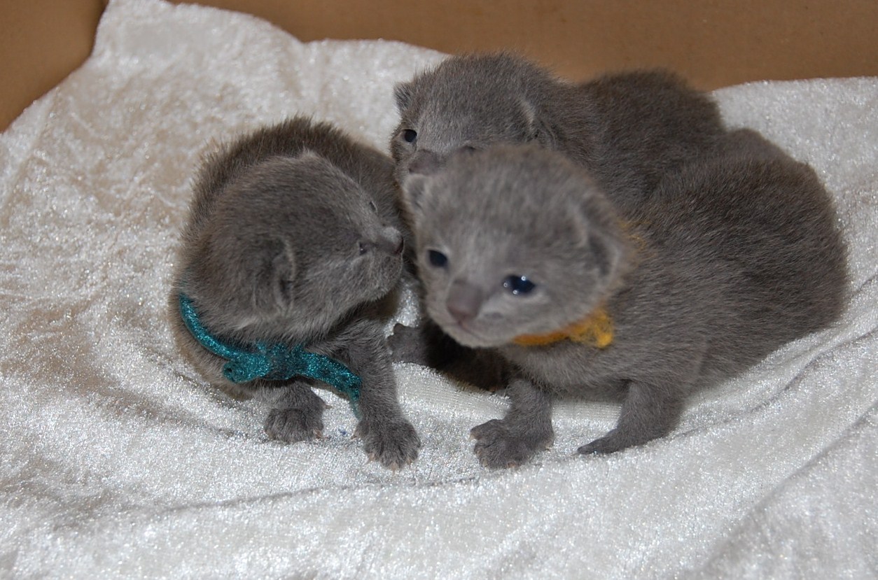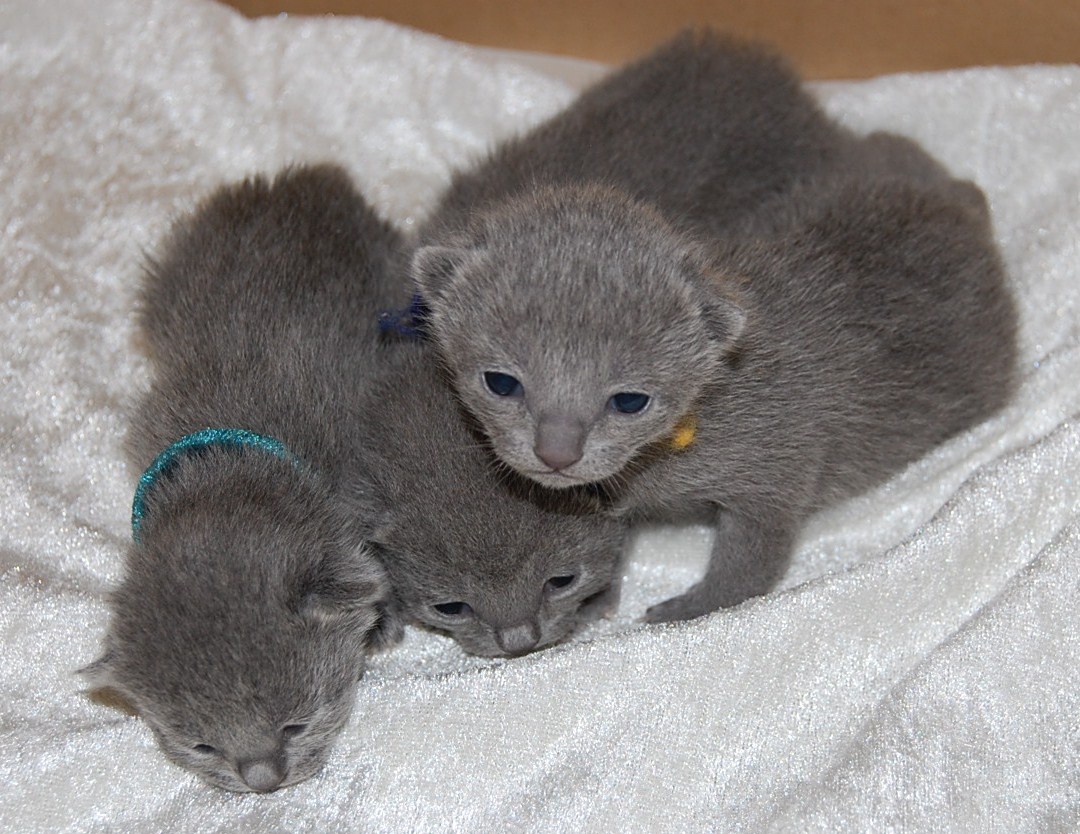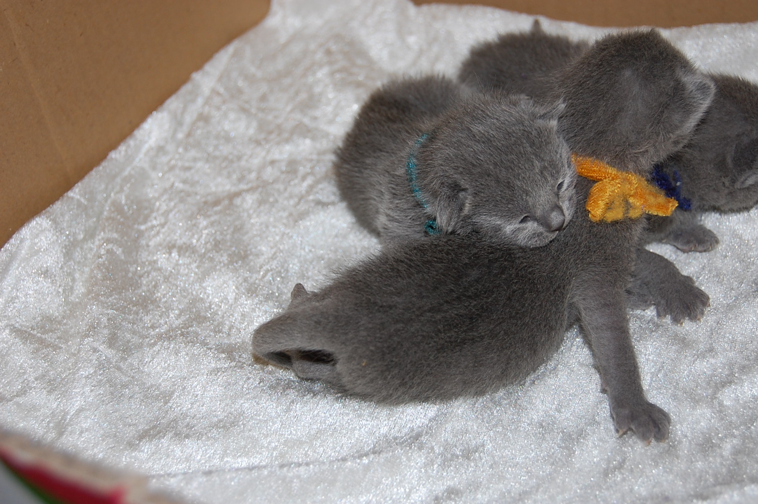 var ved nærmere eftersyn hvad Xantippes kuld bestod af, så hvis der er nogen der ønsker sig en dejlig lille russer frøken om ca 10 uger, så skal de nok være lidt hurtige med at henvende sig, for interessen for dette kuld har været meget stor. Jeg har jo ikke så stor erfaring i at se forskel på nyfødte killinger, så først blev killingerne sat på killingelisten som værende tre hanner og det indrømmer jeg gerne var en fejl, for jeg ved jo godt at selv erfarne opdrættere af og til kan tage fejl. Dette kuld skal hedde noget med E og jeg har valgt at den der har gul snor skal hedde : Early Star Light. Blå snor skal hedde Easy To Love og grøn snor Enjoy the world.