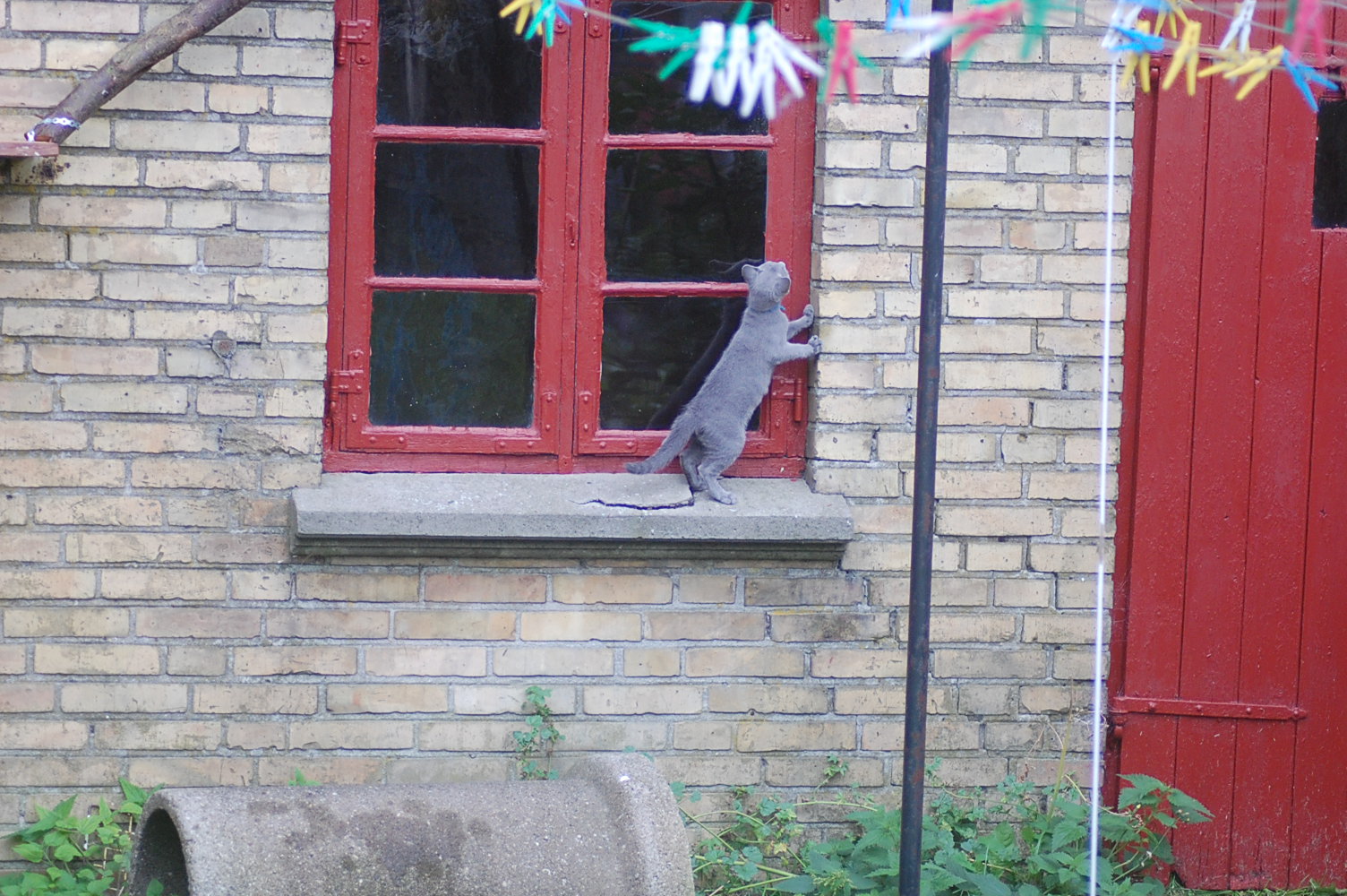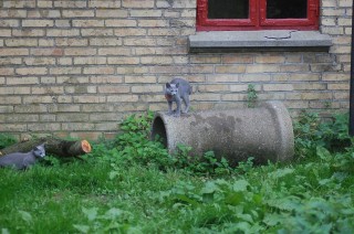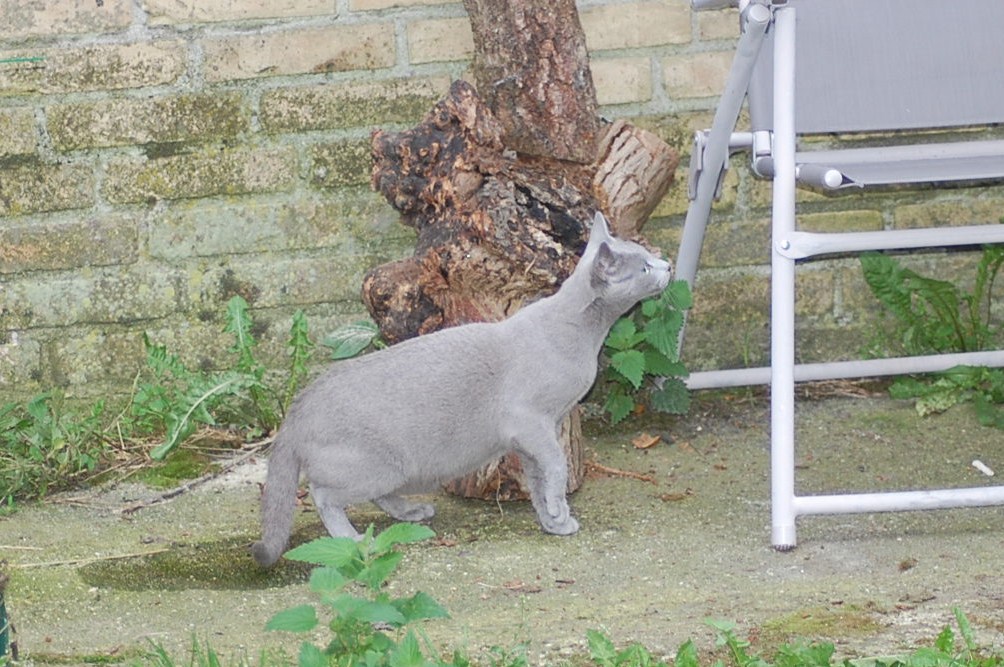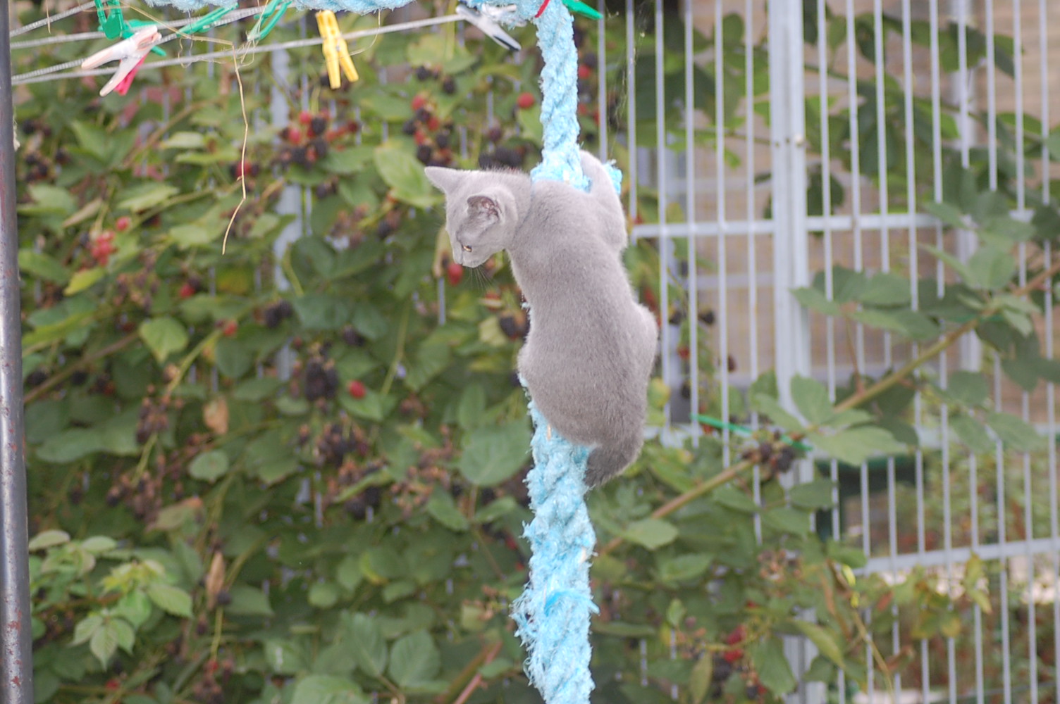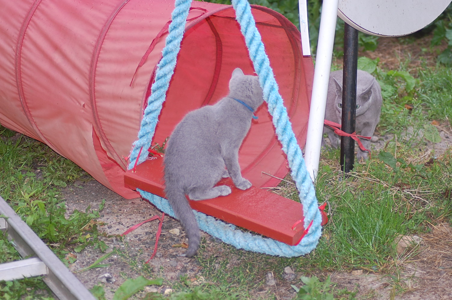 Det er jo så stor en fornøjelse for mig at se mine katte lege og klatre rundt på den legeplads jeg har lavet til dem, at jeg bliver ved med at finde gode motiver at fotografere. Det har taget nogle dage før kattene har fundet ud af at man kan klatre op af sådan noget kraftigt tovværk, men da først èn af dem havde prøvet, så fulgte de andre hurtigt efter. Det er tilsyneladende meget mere vanskeligt for dem at finde ud af hvordan man kommer ned igen , og Cindy stillede sig op og mjavede højlydt, til jeg kom og reddede hende. Jeg har jo planlagt en nemmere måde til dem at komme ned igen, men de kan jo ikke vente til jeg er færdig med at bygge den.