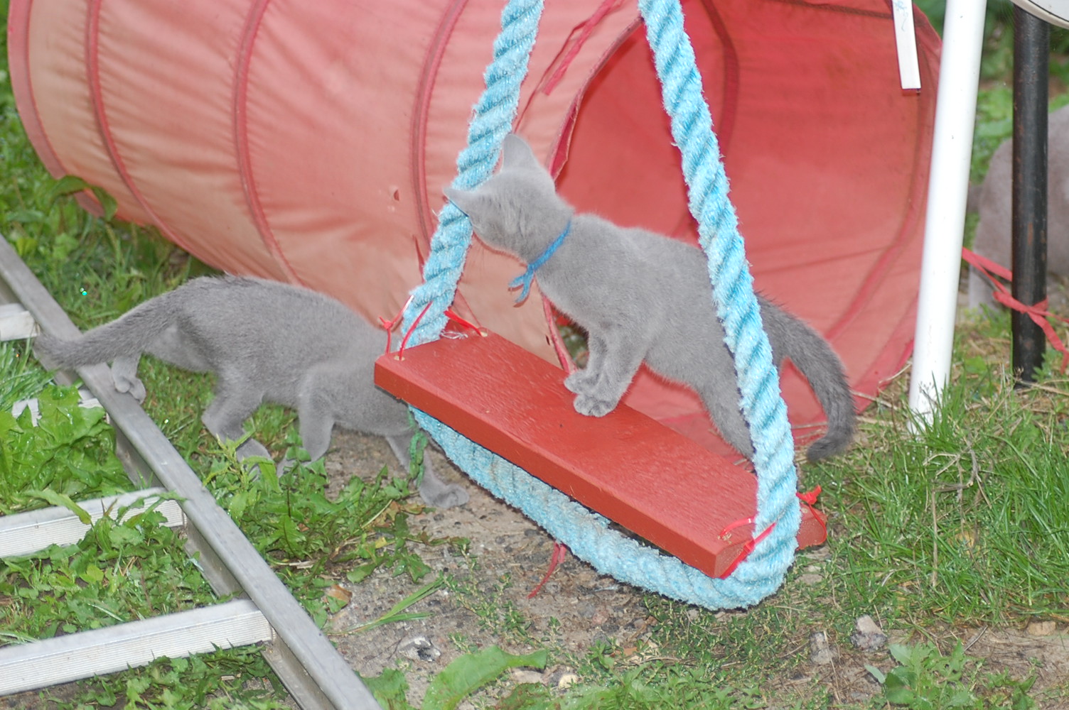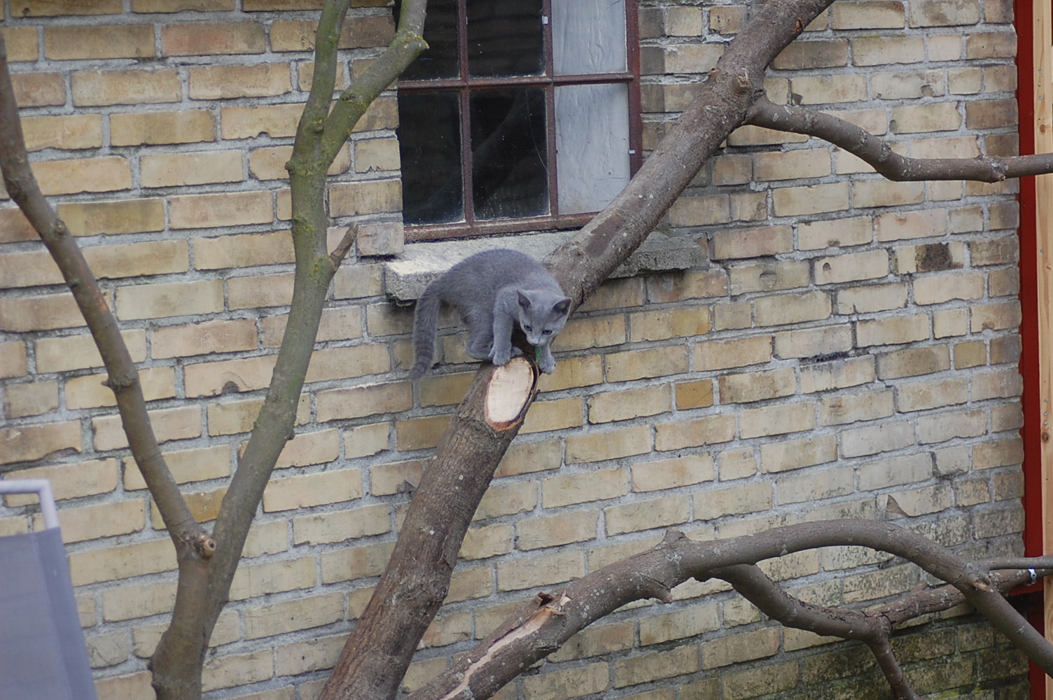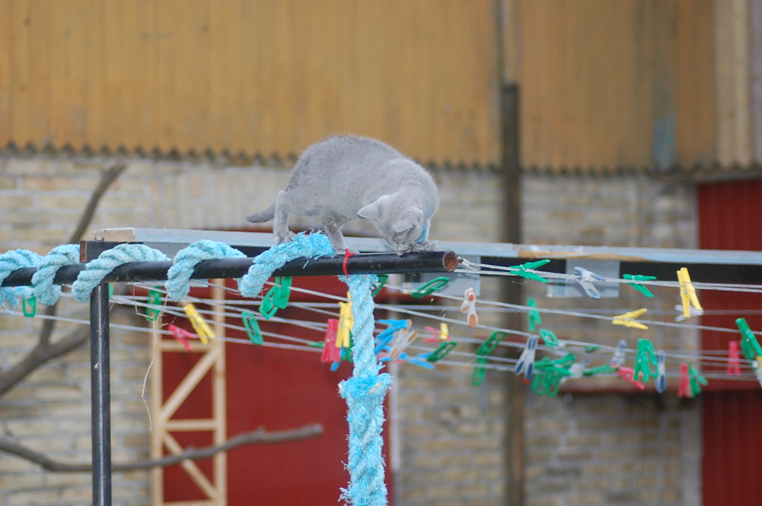 Det er jo så stor en fornøjelse for mig at se mine katte lege og klatre rundt på den legeplads jeg har lavet til dem, at jeg bliver ved med at finde gode motiver at fotografere. Det har taget nogle dage før kattene har fundet ud af at man kan klatre op af sådan noget kraftigt tovværk, men da først èn af dem havde prøvet, så fulgte de andre hurtigt efter. Det er tilsyneladende meget mere vanskeligt for dem at finde ud af hvordan man kommer ned igen , og Cindy stillede sig op og mjavede højlydt, til jeg kom og reddede hende. Jeg har jo planlagt en nemmere måde til dem at komme ned igen, men de kan jo ikke vente til jeg er færdig med at bygge den.