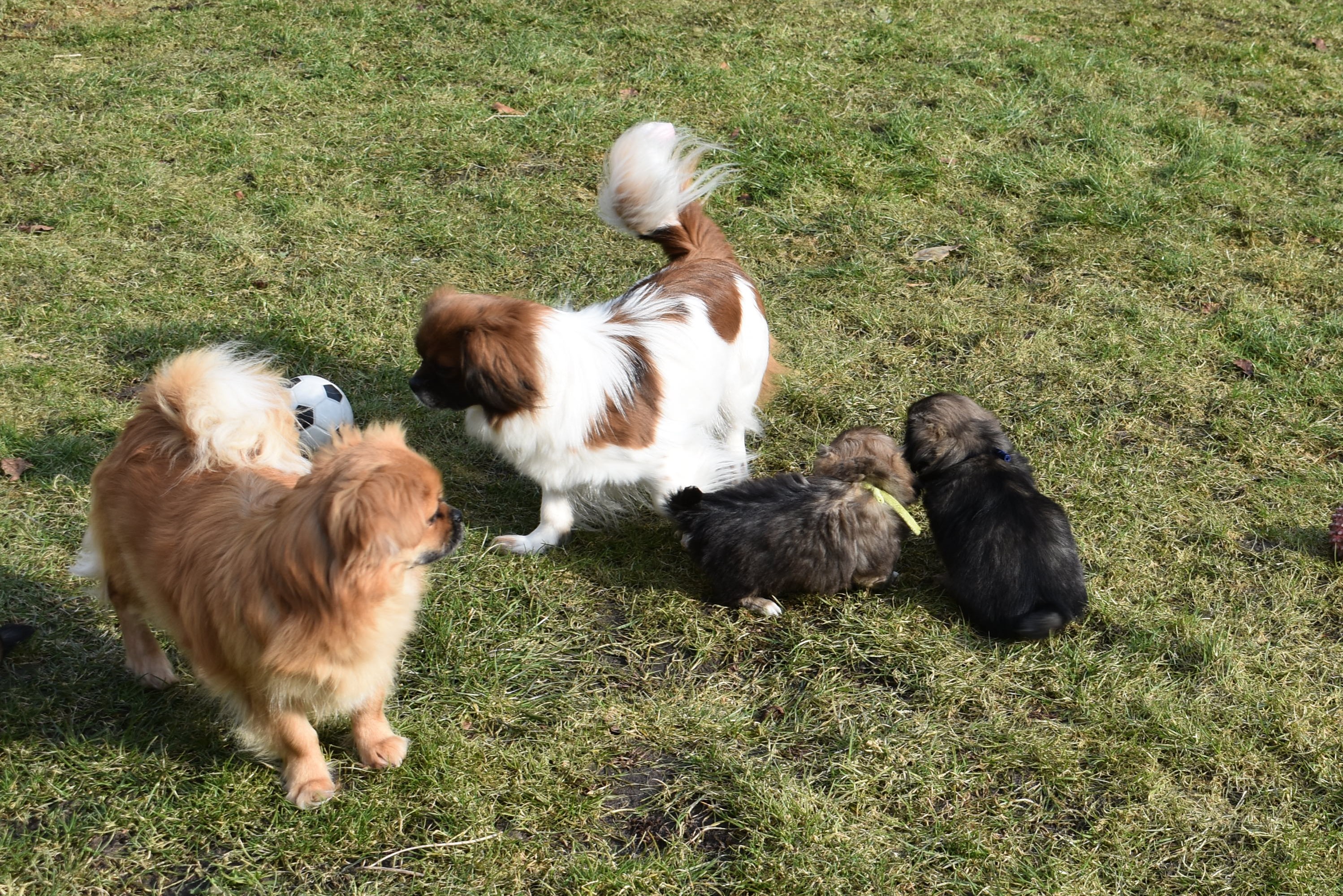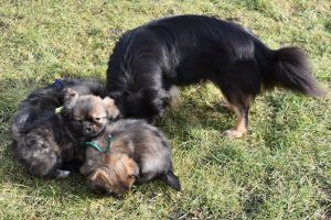 Nu blev det endeligt solskin og sneen er næsten helt væk igen og dermed er der en mulighed for at tage rimelige billeder af Bonnies hvalpe udenfor. Det er dejligt med sol og luften er absolut også lunere, så de små kan være ude lidt længere. Jeg synes jo de er dygtige til at få tisset når de er ude, men de må jo bestemt ikke komme til at fryse, så på blæsende dage er det meget hurtigt ud og hurtigt ind igen. Bonnie er jo sådan en super mor, så hvis hvalpene vil have en tår mælk så får de lov til det. Det er bare lidt sjovt at se når de søger ind under maven på en af de andre voksne tæver, så flytter tæven sig hurtigt lidt væk. Bonnie har jo altid været sådan at hvis andre tævers hvalpe ville have en tår mælk, så havde Bonnie altid plads til ekstra hvalpe hvis hun selv havde hvalpe i samme alder.
