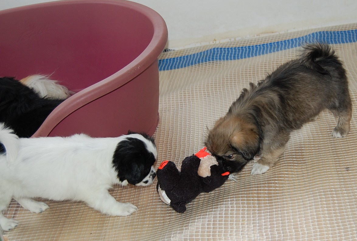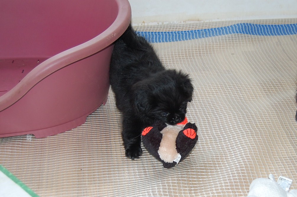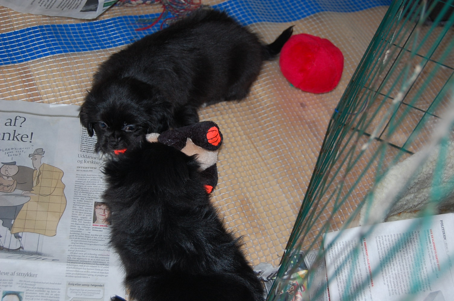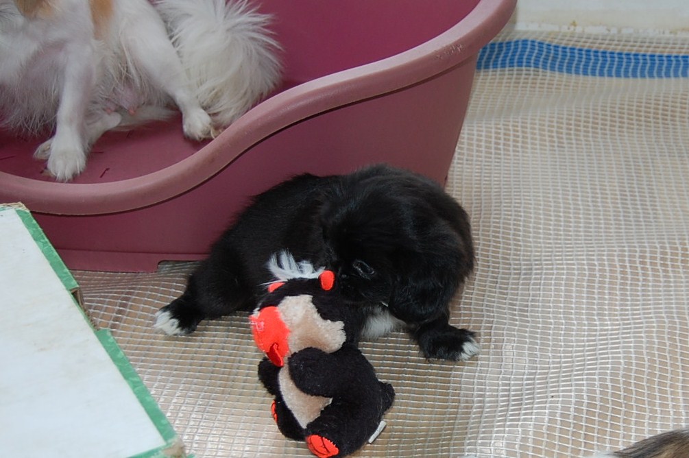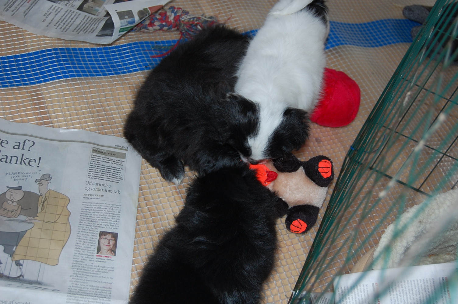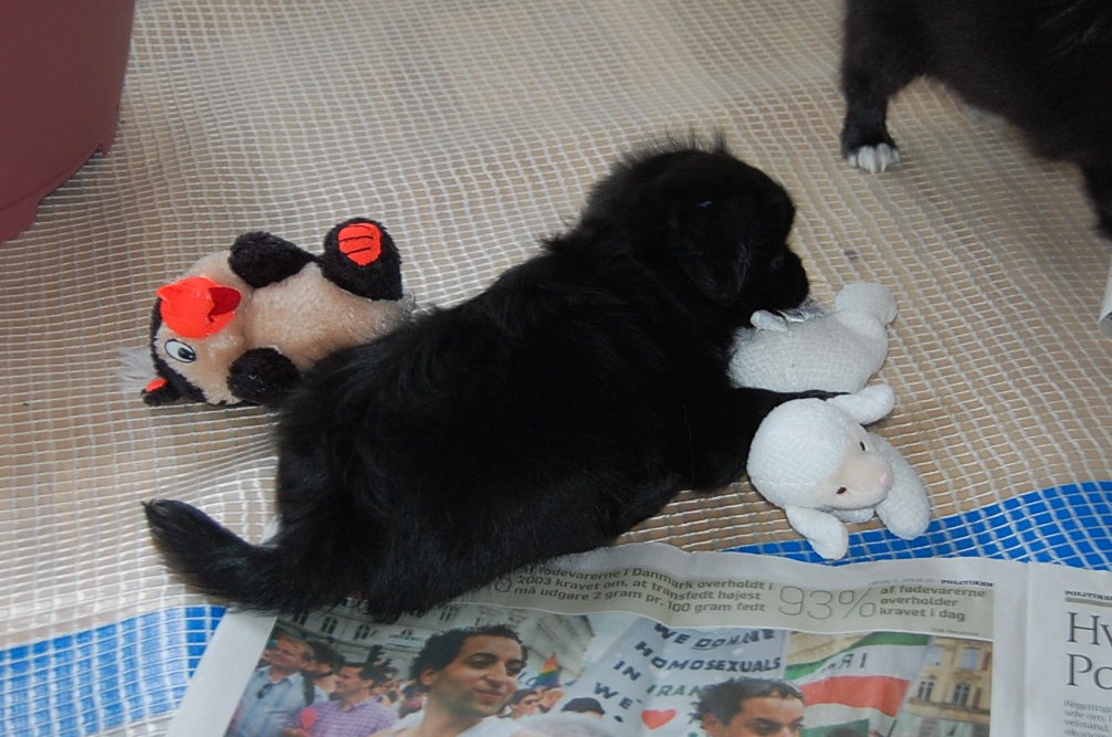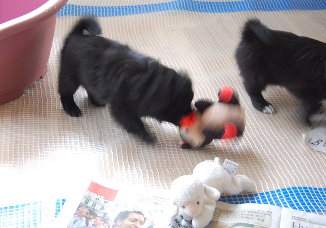i hvalpegården. I går fik hvalpene en posefuld bamser og babylegetøj ind i hvalpegården og som man kan se på billederne var der især en af bamserne de syntes var interessant. De ting der kunne sige lyde, såsom pive og rasle lyde var også ganske spændende. Ellers så er de jo blevet store nu og har fået godt styr på bevægelserne, chip har de også fået, og i næste uge skal de til dyrlæge til sundhedstjek og vac. Der er kun en af hvalpene der er til salg og det er pragtfulde sorte Joy, der er en rigtig lækker sort tævehvalp. Hun hedder Askim`s Mi-O Jada Joy og hun har den rigtig dybe sorte farve og en lækker pelskvalitet. Hendes bid er også helt perfekt og hun er en kærlig og godt socialiseret hvalp, så hun venter bare på at den helt rigtige familie skal få øje på hende.