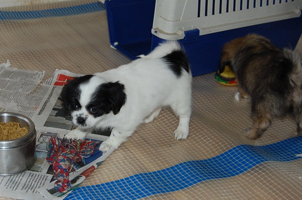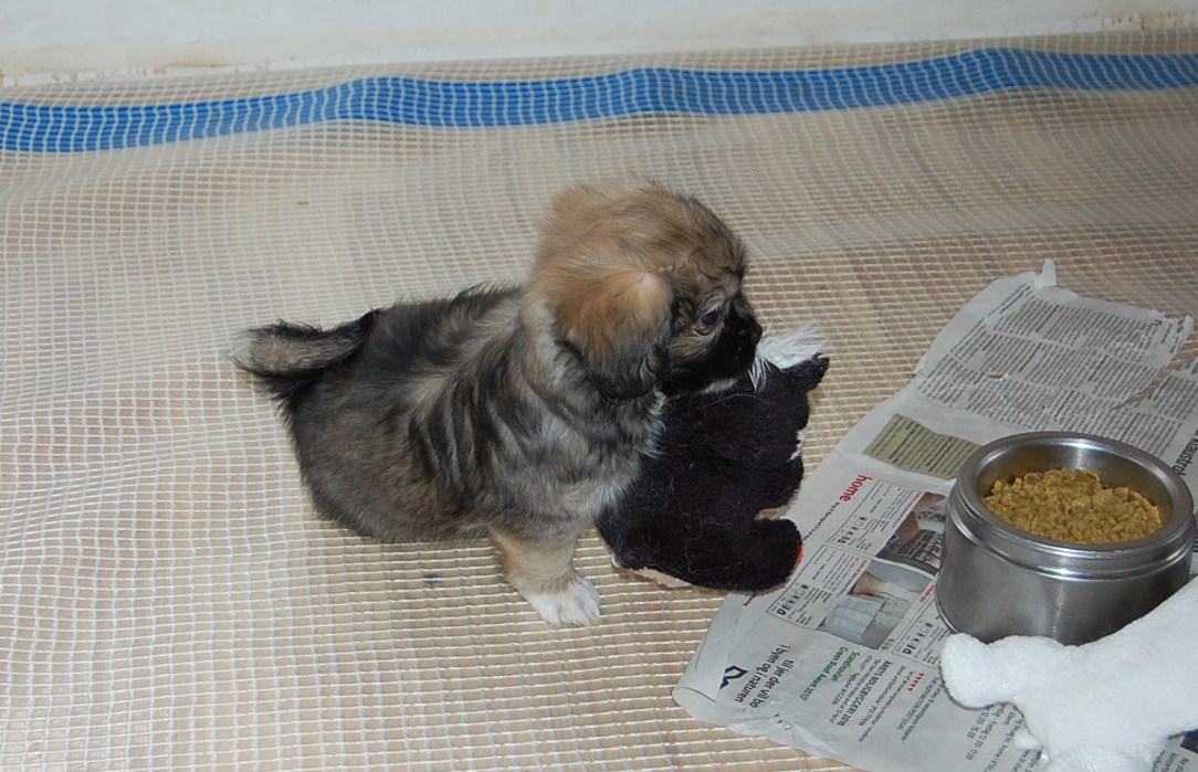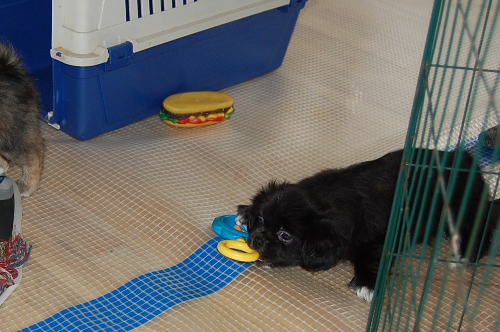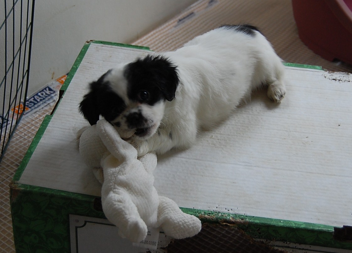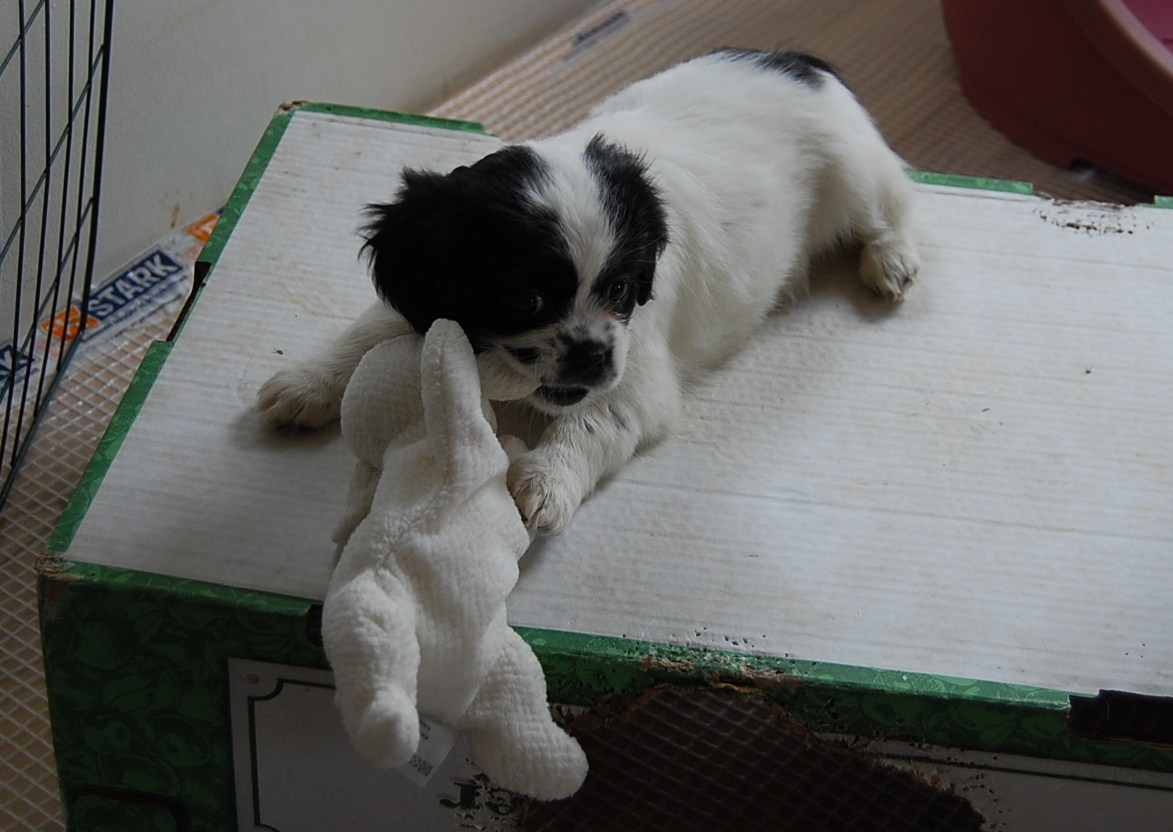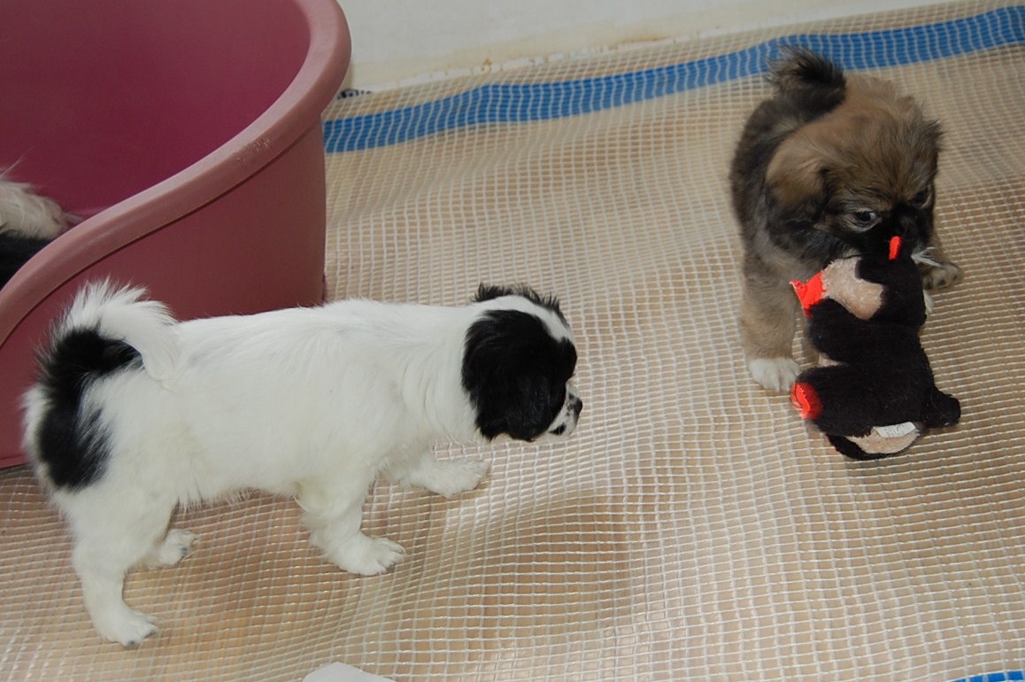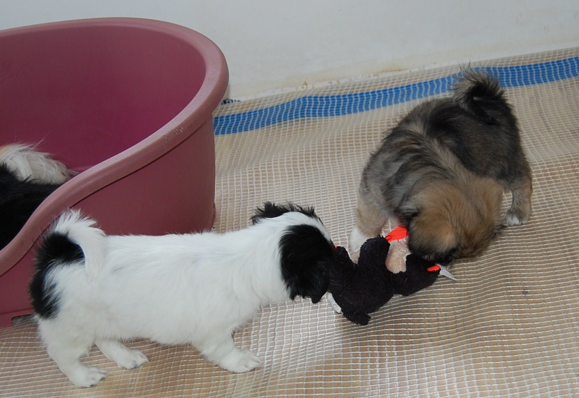 i hvalpegården. I går fik hvalpene en posefuld bamser og babylegetøj ind i hvalpegården og som man kan se på billederne var der især en af bamserne de syntes var interessant. De ting der kunne sige lyde, såsom pive og rasle lyde var også ganske spændende. Ellers så er de jo blevet store nu og har fået godt styr på bevægelserne, chip har de også fået, og i næste uge skal de til dyrlæge til sundhedstjek og vac. Der er kun en af hvalpene der er til salg og det er pragtfulde sorte Joy, der er en rigtig lækker sort tævehvalp. Hun hedder Askim`s Mi-O Jada Joy og hun har den rigtig dybe sorte farve og en lækker pelskvalitet. Hendes bid er også helt perfekt og hun er en kærlig og godt socialiseret hvalp, så hun venter bare på at den helt rigtige familie skal få øje på hende.