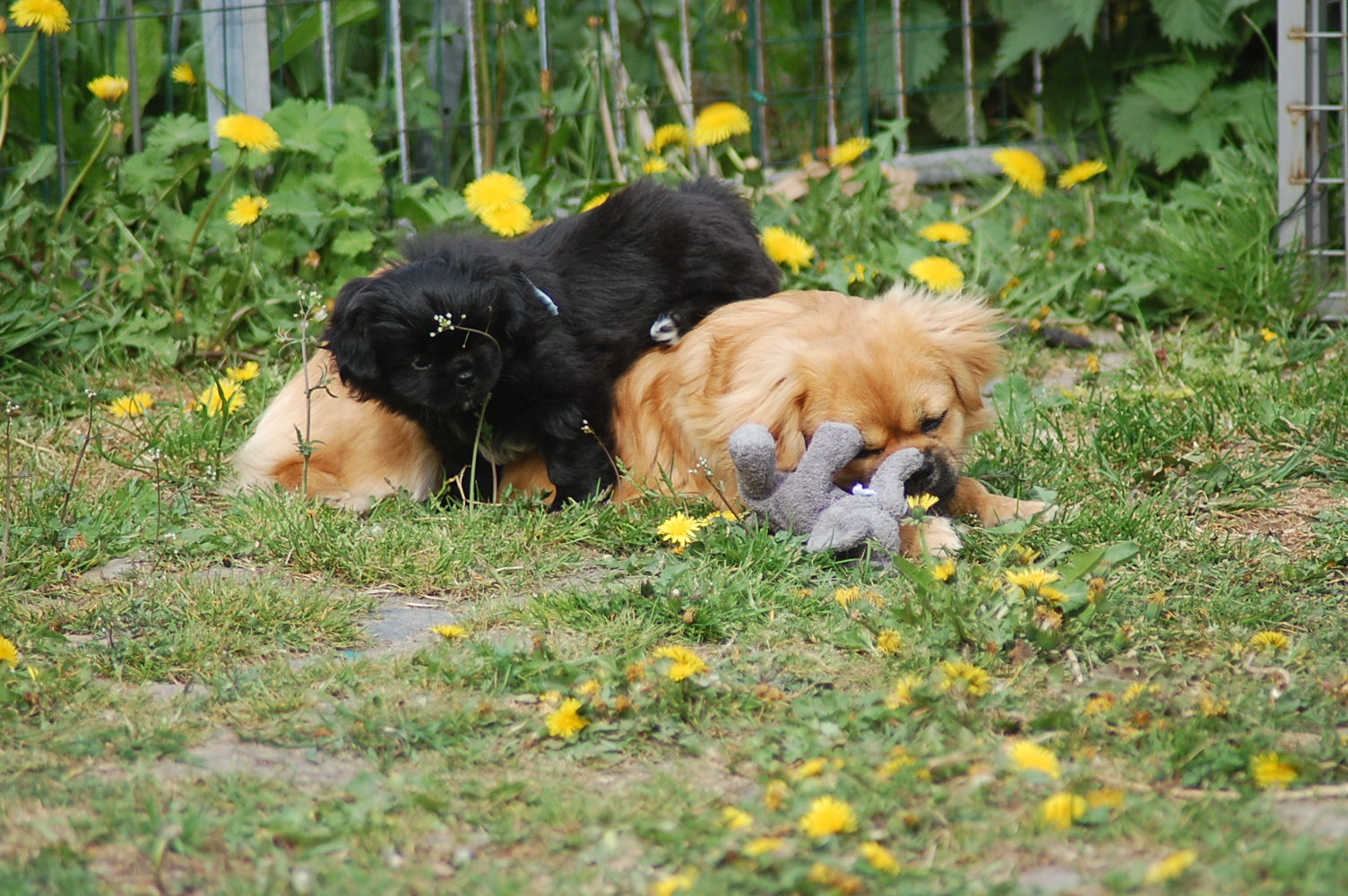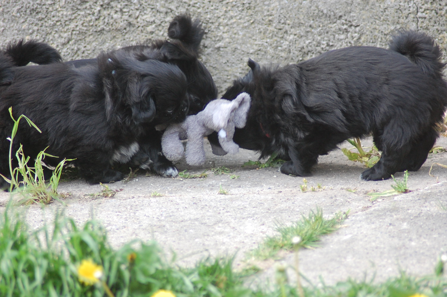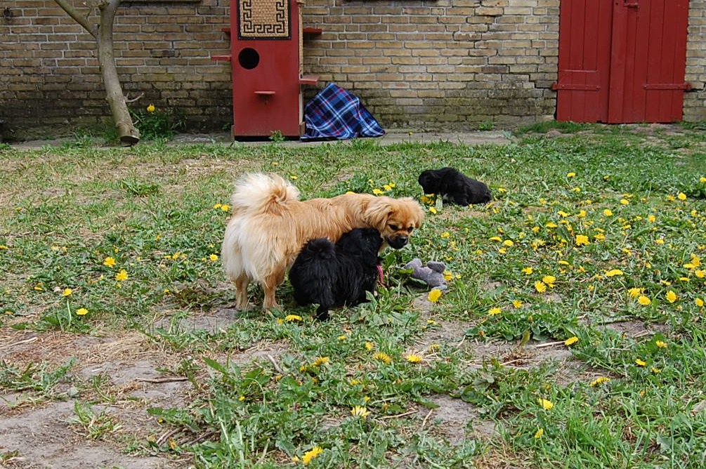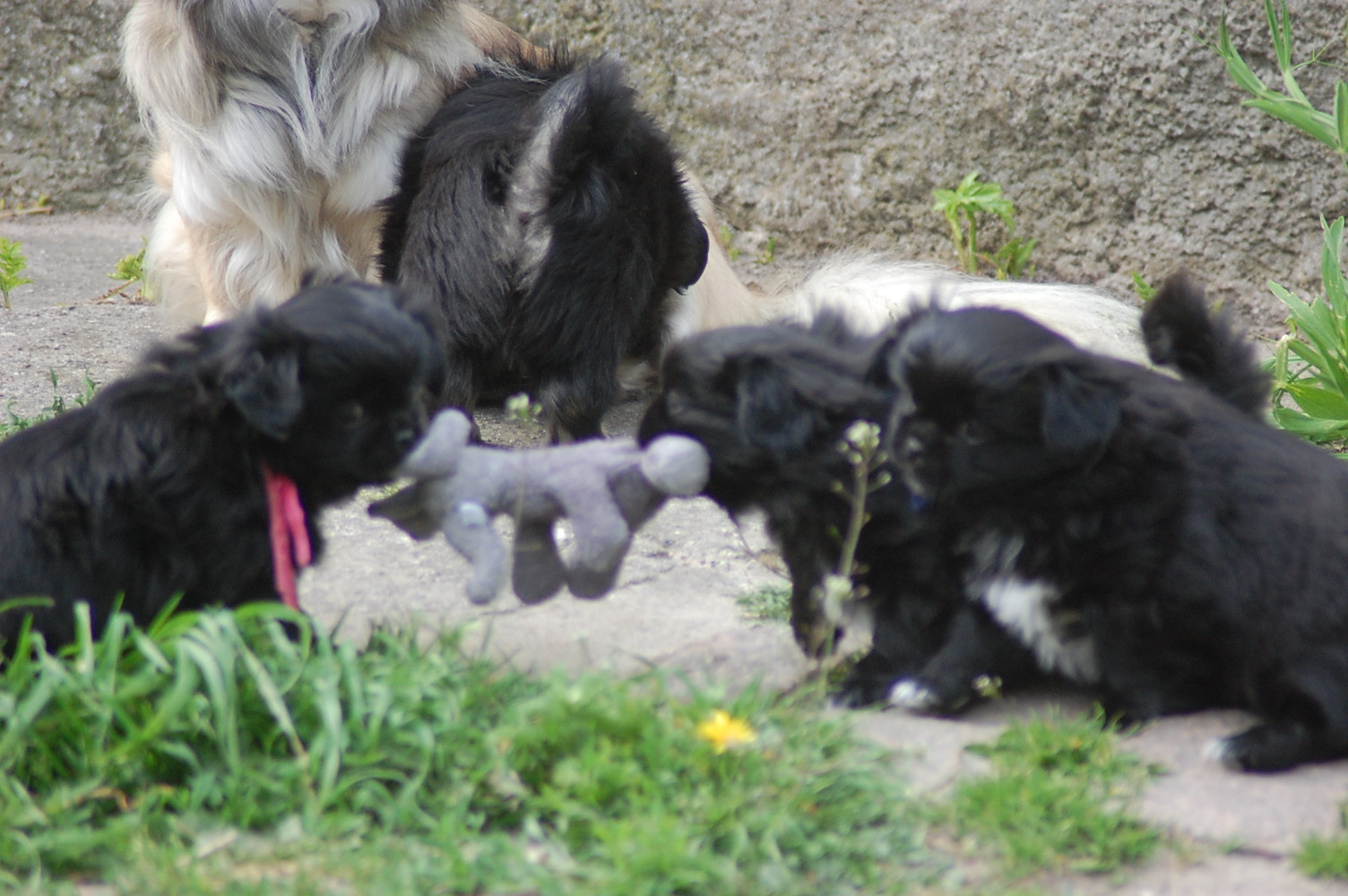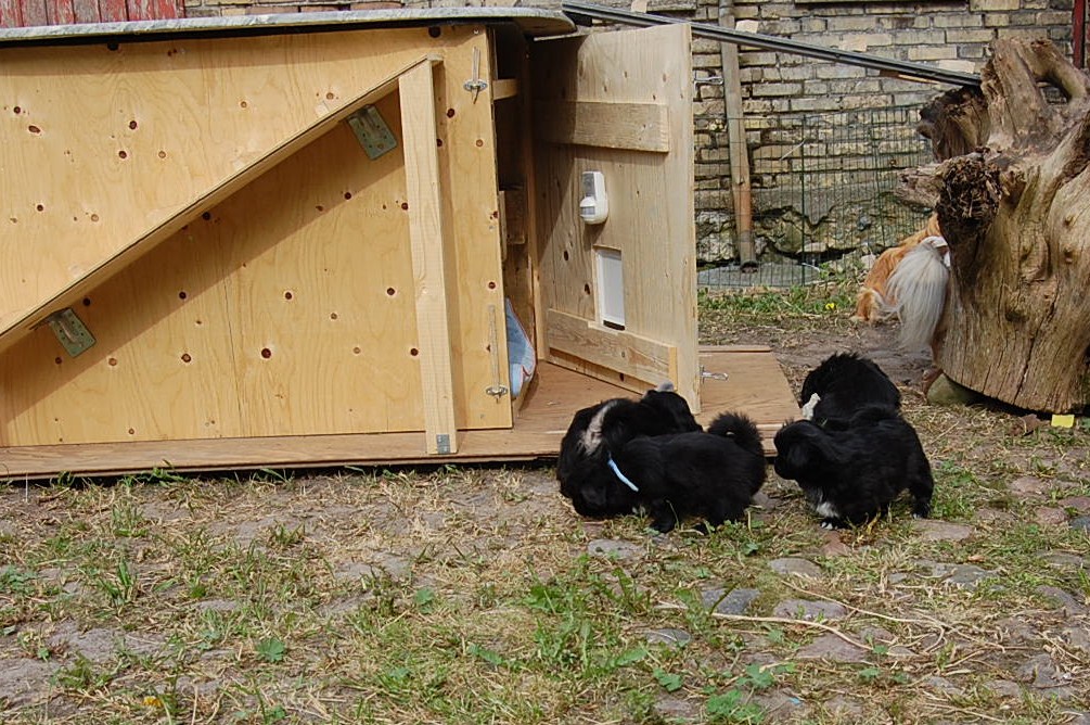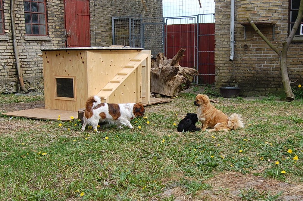var bare et hit, da hvalpene fik nogle tøjdyr med ud på gårdspladsen i dag. Det nye hundehus jeg har bygget, ja der løb fantasien nok lidt af med mig, for dels lavede jeg et vindue , så hundene kan se ud af indkørslen, ( og hvalpene synes at det er sjovt at løbe hen og kigge ind af vinduet for at se om der er hunde inde i huset ) dels blev der monteret kattelem så de kan ligge derinde uden træk. Der blev monteret en gangbro og trapper så hundene nemt kan komme op på taget ( det består af en sten plade der bliver varmet op af solen om dagen og som holder varmen langt ud på aftenen. Hundene elsker at ligge på den ) og den vildeste idè er nok at jeg monterede en sensor lygte der tænder når hundene bevæger sig derinde. Den monterede jeg fordi det var lidt svært at se om der var nogle hunde der gemte sig inde i huset når det var blevet mørkt ! Jeg kan ikke regne ud hvorfor de andre legeting og tøjdyr ikke var interessante, men både hvalpene og unge P`zazz Ruby syntes, at det var den lille grå elefant der var sjov at lege med i dag.Det var som sædvanlig også sjov at lege med de andre hunde, og de er så tålmodige med de små livlige krudtugler, der nu sover som små trætte englebasser ude i køkkenet.