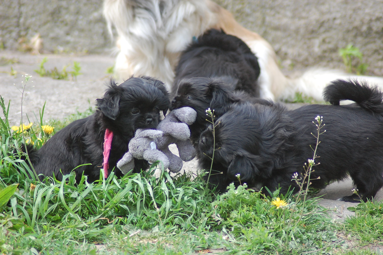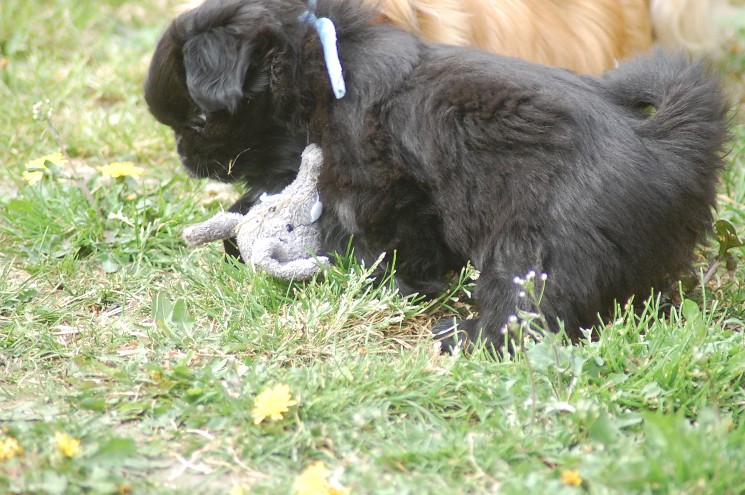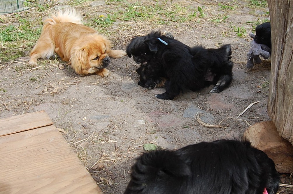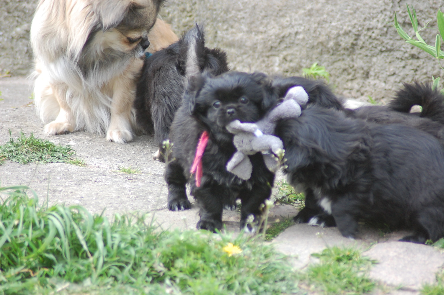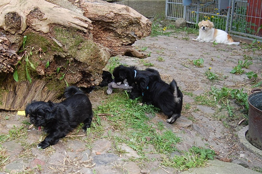 var bare et hit, da hvalpene fik nogle tøjdyr med ud på gårdspladsen i dag. Det nye hundehus jeg har bygget, ja der løb fantasien nok lidt af med mig, for dels lavede jeg et vindue , så hundene kan se ud af indkørslen, ( og hvalpene synes at det er sjovt at løbe hen og kigge ind af vinduet for at se om der er hunde inde i huset ) dels blev der monteret kattelem så de kan ligge derinde uden træk. Der blev monteret en gangbro og trapper så hundene nemt kan komme op på taget ( det består af en sten plade der bliver varmet op af solen om dagen og som holder varmen langt ud på aftenen. Hundene elsker at ligge på den ) og den vildeste idè er nok at jeg monterede en sensor lygte der tænder når hundene bevæger sig derinde. Den monterede jeg fordi det var lidt svært at se om der var nogle hunde der gemte sig inde i huset når det var blevet mørkt ! Jeg kan ikke regne ud hvorfor de andre legeting og tøjdyr ikke var interessante, men både hvalpene og unge P`zazz Ruby syntes, at det var den lille grå elefant der var sjov at lege med i dag.Det var som sædvanlig også sjov at lege med de andre hunde, og de er så tålmodige med de små livlige krudtugler, der nu sover som små trætte englebasser ude i køkkenet.