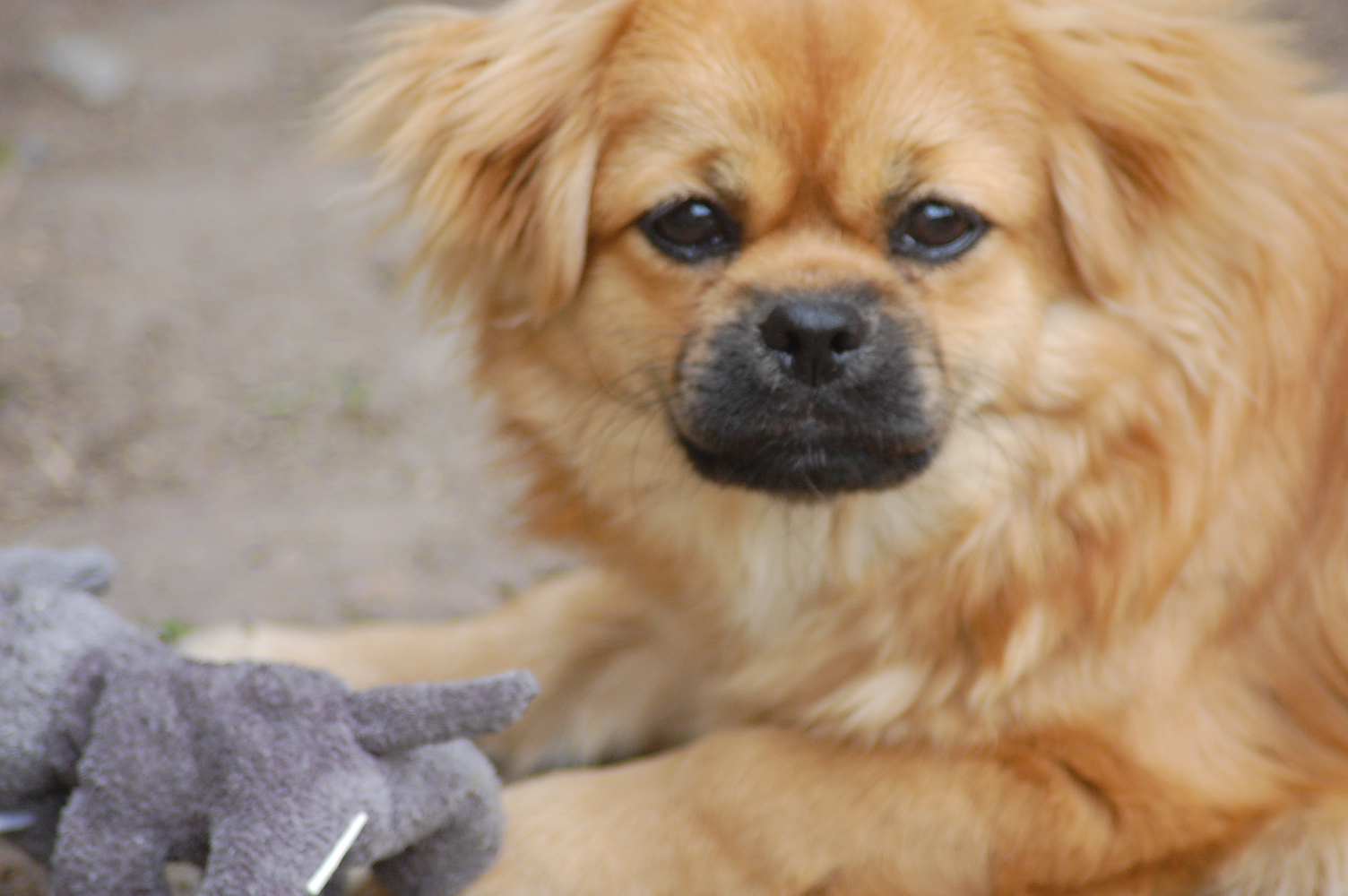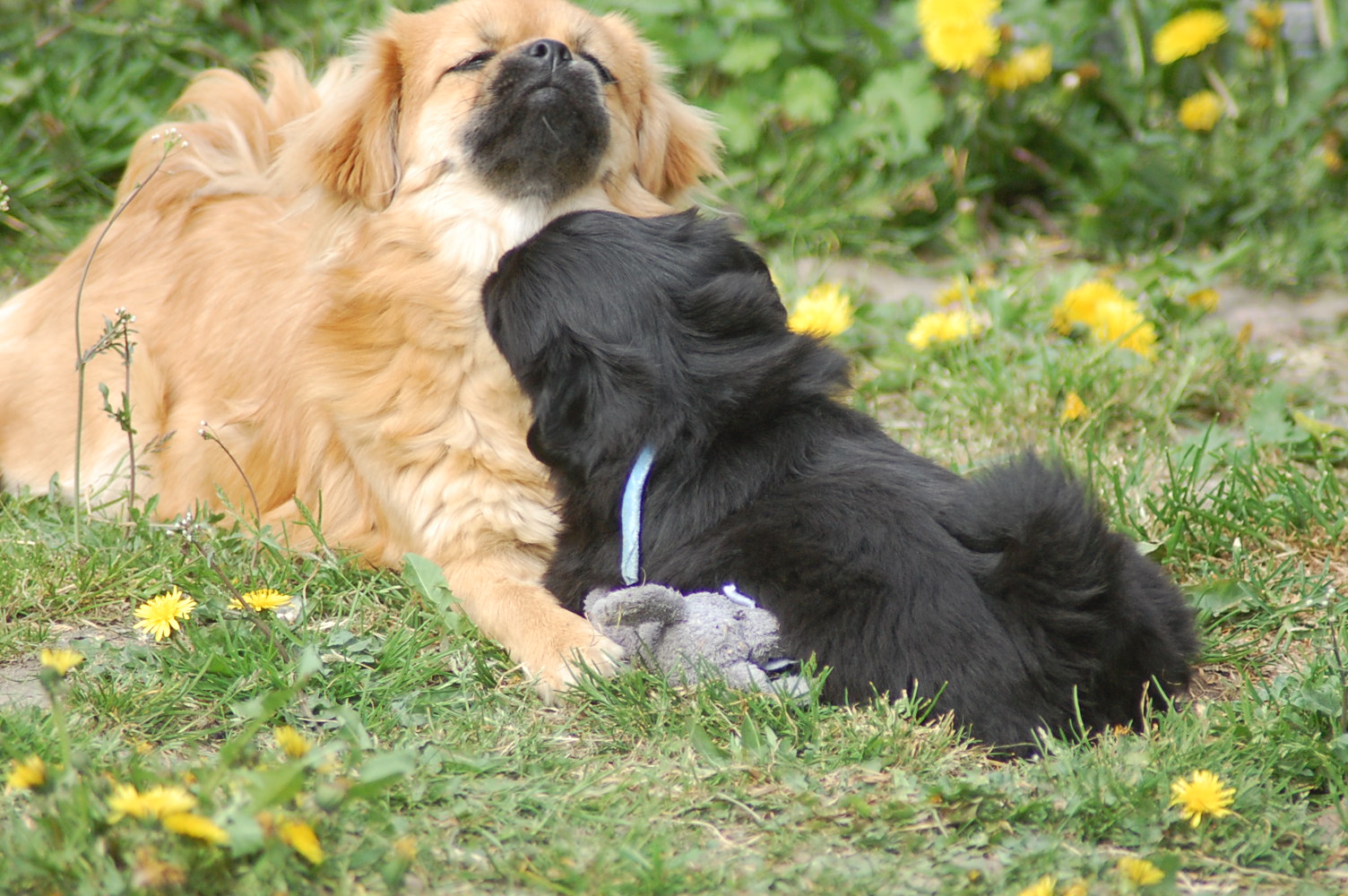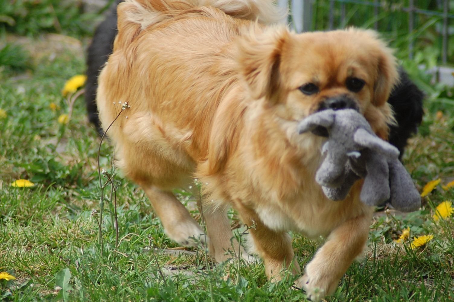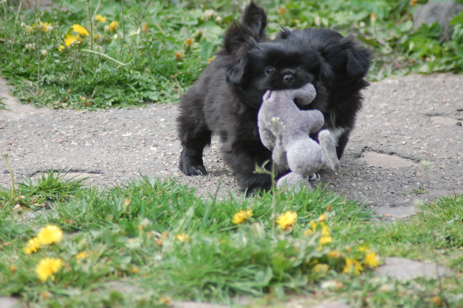 var bare et hit, da hvalpene fik nogle tøjdyr med ud på gårdspladsen i dag. Det nye hundehus jeg har bygget, ja der løb fantasien nok lidt af med mig, for dels lavede jeg et vindue , så hundene kan se ud af indkørslen, ( og hvalpene synes at det er sjovt at løbe hen og kigge ind af vinduet for at se om der er hunde inde i huset ) dels blev der monteret kattelem så de kan ligge derinde uden træk. Der blev monteret en gangbro og trapper så hundene nemt kan komme op på taget ( det består af en sten plade der bliver varmet op af solen om dagen og som holder varmen langt ud på aftenen. Hundene elsker at ligge på den ) og den vildeste idè er nok at jeg monterede en sensor lygte der tænder når hundene bevæger sig derinde. Den monterede jeg fordi det var lidt svært at se om der var nogle hunde der gemte sig inde i huset når det var blevet mørkt ! Jeg kan ikke regne ud hvorfor de andre legeting og tøjdyr ikke var interessante, men både hvalpene og unge P`zazz Ruby syntes, at det var den lille grå elefant der var sjov at lege med i dag.Det var som sædvanlig også sjov at lege med de andre hunde, og de er så tålmodige med de små livlige krudtugler, der nu sover som små trætte englebasser ude i køkkenet.