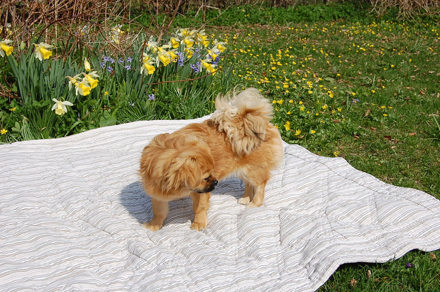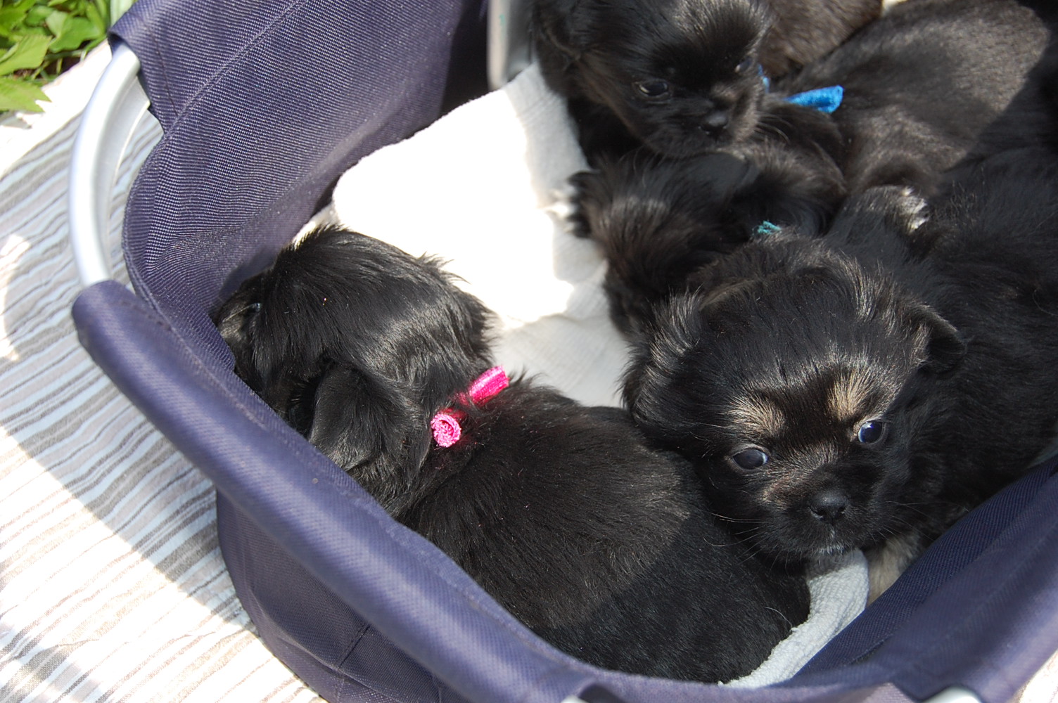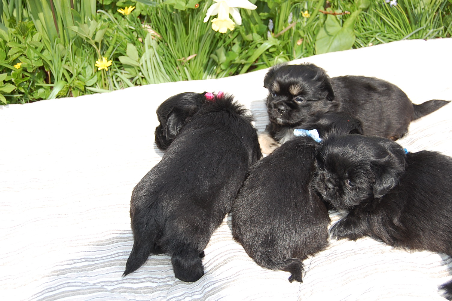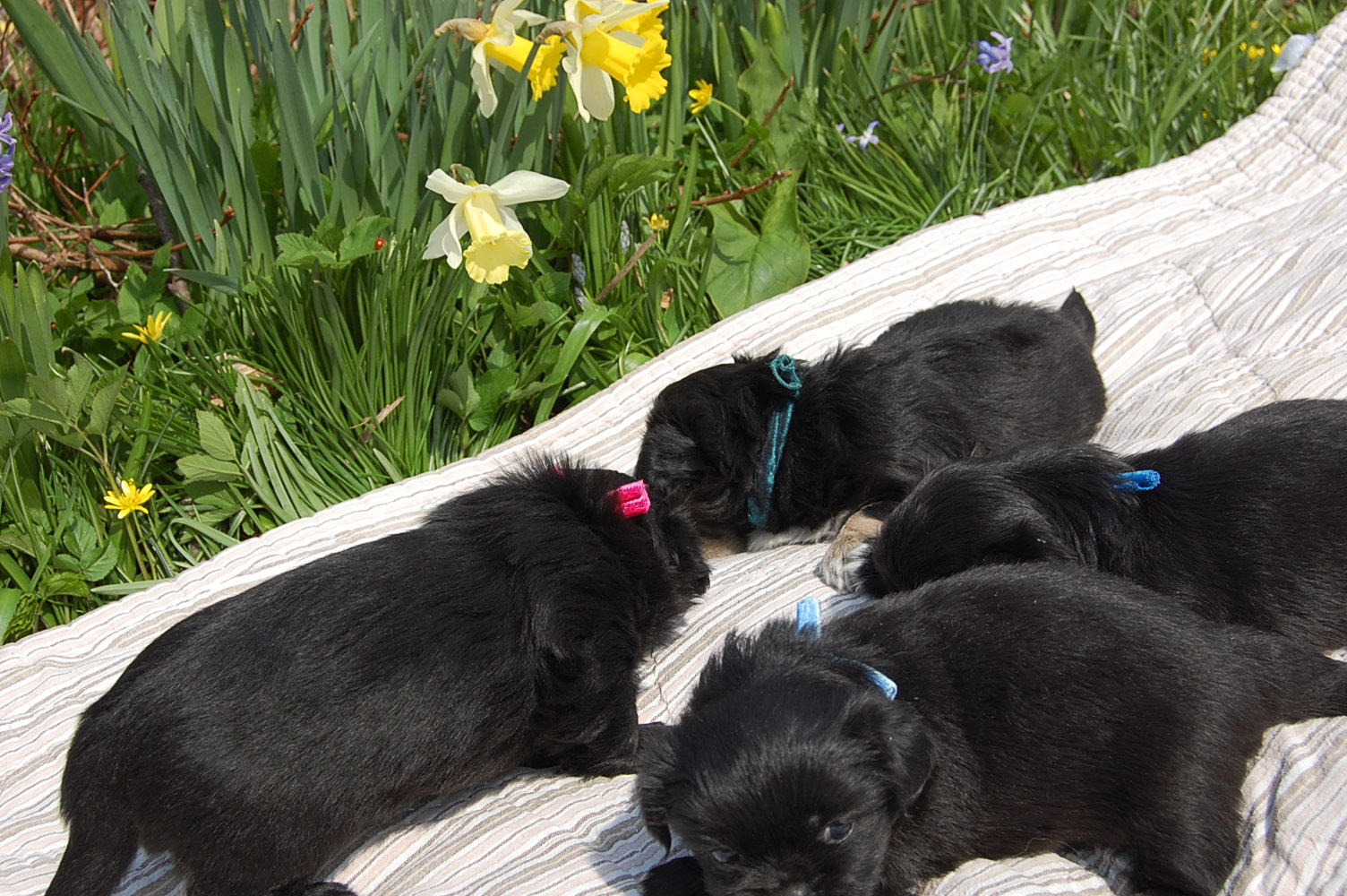 I dag var det så dejligt vejr at hvalpene kom et par minn med ud i haven for at forsøge at få nogle gode billeder af dem. De er jo små endnu og når man er en lille hundehvalp så er det godt at have nogle søskende at søge tryghed hos, når mor har travlt med at finde ud af om der er sket noget nyt herude, siden hun var her sidst. Ruby var med derude, hun er nemlig lige begyndt på sin første løbetid og derfor passer jeg rigtig meget på hende.