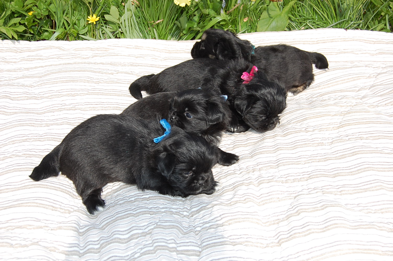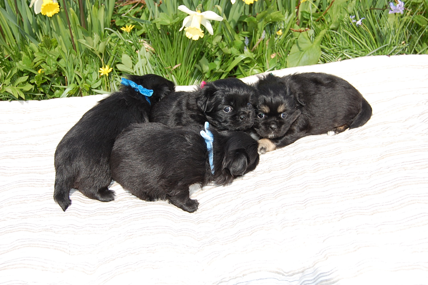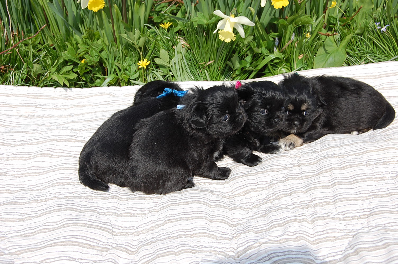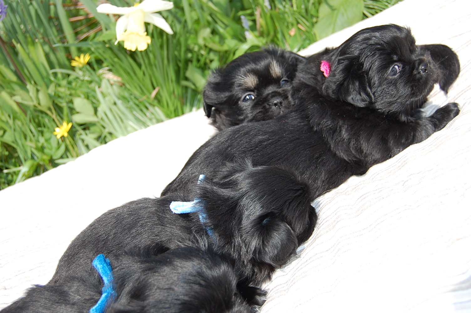 I dag var det så dejligt vejr at hvalpene kom et par minn med ud i haven for at forsøge at få nogle gode billeder af dem. De er jo små endnu og når man er en lille hundehvalp så er det godt at have nogle søskende at søge tryghed hos, når mor har travlt med at finde ud af om der er sket noget nyt herude, siden hun var her sidst. Ruby var med derude, hun er nemlig lige begyndt på sin første løbetid og derfor passer jeg rigtig meget på hende.