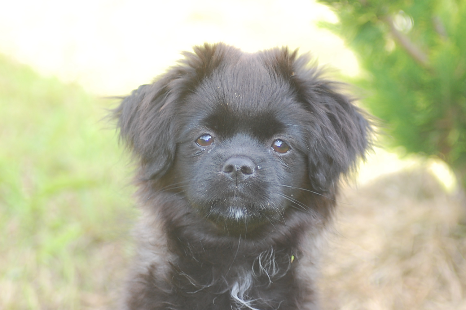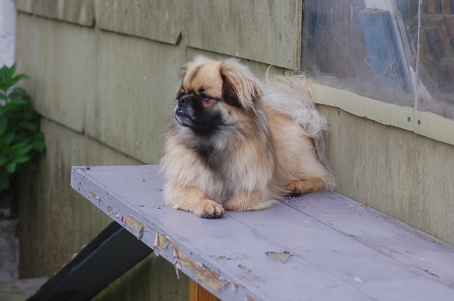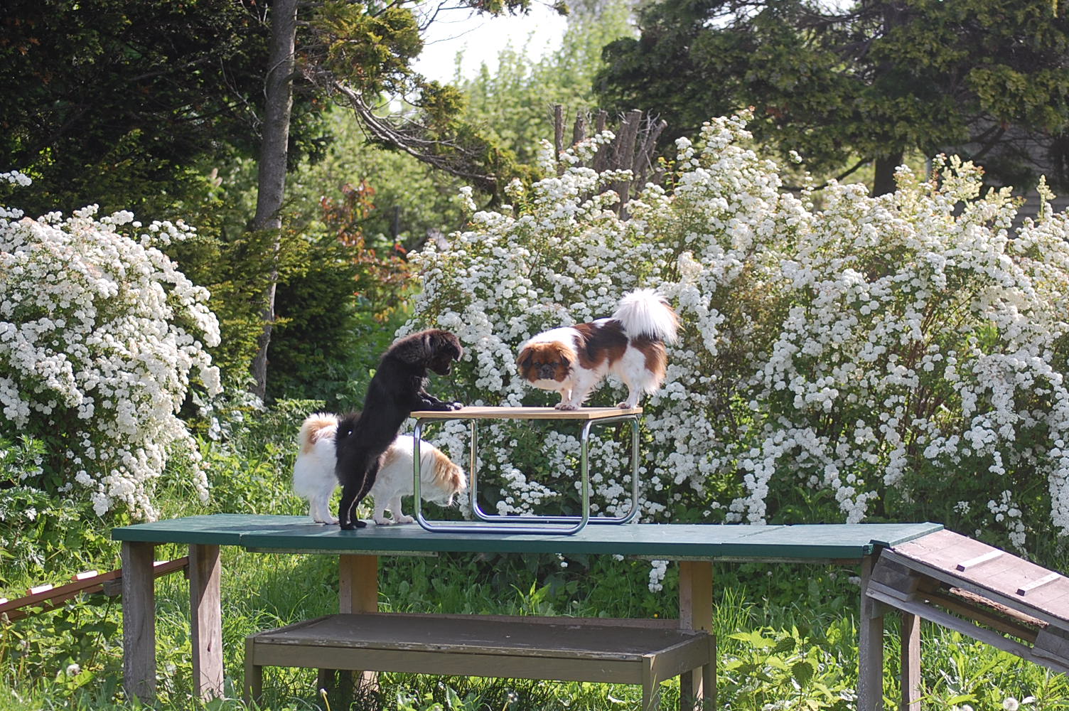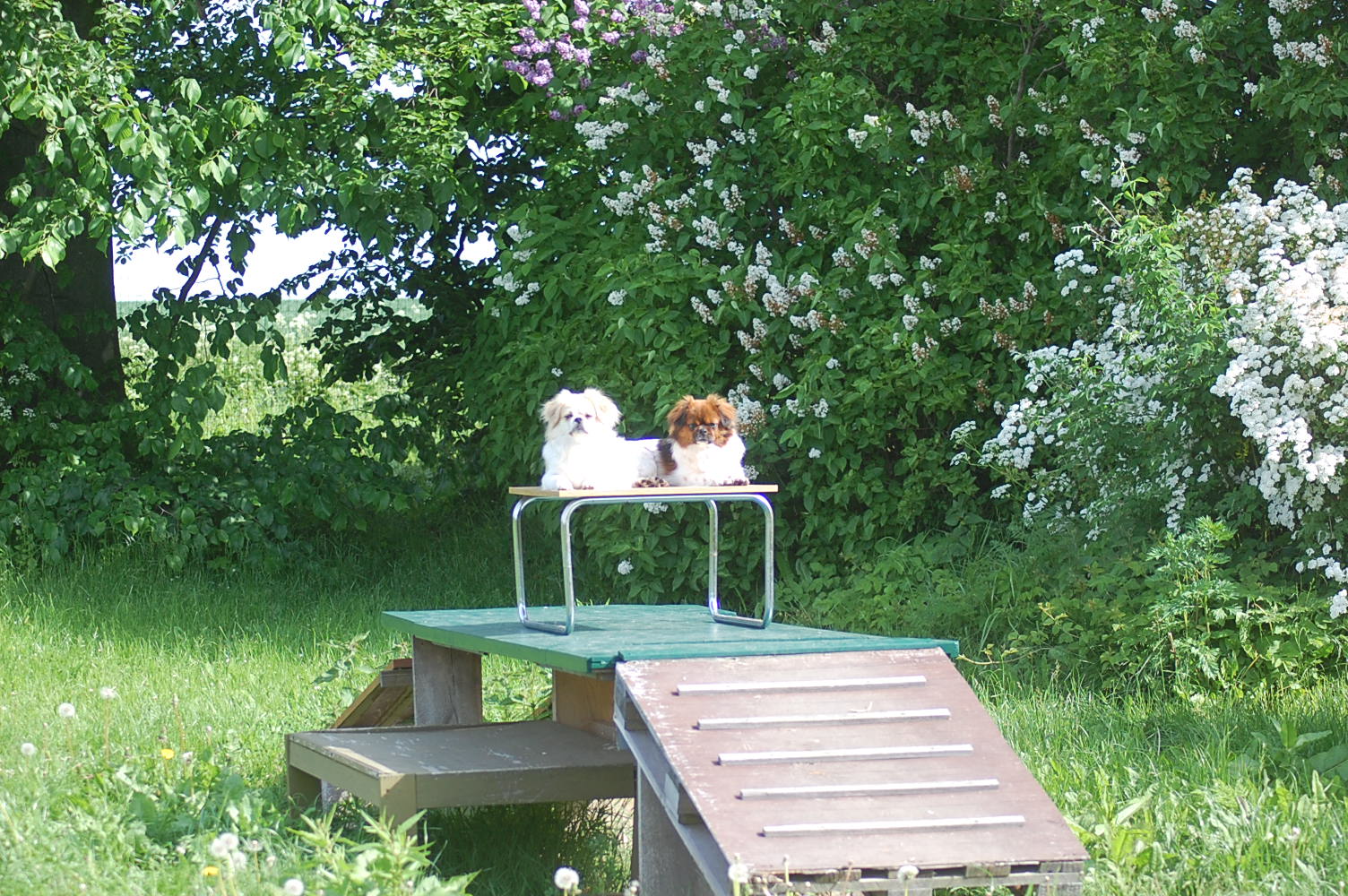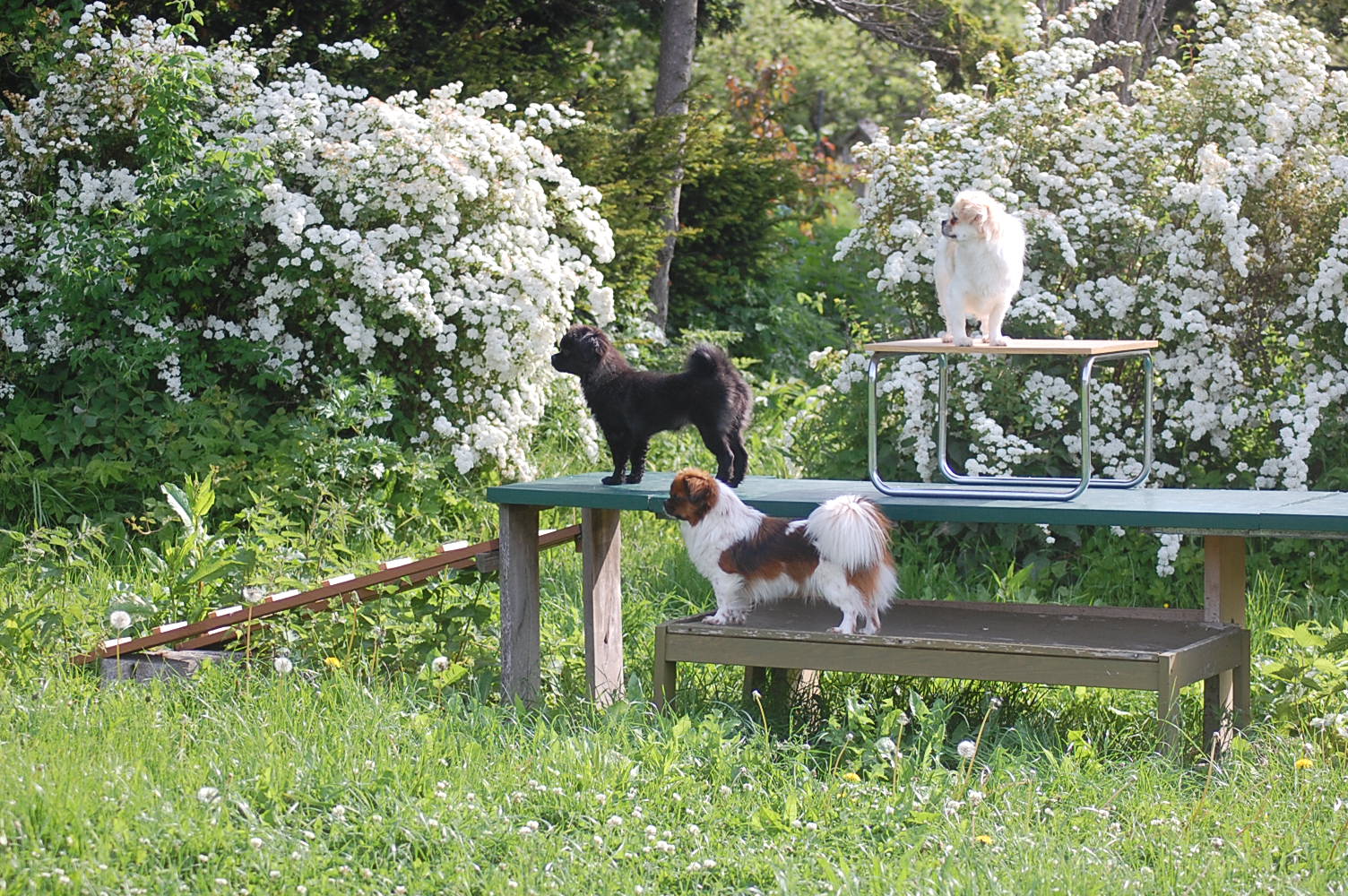 er meget frodig i år. Alting vokser så hurtigt at det er svært for mig at tage billeder af hundene for der er rigtig mange steder de kan gemme sig imellem alt det grønne. Jeg fik taget nogle billeder derude der også viser lidt af de vildtvoksende buskadser med blomstrende spirea og syrener og der er en duft derude, især efter regn, som jeg aldrig bliver træt af. Hundene har også gang i mange ting, og Ghana syntes at hun lige måtte gnave lidt i de friske grønne knopper på det lille grantræ, og Arthur har som sædvanligt fundet sig et sted med godt overblik, hvorfra han holder øje med det hele.