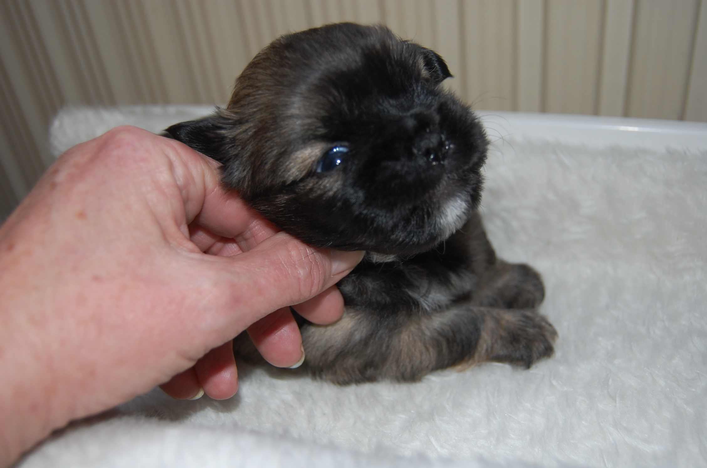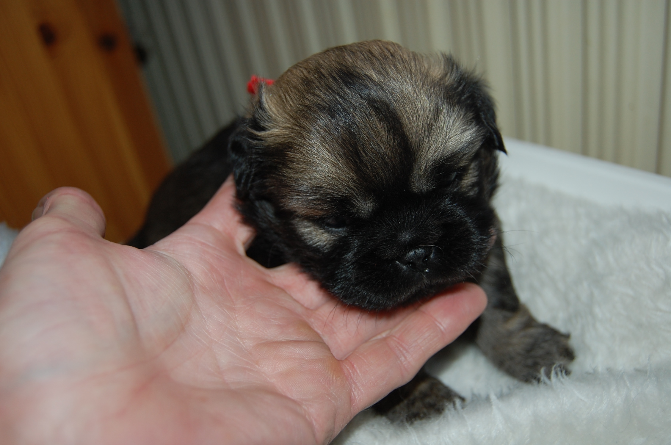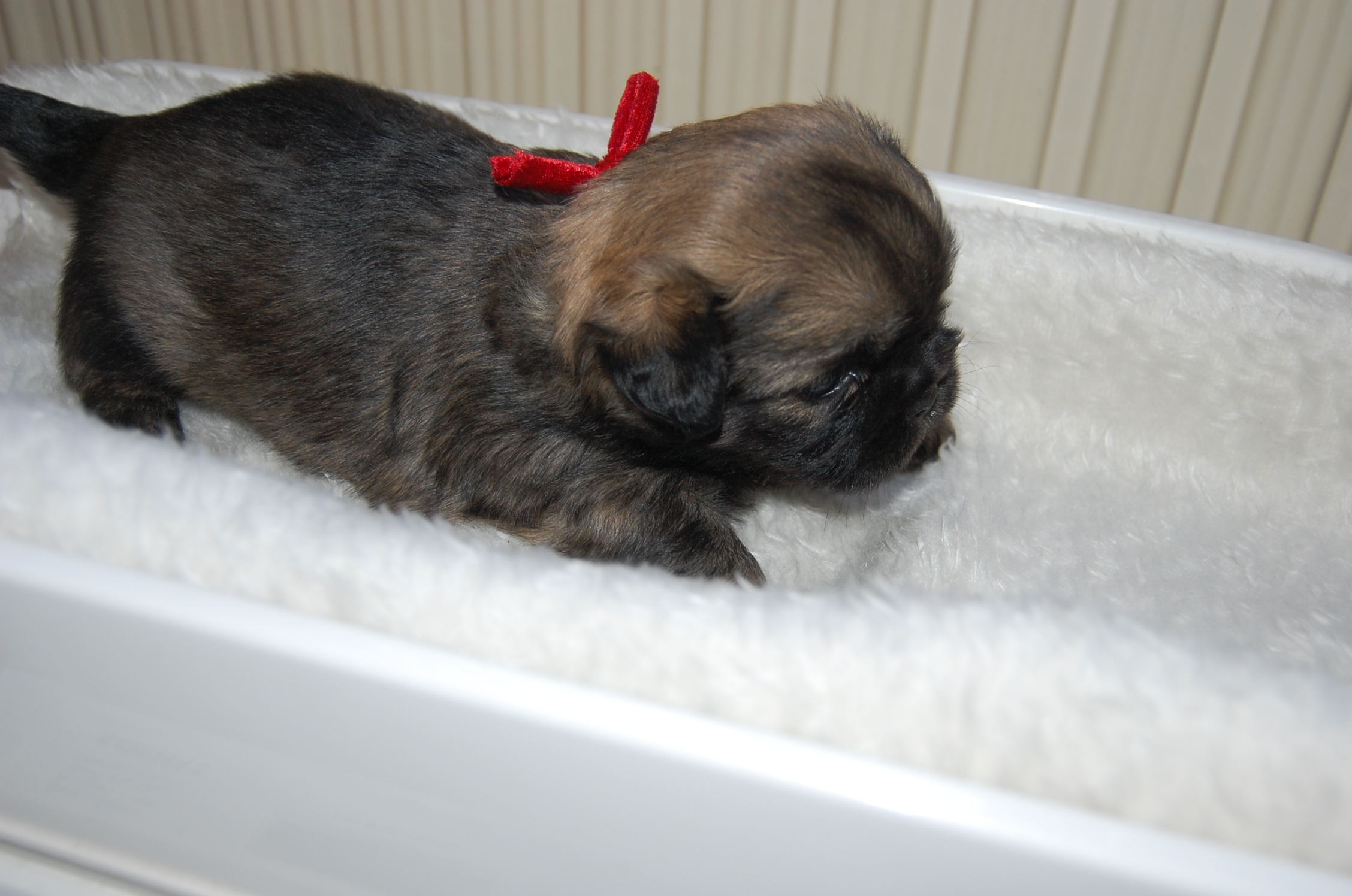 Andie`s dejlige hvalpe, Mardi og Monty, der har lige så dejlige Jeddi til far, er til salg. Tiden går jo bare alt for hurtigt, fra de små bliver født og til de bliver store nok til at flytte hjemmefra. Men selvom jeg har haft meget mere tid til at sidde ved siden af hvalpesengen og kigge på dette kuld, så bliver jeg aldrig træt af det. Nu er de ved at blive lidt sjovere, er lidt mere vågne og prøver på at komme op og gå på benene, men benene kan slet ikke bære dem endnu.Det er jo først i dag at de har fået snor på, det er jo nemt nok at kende forskel på dem, når det er en han og en tæve, og når hannen så ydermere har en hvid hage flip, så er der ingen mulighed for at forveksle dem.
