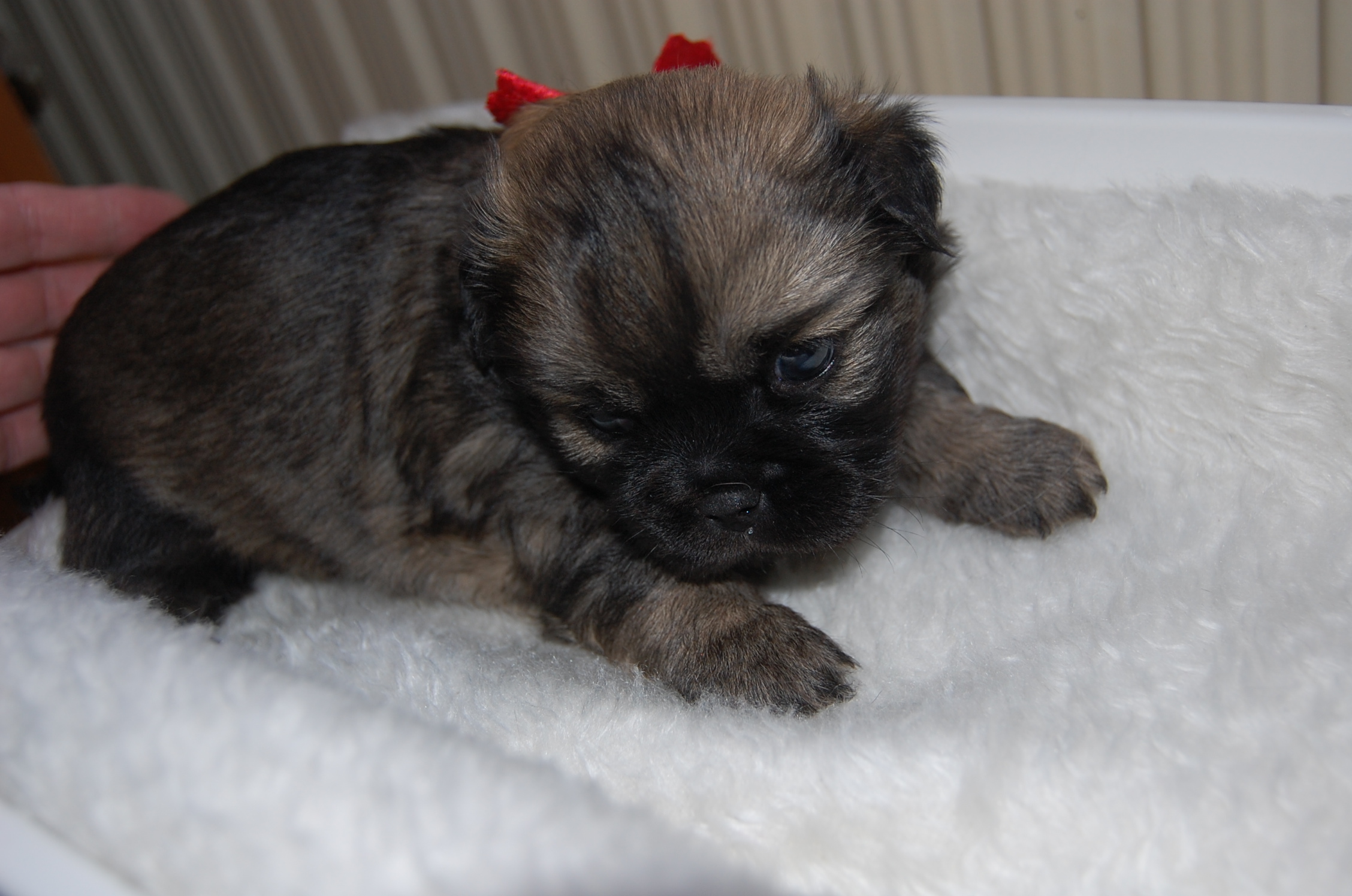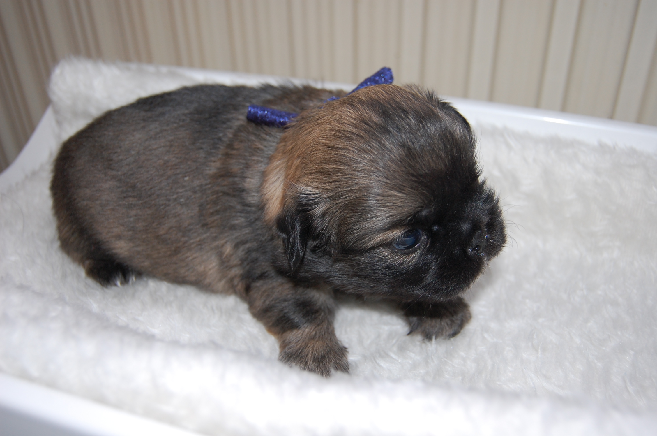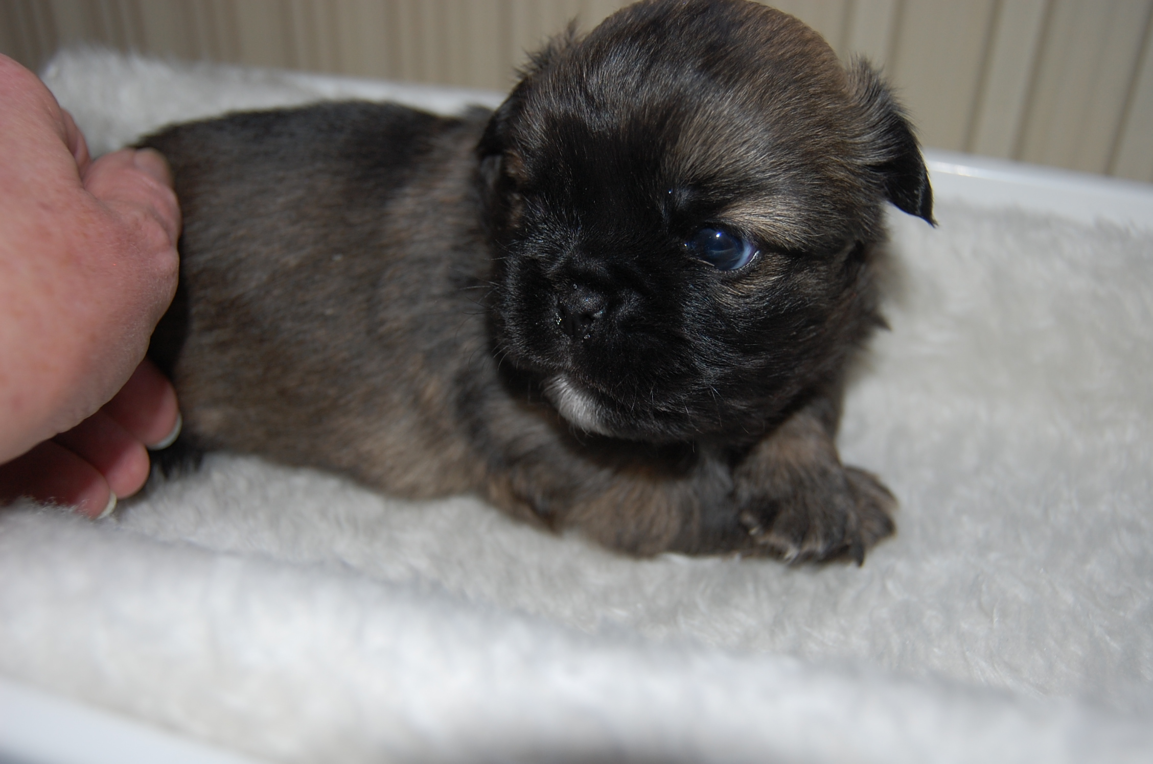 Andie`s dejlige hvalpe, Mardi og Monty, der har lige så dejlige Jeddi til far, er til salg. Tiden går jo bare alt for hurtigt, fra de små bliver født og til de bliver store nok til at flytte hjemmefra. Men selvom jeg har haft meget mere tid til at sidde ved siden af hvalpesengen og kigge på dette kuld, så bliver jeg aldrig træt af det. Nu er de ved at blive lidt sjovere, er lidt mere vågne og prøver på at komme op og gå på benene, men benene kan slet ikke bære dem endnu.Det er jo først i dag at de har fået snor på, det er jo nemt nok at kende forskel på dem, når det er en han og en tæve, og når hannen så ydermere har en hvid hage flip, så er der ingen mulighed for at forveksle dem.