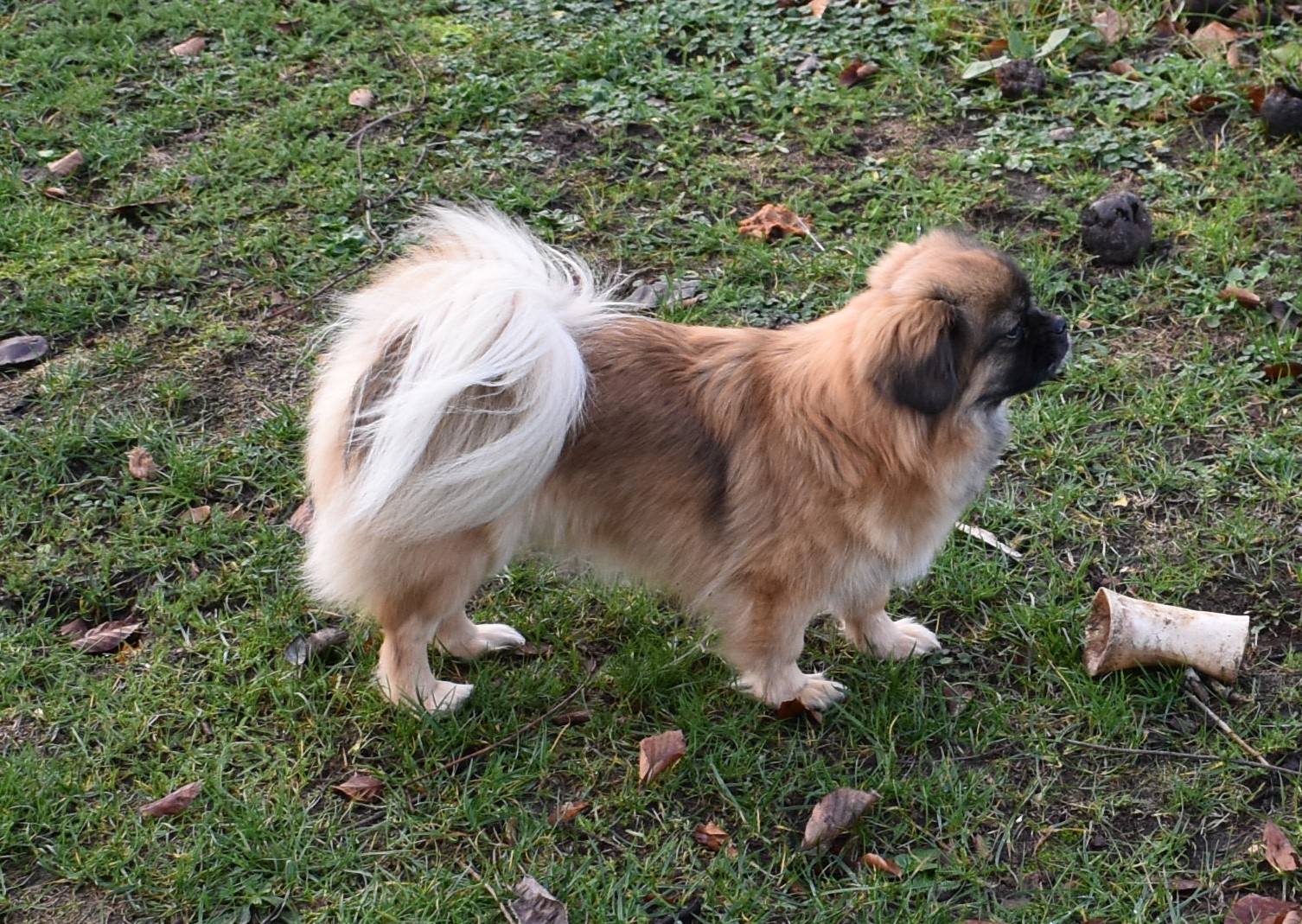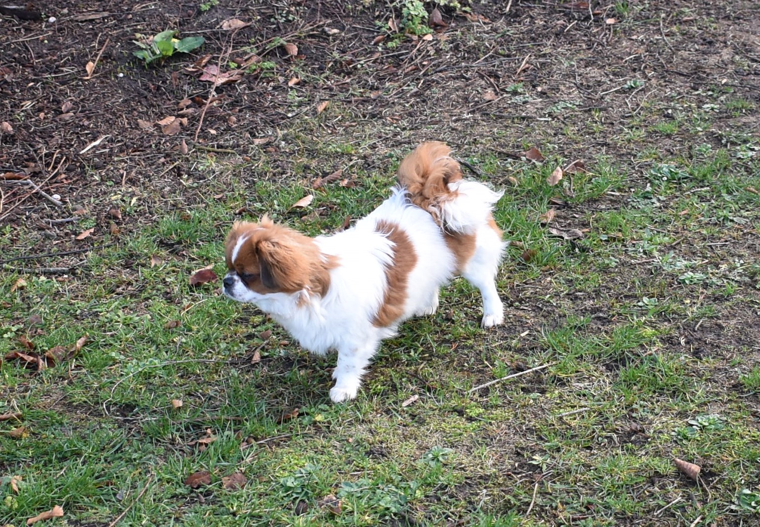 I dag tog jeg Inez og Diana ud i haven sammen med Tiara og Xila og de fire tæver hyggede sig på hver deres måde. Der var en meget tydelig opdeling af tæverne, to og to. Inez og Tiara var de modne fornuftige tæver, der trissede stille rundt og snuste og undersøgte i hele min store have. Diana og Xila var dem der stod for underholdningen imens og sørgede for at der var fart over feltet med vilde lege og tibbefræs. De havde ofte så meget fart på at de billeder jeg tog blev tågede. Jeg opgav hurtigt at følge med og nøjedes med at prøve at tage billeder på afstand, så måtte de bare beskæres bagefter.