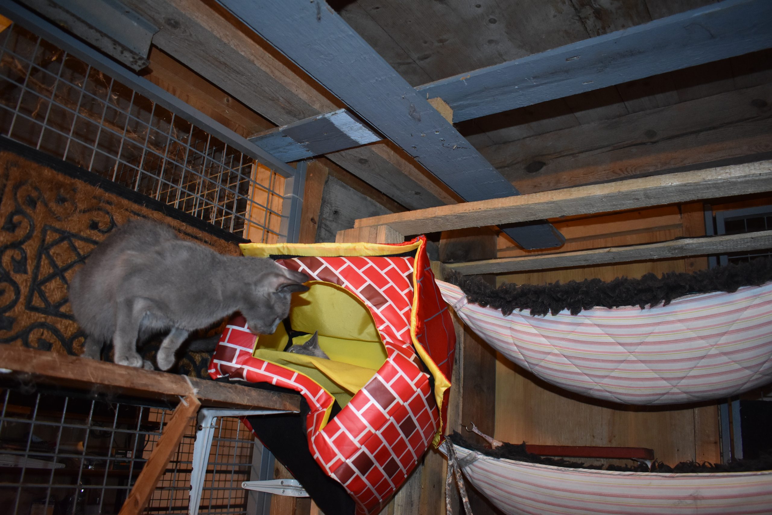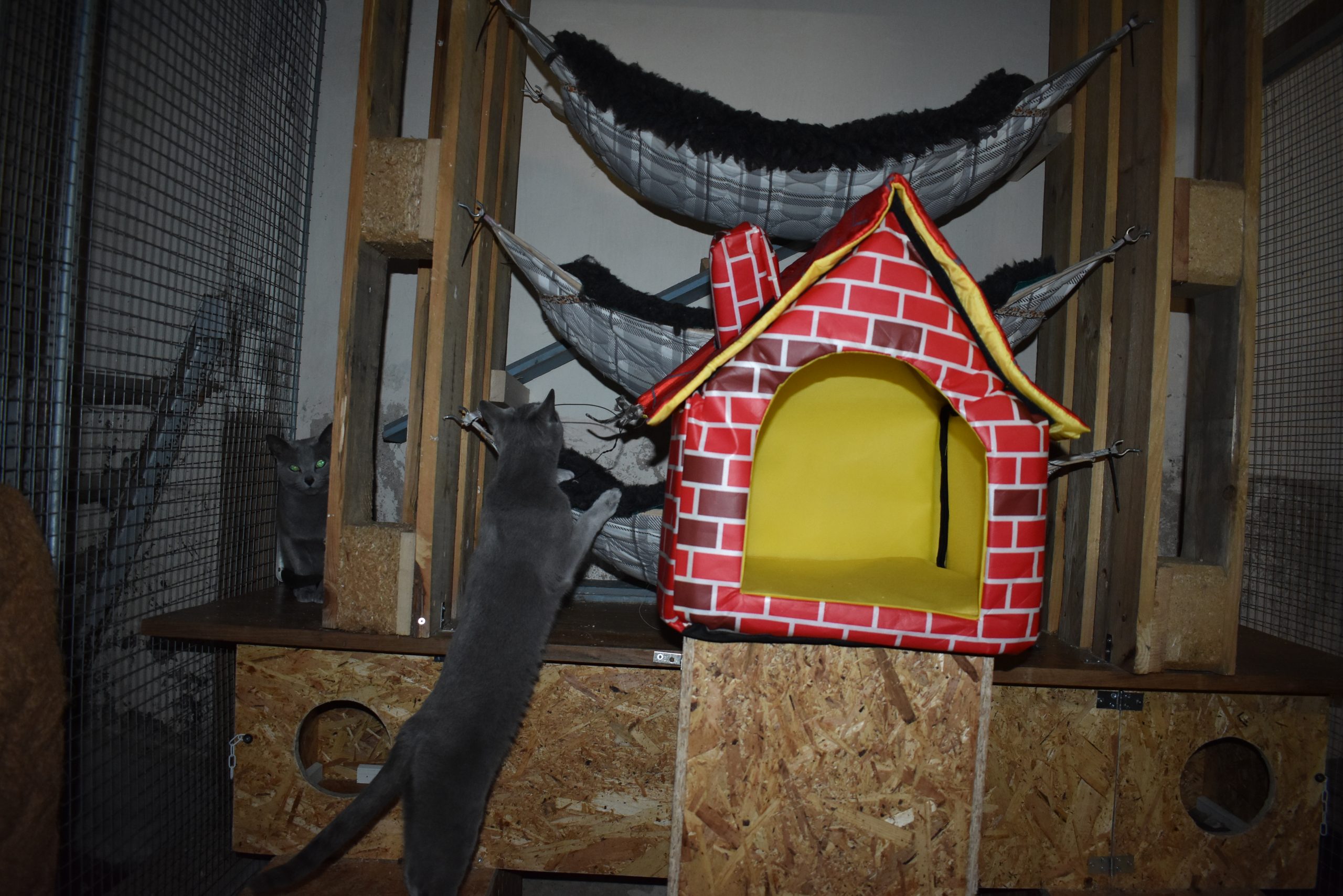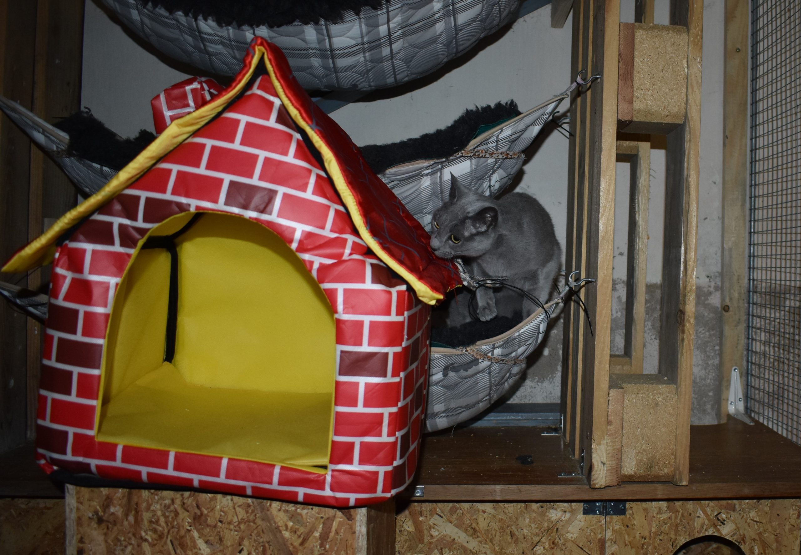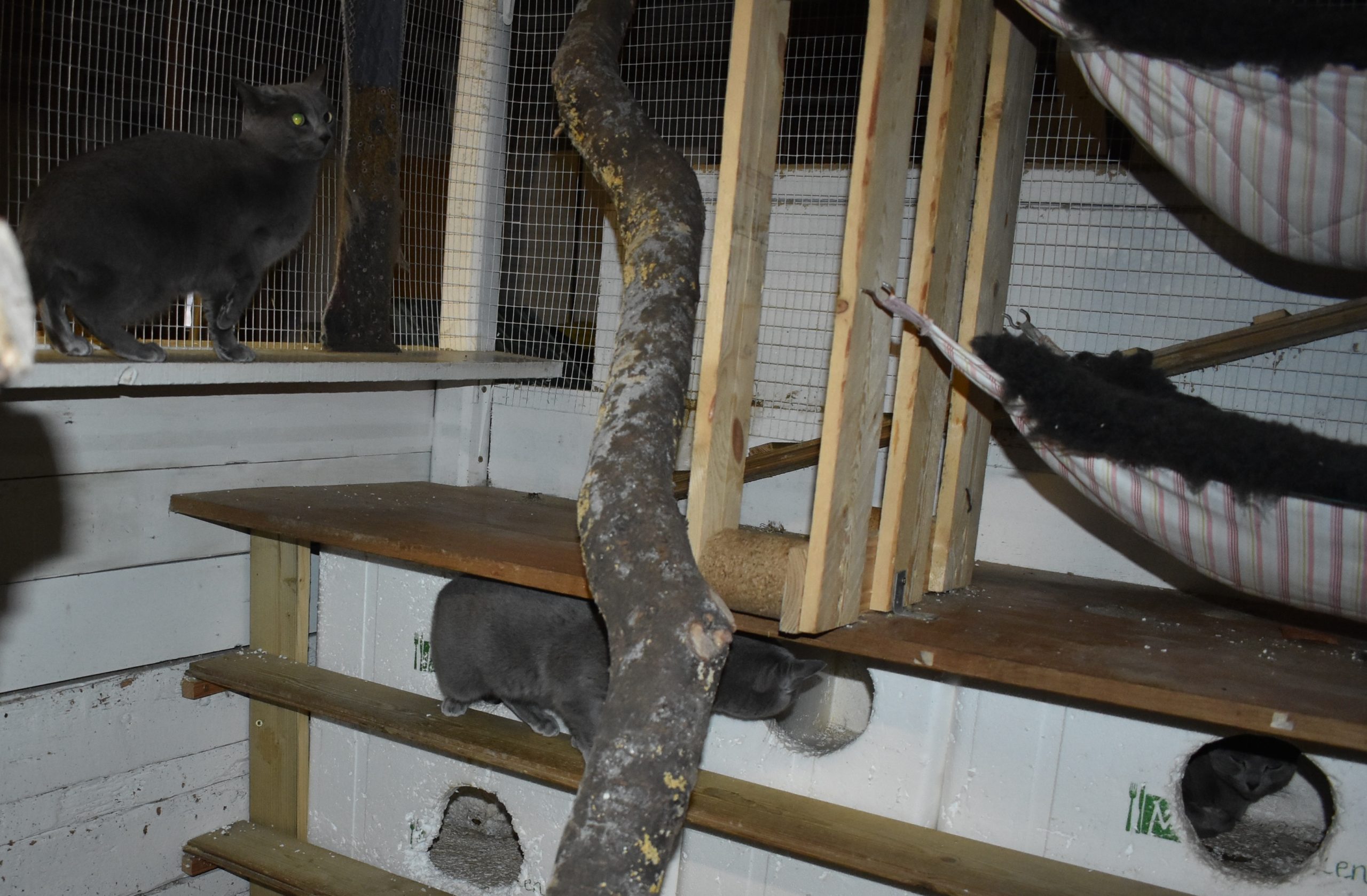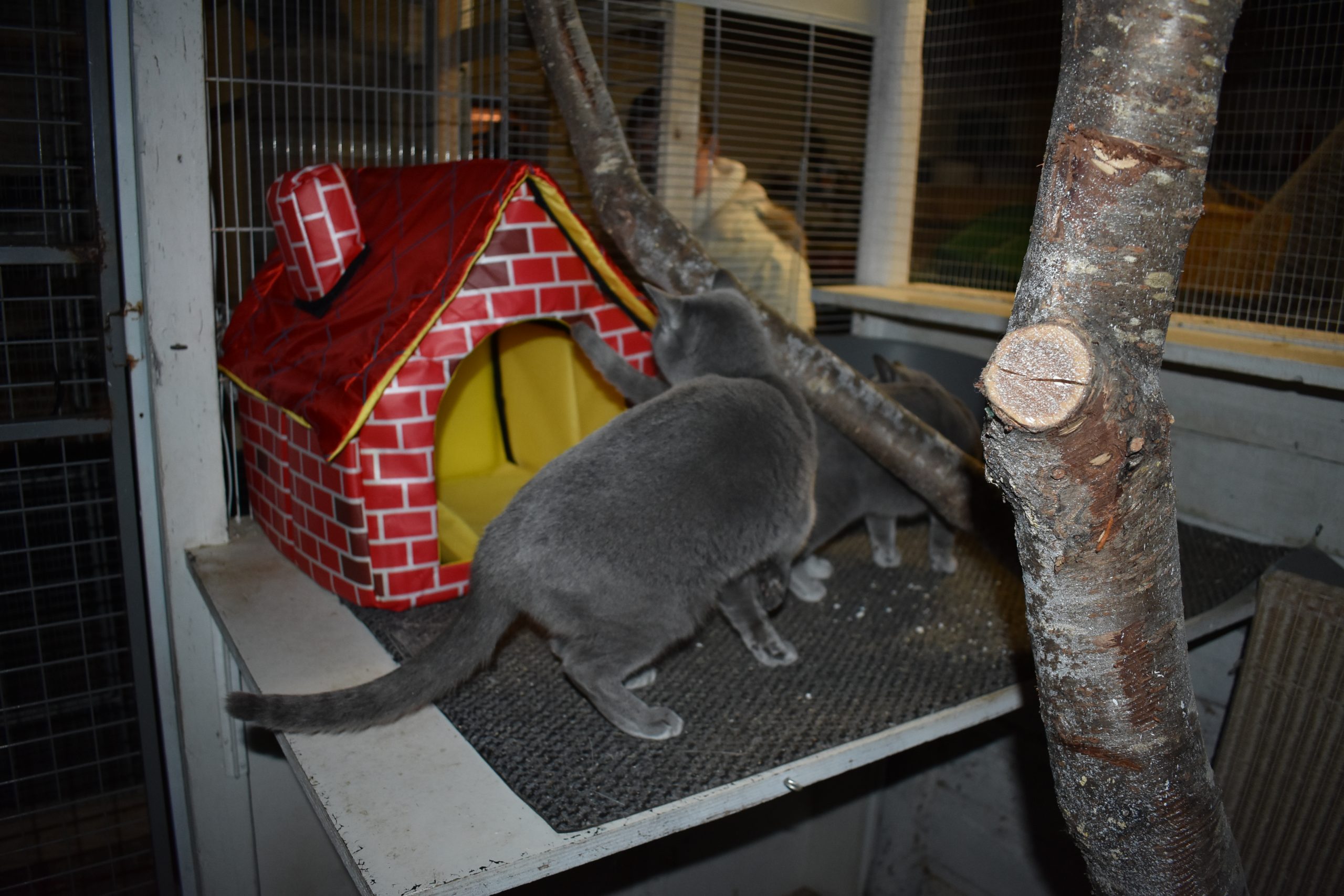 Jeg fik nogle smukke katte huse forærende fordi vedkommende der havde købt dem, havde katte der allerede havde yndlingspladser som de foretrak. Som Piet Hein skrev så er katte deres egen og det må man jo bare acceptere. Mine Russian Blue katte der har store volierer at bo i med forskellige muligheder for at klatre og huler at gemme sig i, prøver gerne noget nyt. Når mange katte bor sammen så slider det også på indretningen, så at få så fine huse bragte glæde blandt kattene og de blev undersøgt grundigt. Jeg synes jo at mine katte skal bruge arealet de har til rådighed helt op til loftet, og det betød at husene skulle fastgøres på en eller anden måde. Kattene var ret grundige i deres metoder til at prøve husene af, så det ene måtte simpelthen flyttes inden der var nogen der kom til skade. Jeg fik taget en del billeder og for en gangs skyld var kattene der hvor jeg pegede hen med kameraet, og sådan plejer det ikke at være. Alle mine katte er chippet, men det er umuligt at få dem til at beholde farvebåndet på, så jeg kan ikke fortælle hvilket navn de katte der er på billederne har, men jeg kan dog fortælle at der kun er 1 ung han kat på billederne, resten er hunkatte.