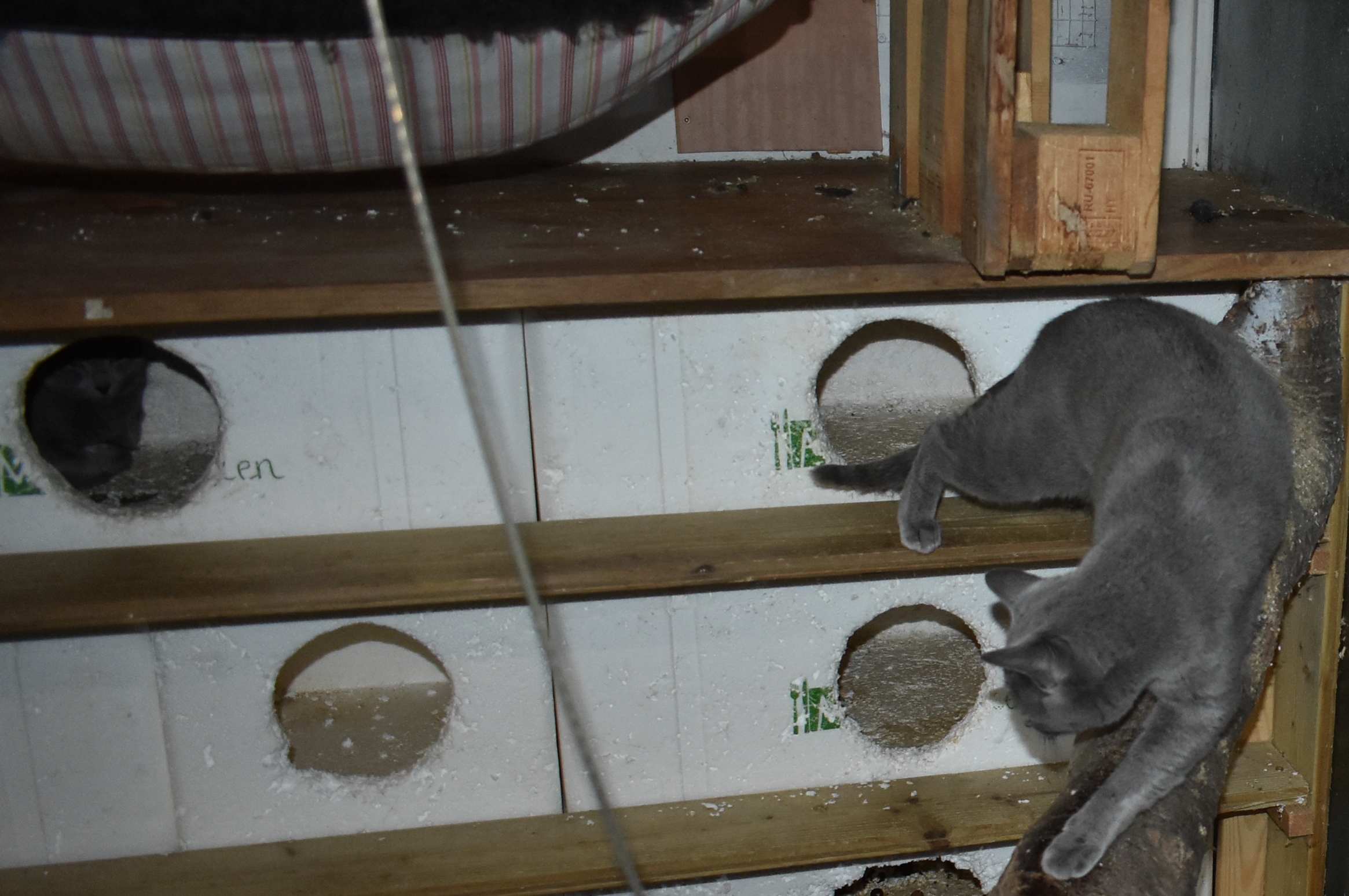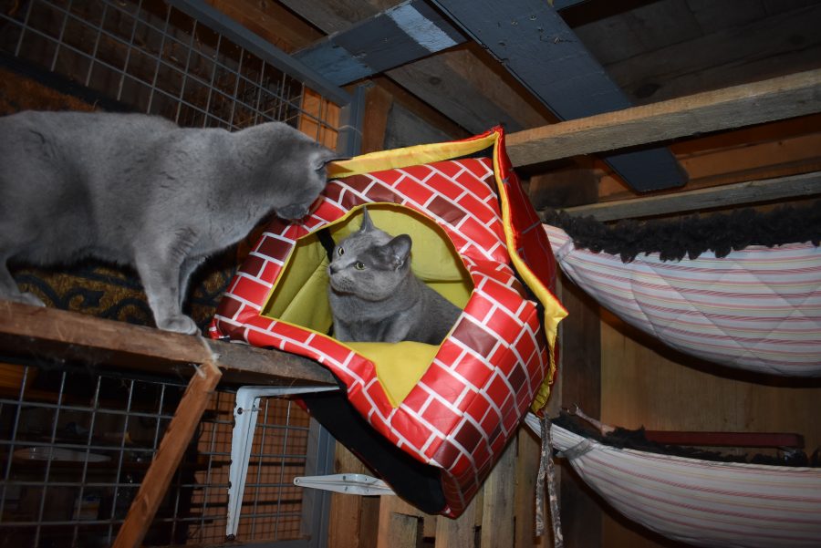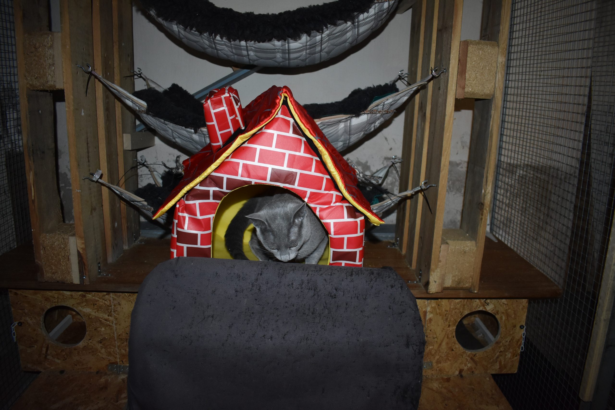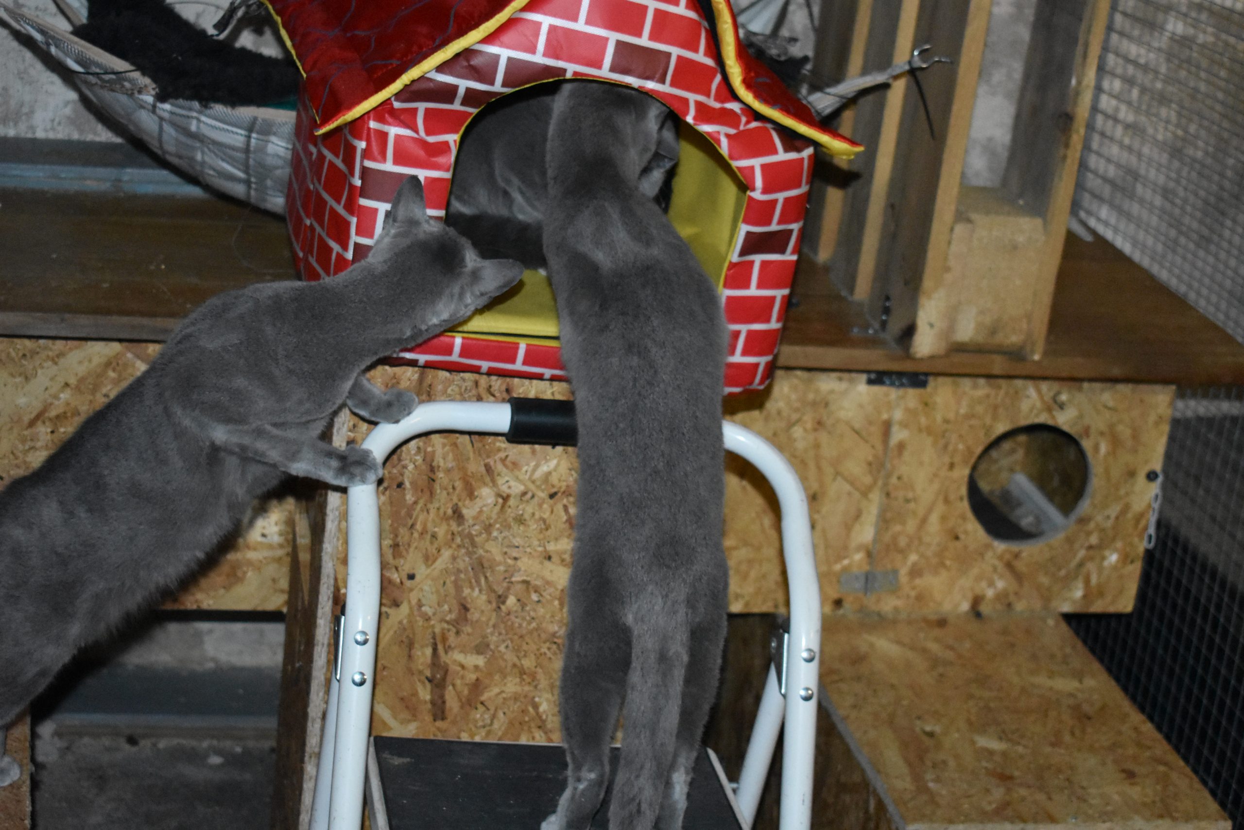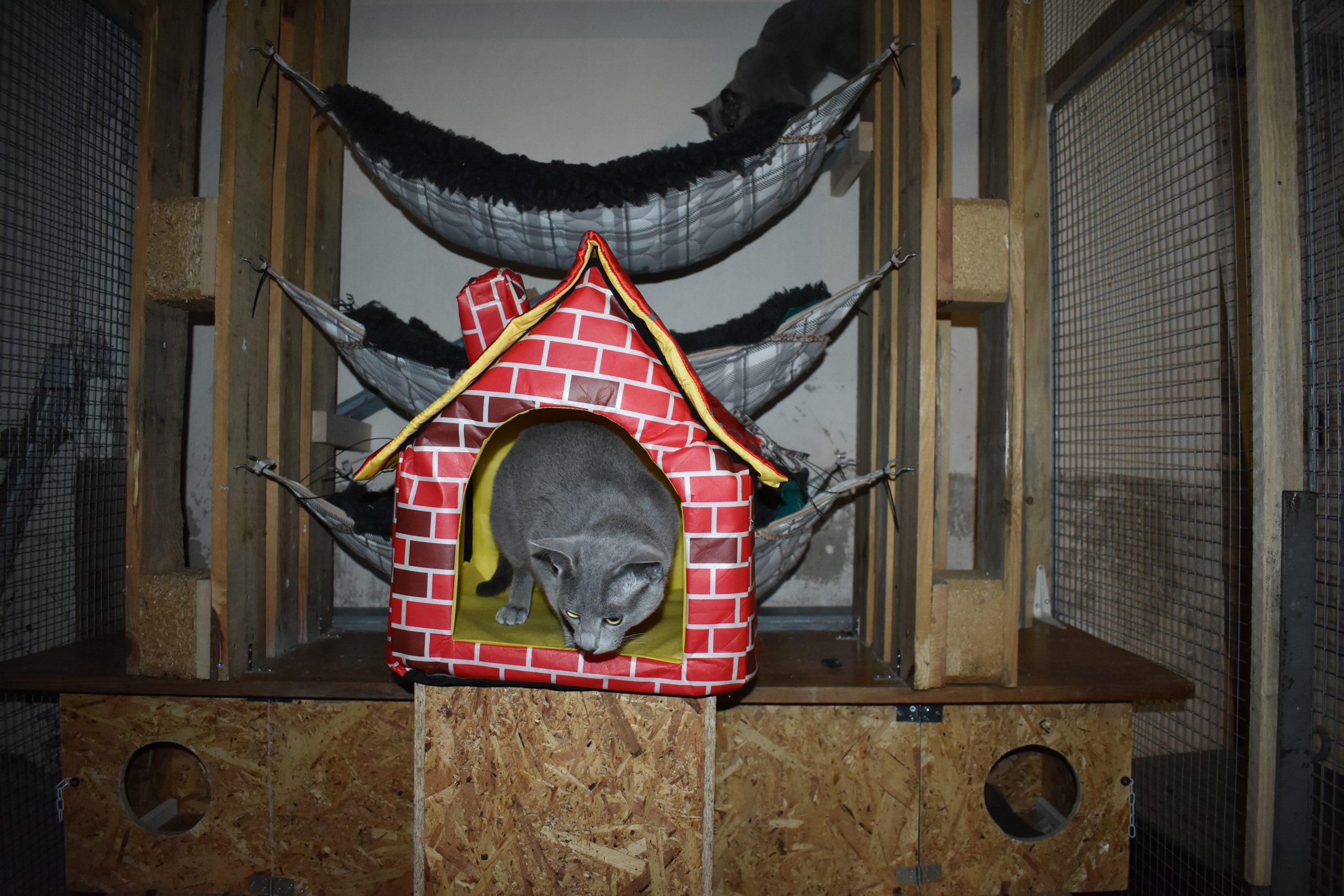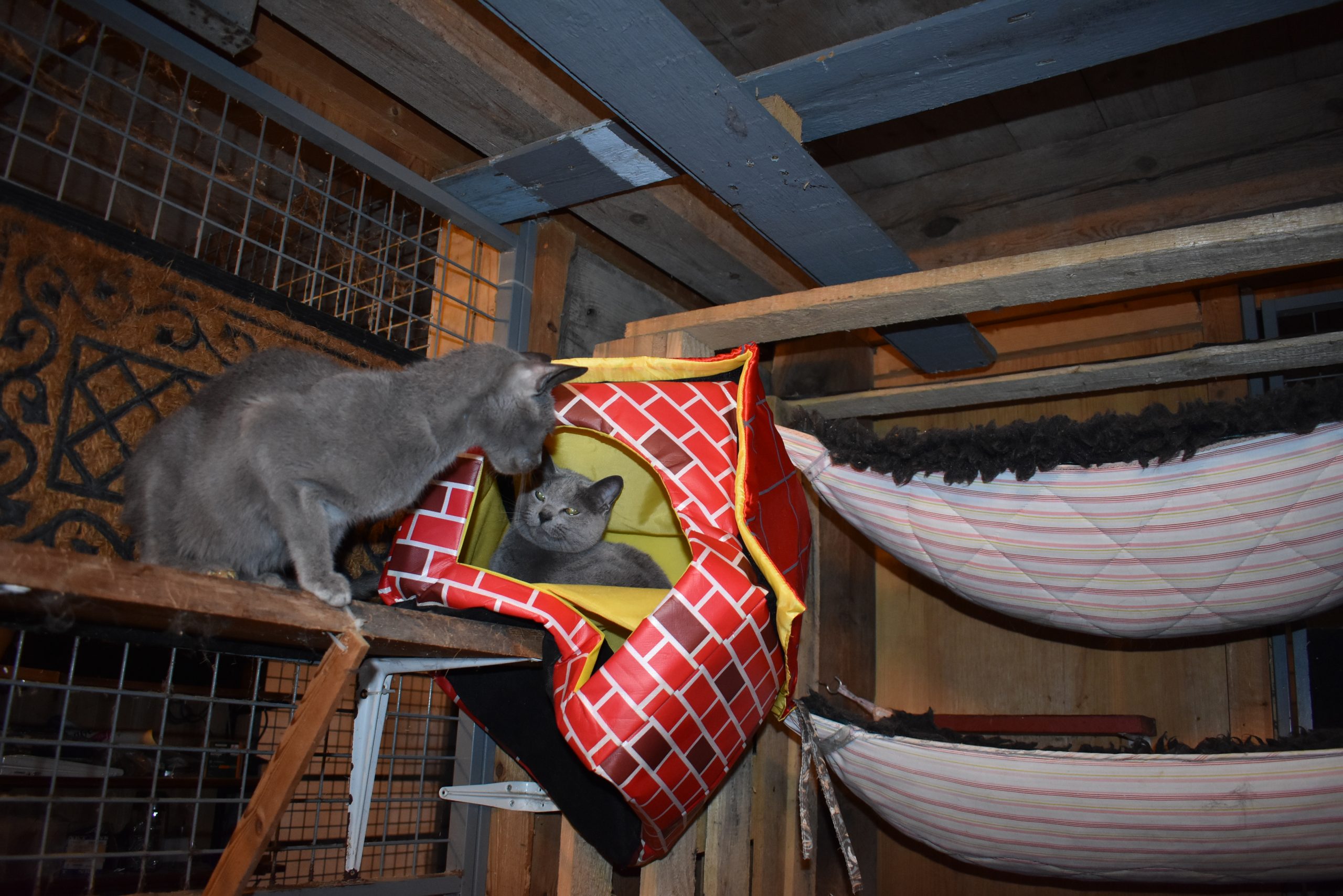 Jeg fik nogle smukke katte huse forærende fordi vedkommende der havde købt dem, havde katte der allerede havde yndlingspladser som de foretrak. Som Piet Hein skrev så er katte deres egen og det må man jo bare acceptere. Mine Russian Blue katte der har store volierer at bo i med forskellige muligheder for at klatre og huler at gemme sig i, prøver gerne noget nyt. Når mange katte bor sammen så slider det også på indretningen, så at få så fine huse bragte glæde blandt kattene og de blev undersøgt grundigt. Jeg synes jo at mine katte skal bruge arealet de har til rådighed helt op til loftet, og det betød at husene skulle fastgøres på en eller anden måde. Kattene var ret grundige i deres metoder til at prøve husene af, så det ene måtte simpelthen flyttes inden der var nogen der kom til skade. Jeg fik taget en del billeder og for en gangs skyld var kattene der hvor jeg pegede hen med kameraet, og sådan plejer det ikke at være. Alle mine katte er chippet, men det er umuligt at få dem til at beholde farvebåndet på, så jeg kan ikke fortælle hvilket navn de katte der er på billederne har, men jeg kan dog fortælle at der kun er 1 ung han kat på billederne, resten er hunkatte.