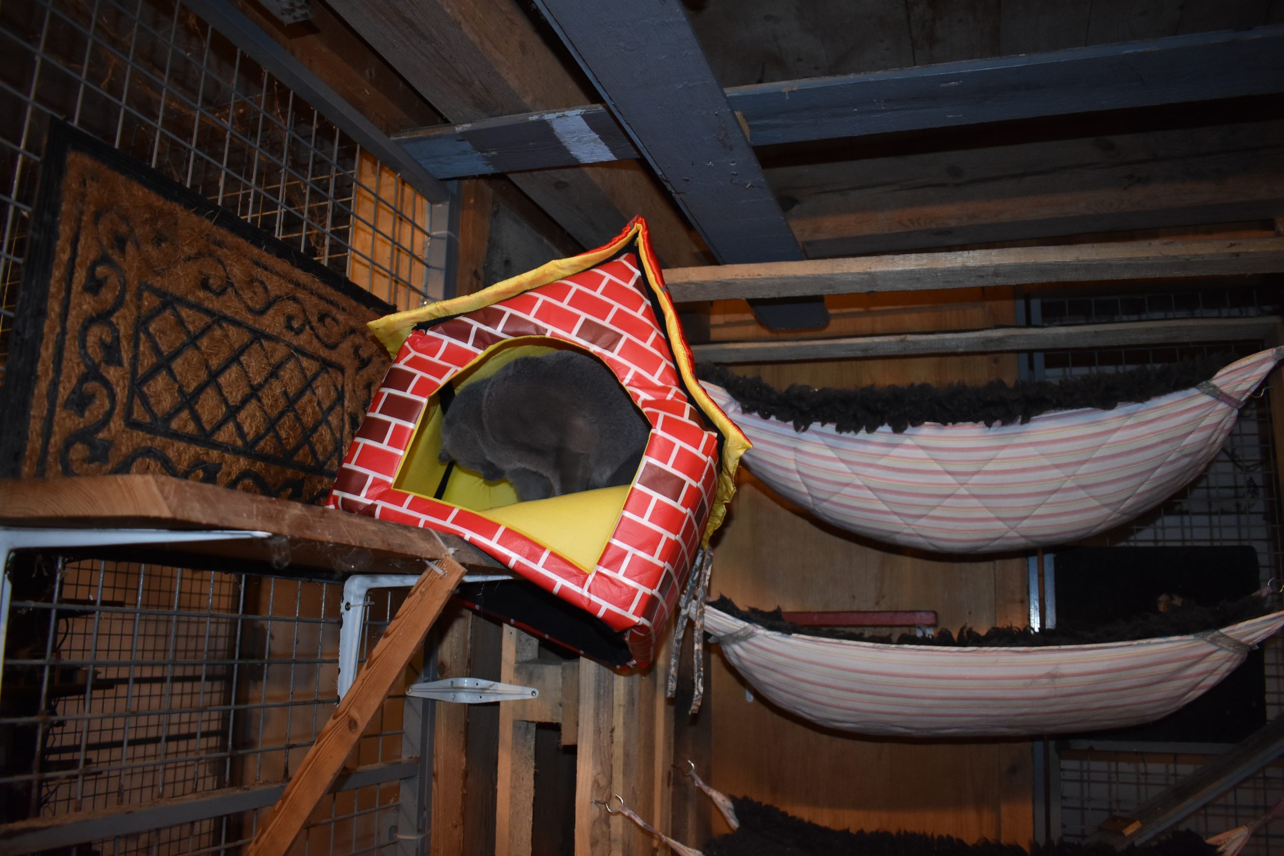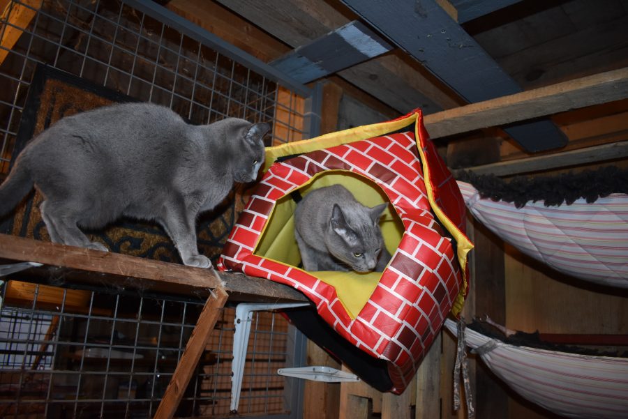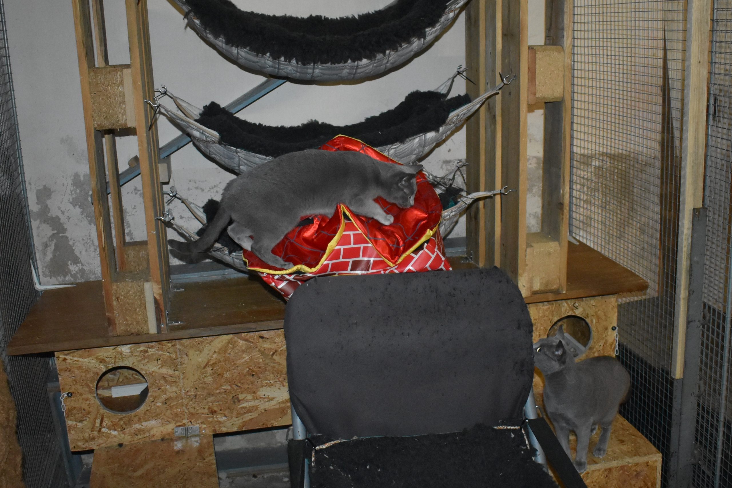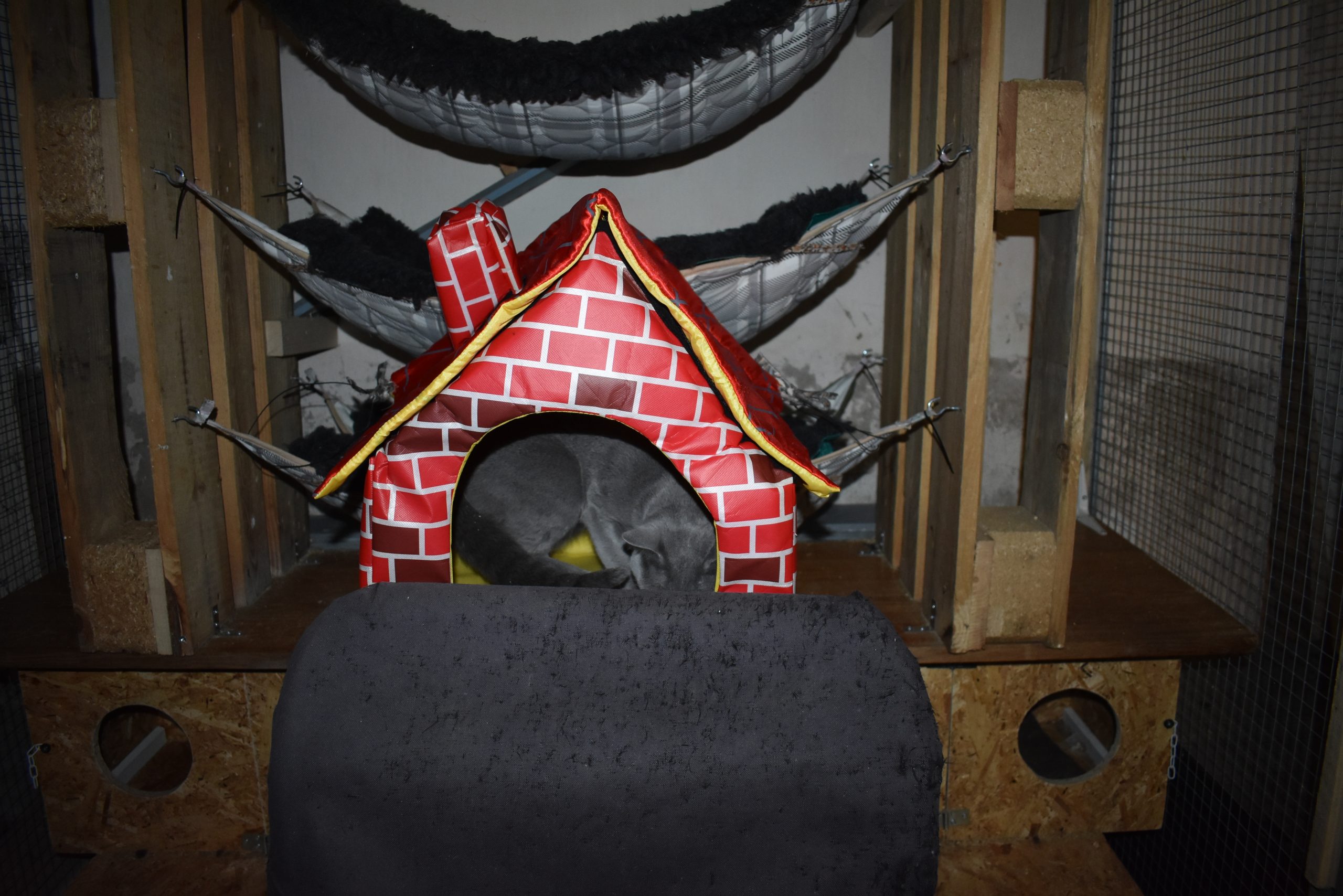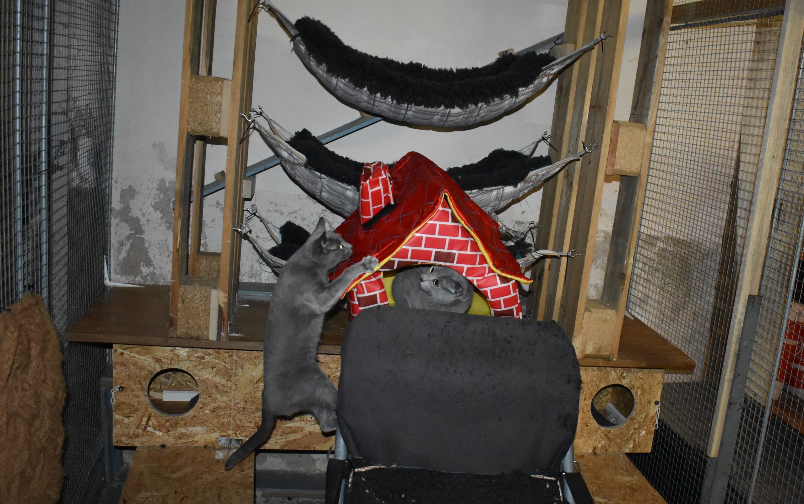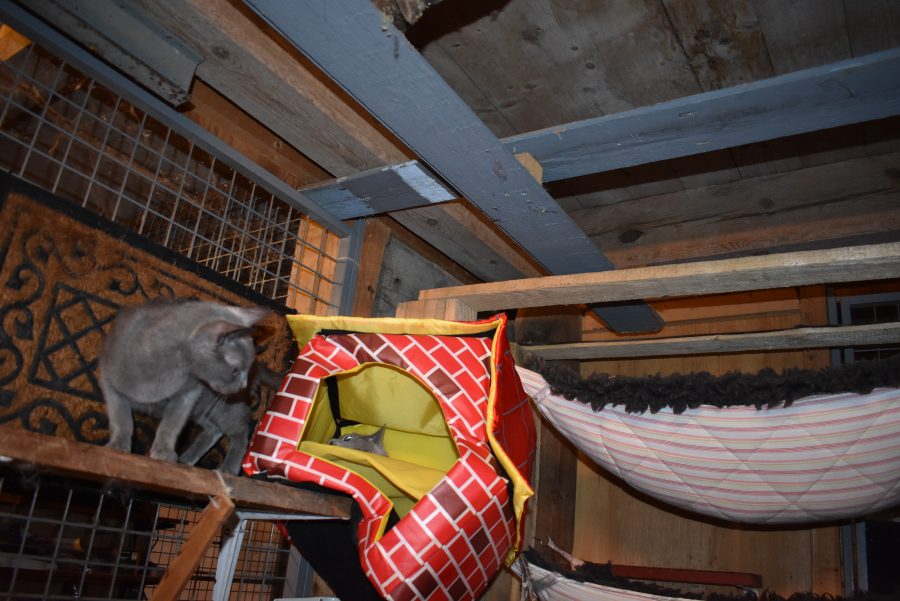 Jeg fik nogle smukke katte huse forærende fordi vedkommende der havde købt dem, havde katte der allerede havde yndlingspladser som de foretrak. Som Piet Hein skrev så er katte deres egen og det må man jo bare acceptere. Mine Russian Blue katte der har store volierer at bo i med forskellige muligheder for at klatre og huler at gemme sig i, prøver gerne noget nyt. Når mange katte bor sammen så slider det også på indretningen, så at få så fine huse bragte glæde blandt kattene og de blev undersøgt grundigt. Jeg synes jo at mine katte skal bruge arealet de har til rådighed helt op til loftet, og det betød at husene skulle fastgøres på en eller anden måde. Kattene var ret grundige i deres metoder til at prøve husene af, så det ene måtte simpelthen flyttes inden der var nogen der kom til skade. Jeg fik taget en del billeder og for en gangs skyld var kattene der hvor jeg pegede hen med kameraet, og sådan plejer det ikke at være. Alle mine katte er chippet, men det er umuligt at få dem til at beholde farvebåndet på, så jeg kan ikke fortælle hvilket navn de katte der er på billederne har, men jeg kan dog fortælle at der kun er 1 ung han kat på billederne, resten er hunkatte.