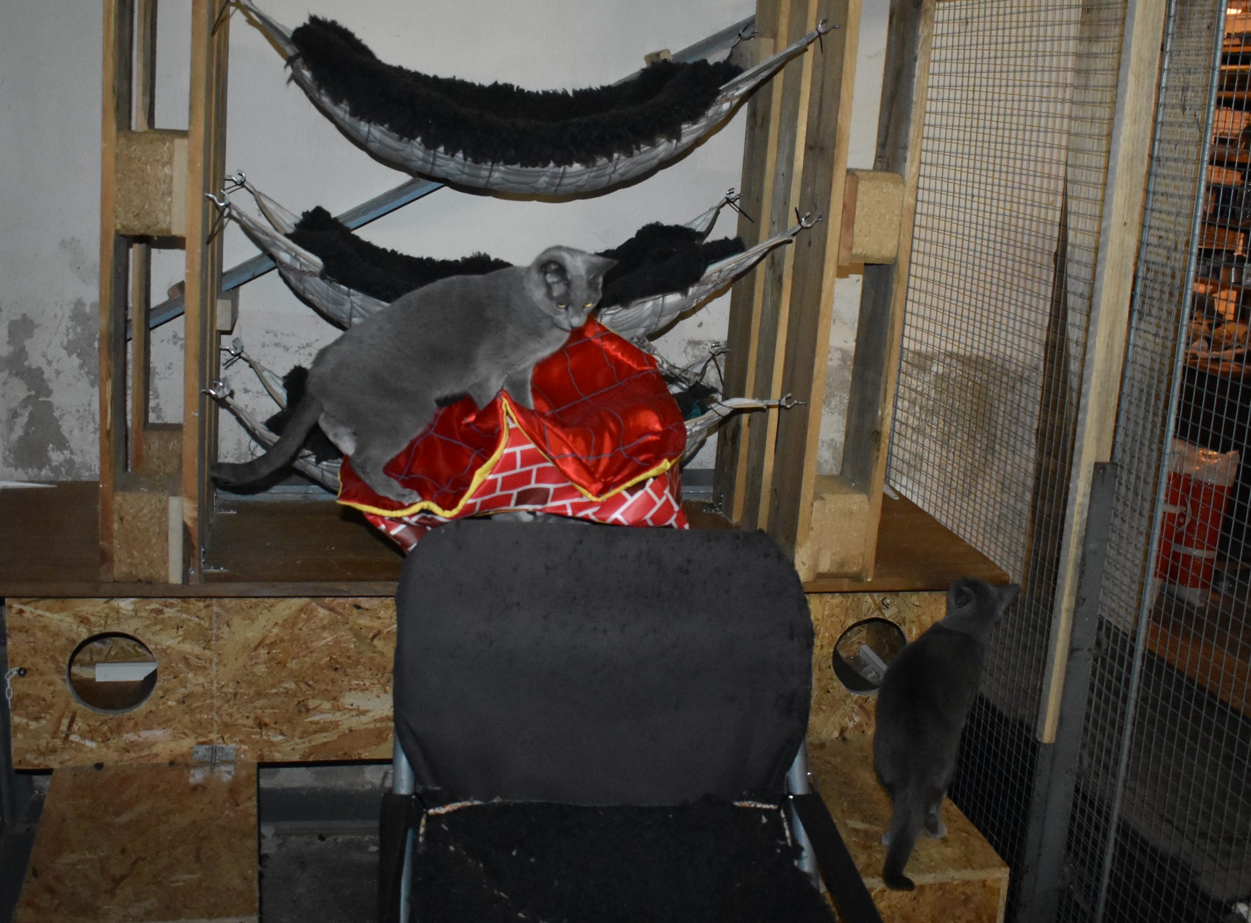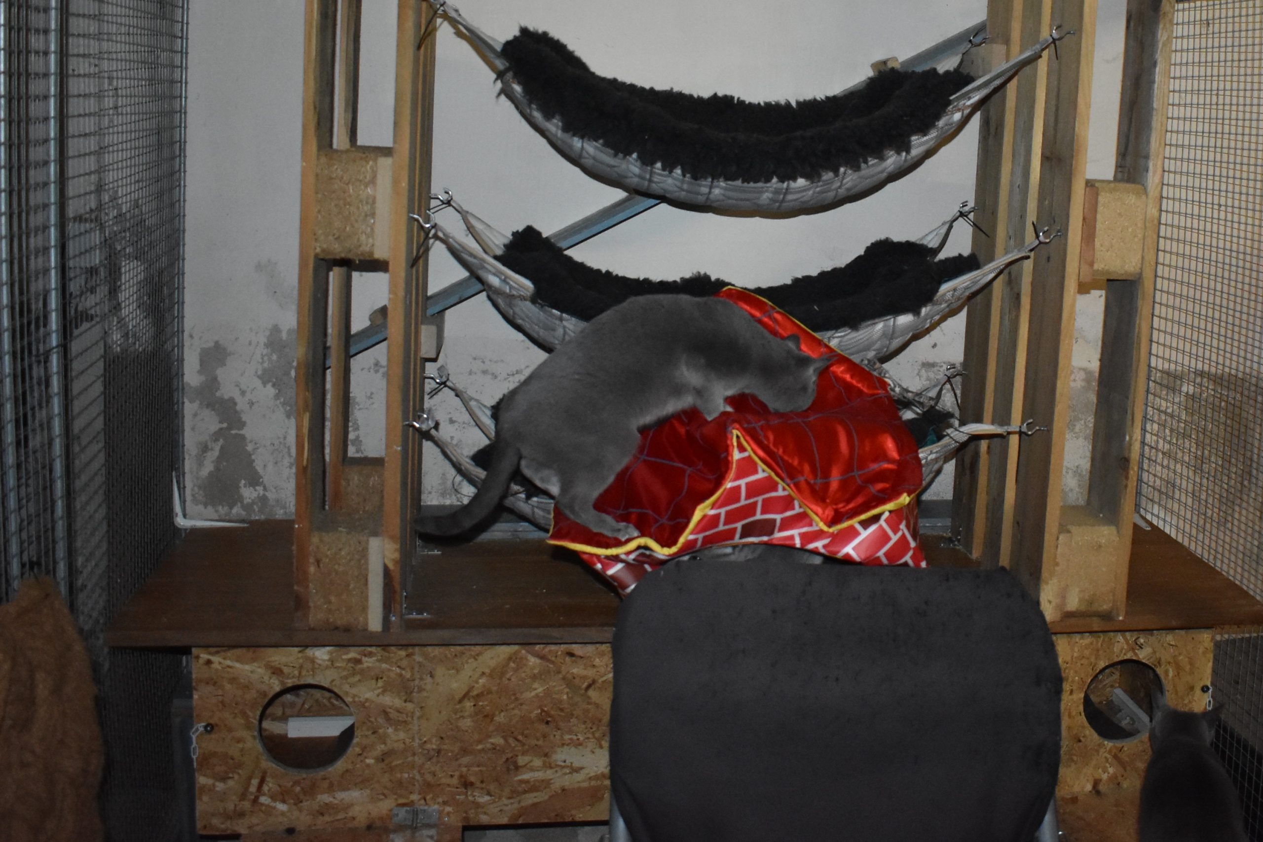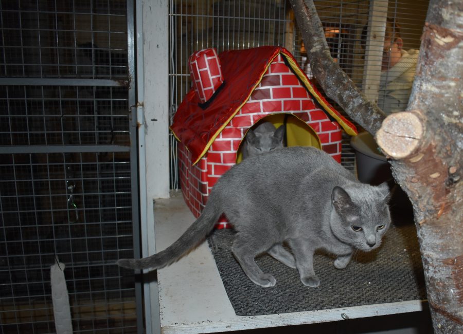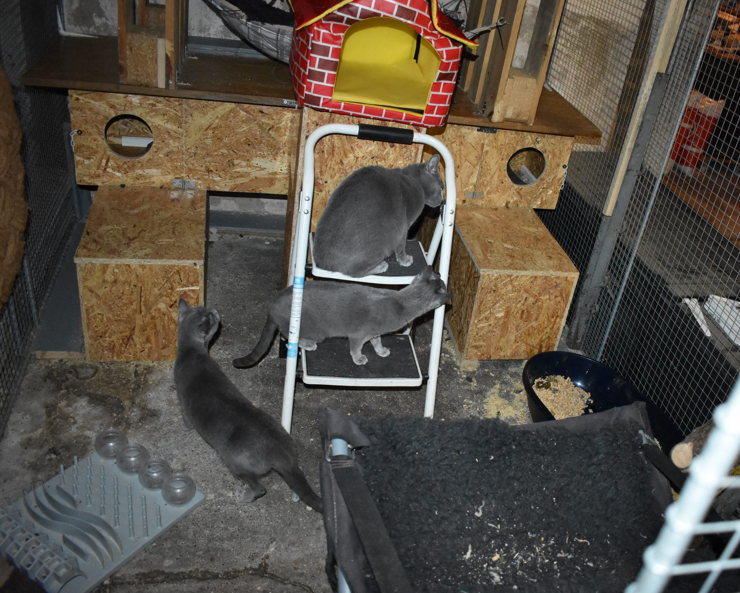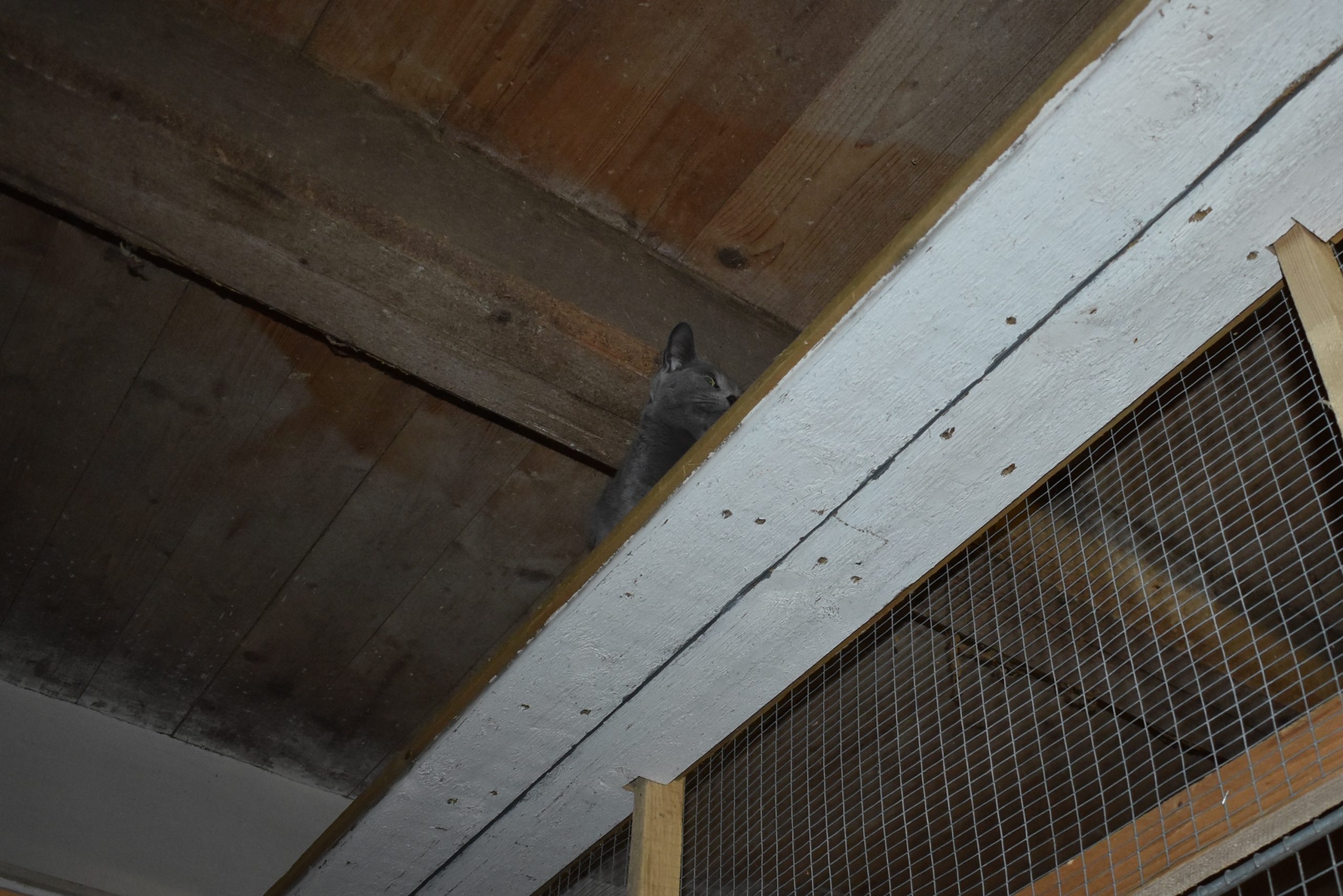 Jeg fik nogle smukke katte huse forærende fordi vedkommende der havde købt dem, havde katte der allerede havde yndlingspladser som de foretrak. Som Piet Hein skrev så er katte deres egen og det må man jo bare acceptere. Mine Russian Blue katte der har store volierer at bo i med forskellige muligheder for at klatre og huler at gemme sig i, prøver gerne noget nyt. Når mange katte bor sammen så slider det også på indretningen, så at få så fine huse bragte glæde blandt kattene og de blev undersøgt grundigt. Jeg synes jo at mine katte skal bruge arealet de har til rådighed helt op til loftet, og det betød at husene skulle fastgøres på en eller anden måde. Kattene var ret grundige i deres metoder til at prøve husene af, så det ene måtte simpelthen flyttes inden der var nogen der kom til skade. Jeg fik taget en del billeder og for en gangs skyld var kattene der hvor jeg pegede hen med kameraet, og sådan plejer det ikke at være. Alle mine katte er chippet, men det er umuligt at få dem til at beholde farvebåndet på, så jeg kan ikke fortælle hvilket navn de katte der er på billederne har, men jeg kan dog fortælle at der kun er 1 ung han kat på billederne, resten er hunkatte.