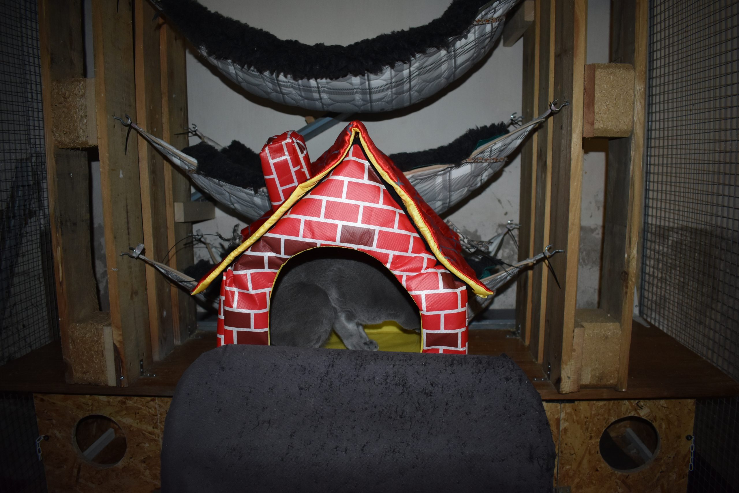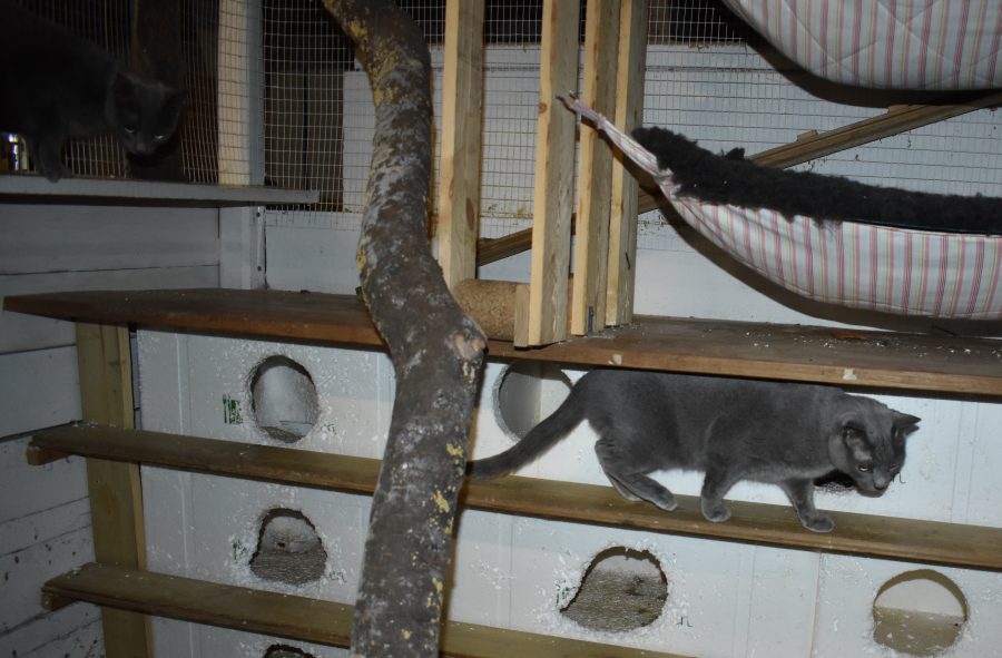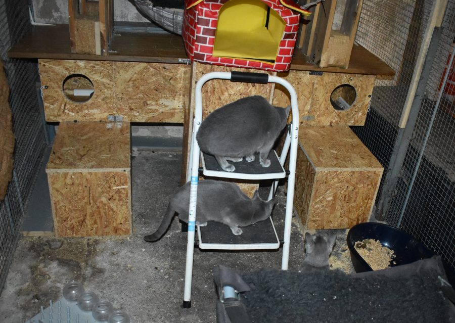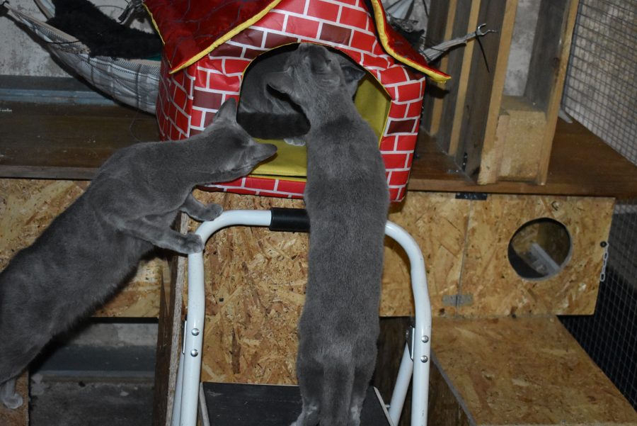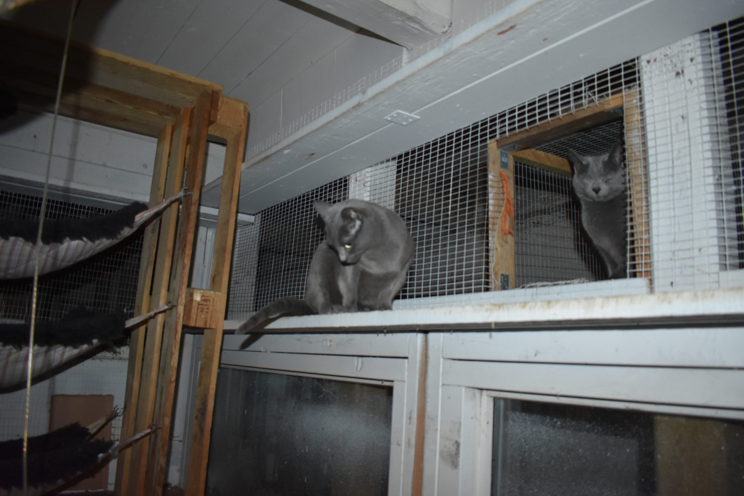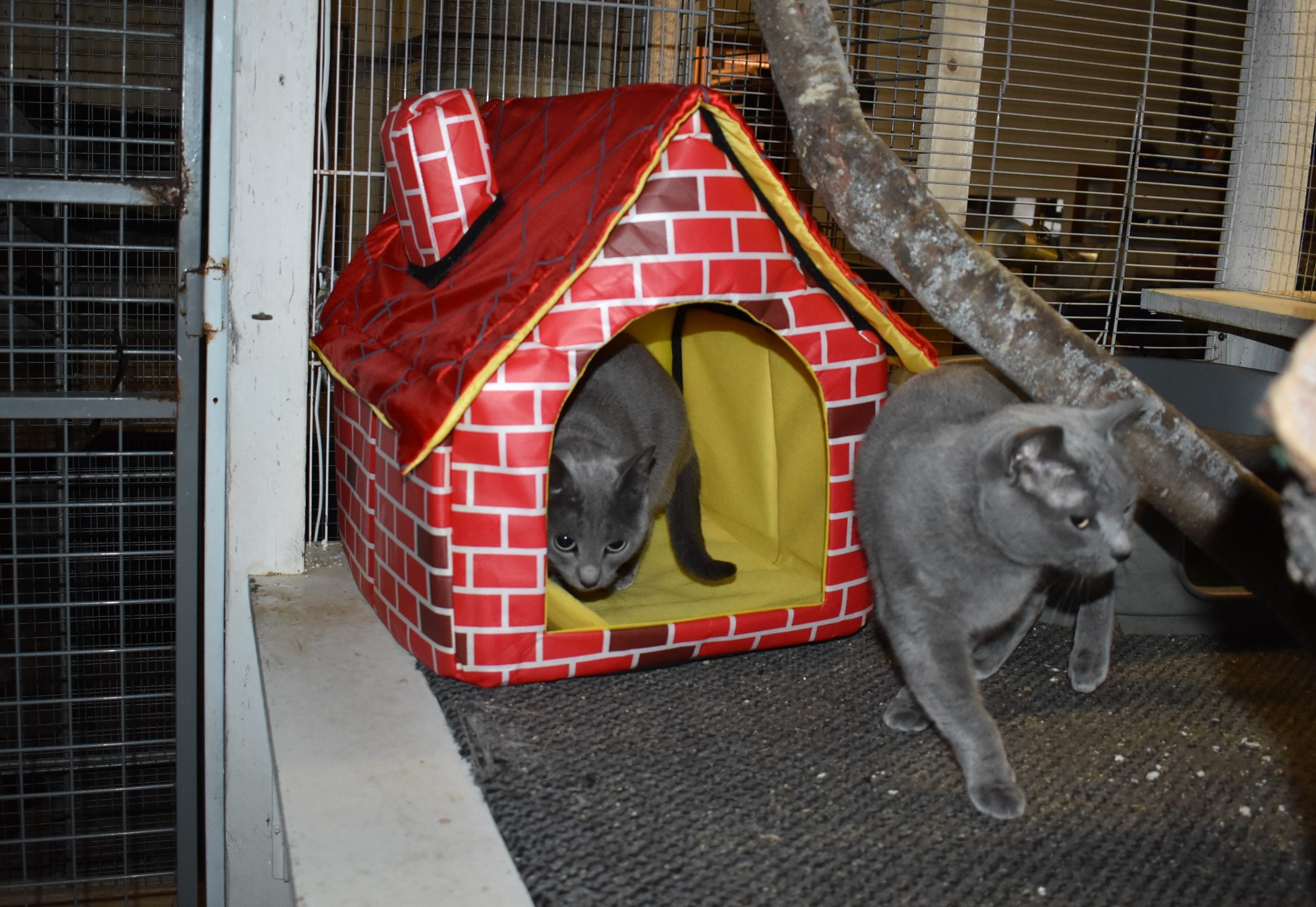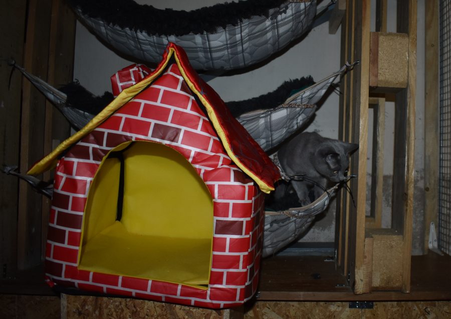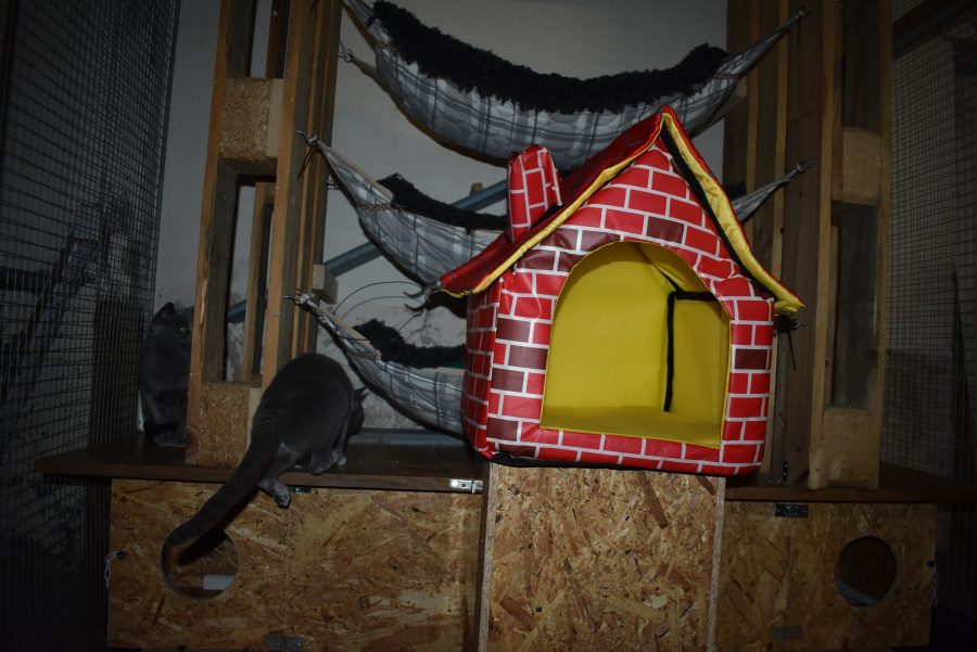 Jeg fik nogle smukke katte huse forærende fordi vedkommende der havde købt dem, havde katte der allerede havde yndlingspladser som de foretrak. Som Piet Hein skrev så er katte deres egen og det må man jo bare acceptere. Mine Russian Blue katte der har store volierer at bo i med forskellige muligheder for at klatre og huler at gemme sig i, prøver gerne noget nyt. Når mange katte bor sammen så slider det også på indretningen, så at få så fine huse bragte glæde blandt kattene og de blev undersøgt grundigt. Jeg synes jo at mine katte skal bruge arealet de har til rådighed helt op til loftet, og det betød at husene skulle fastgøres på en eller anden måde. Kattene var ret grundige i deres metoder til at prøve husene af, så det ene måtte simpelthen flyttes inden der var nogen der kom til skade. Jeg fik taget en del billeder og for en gangs skyld var kattene der hvor jeg pegede hen med kameraet, og sådan plejer det ikke at være. Alle mine katte er chippet, men det er umuligt at få dem til at beholde farvebåndet på, så jeg kan ikke fortælle hvilket navn de katte der er på billederne har, men jeg kan dog fortælle at der kun er 1 ung han kat på billederne, resten er hunkatte.