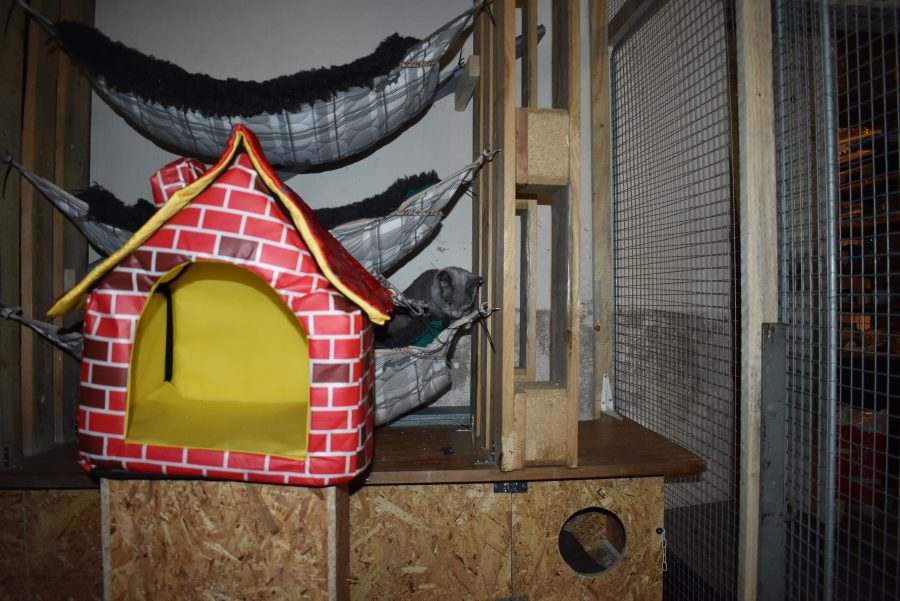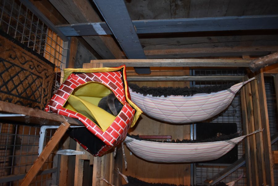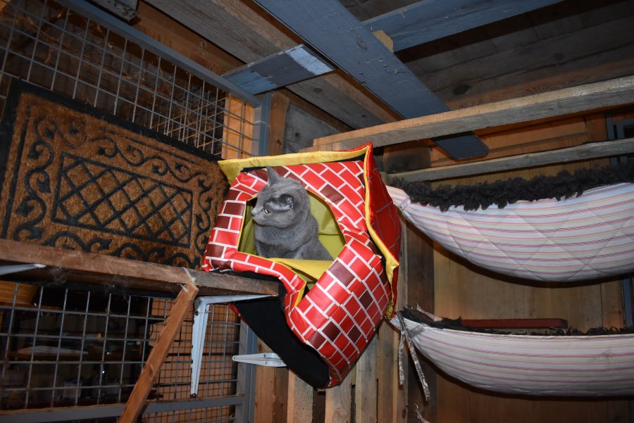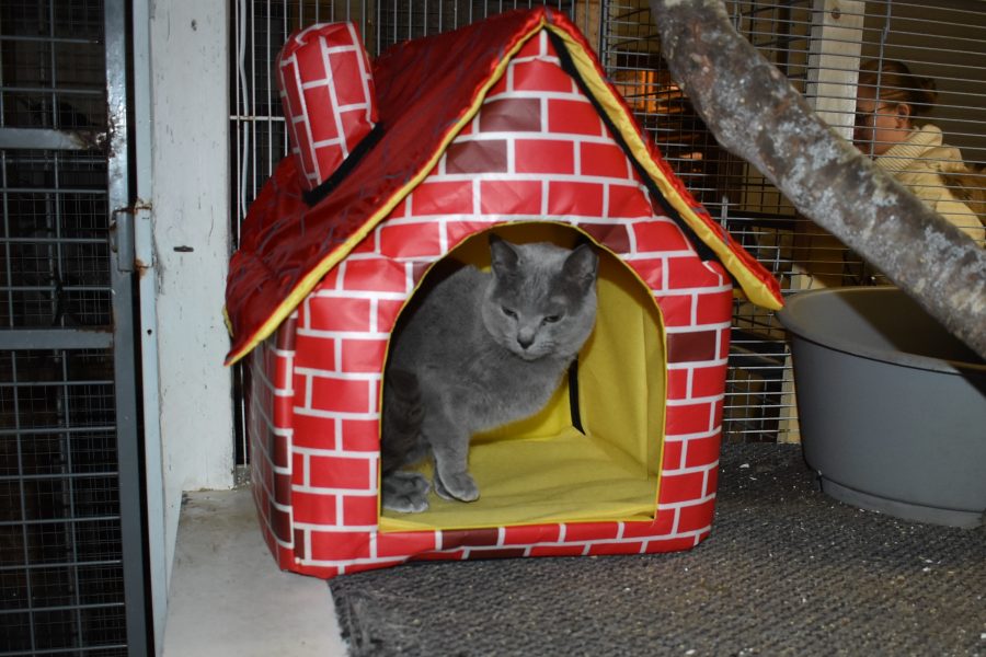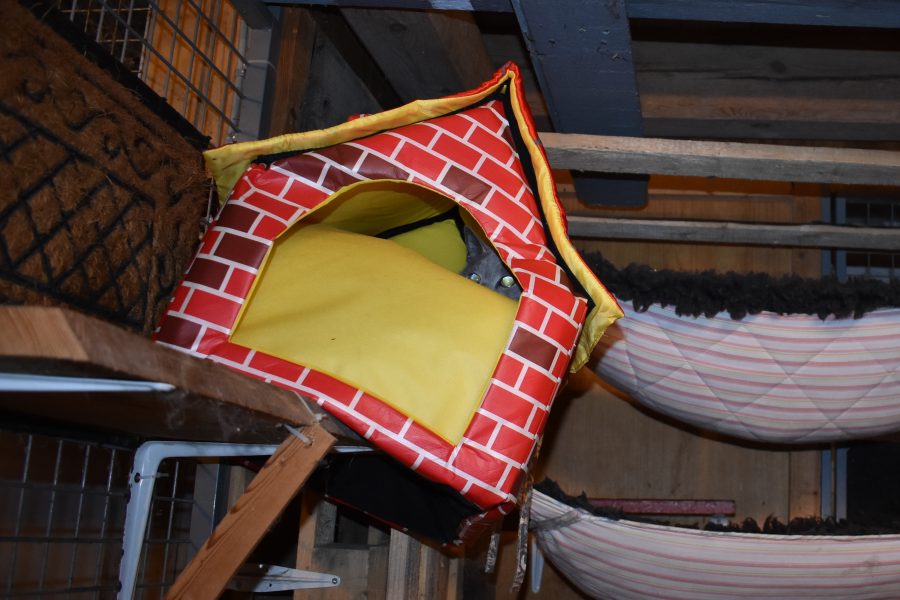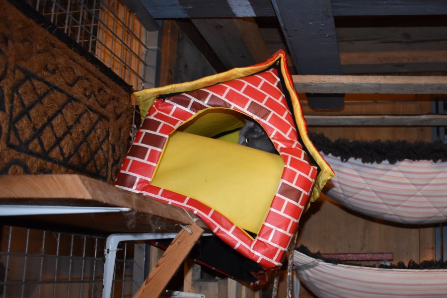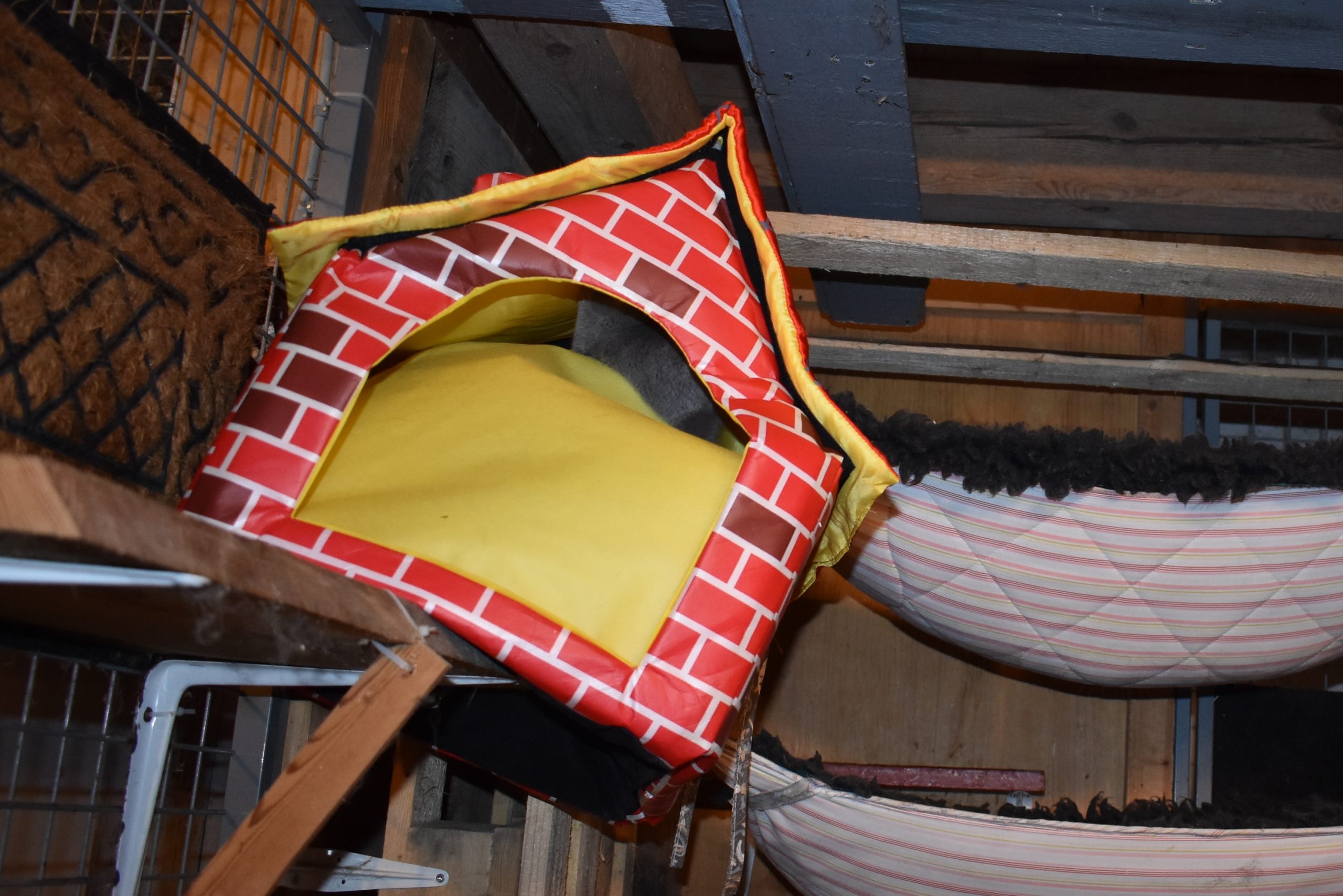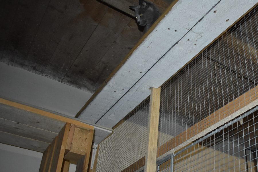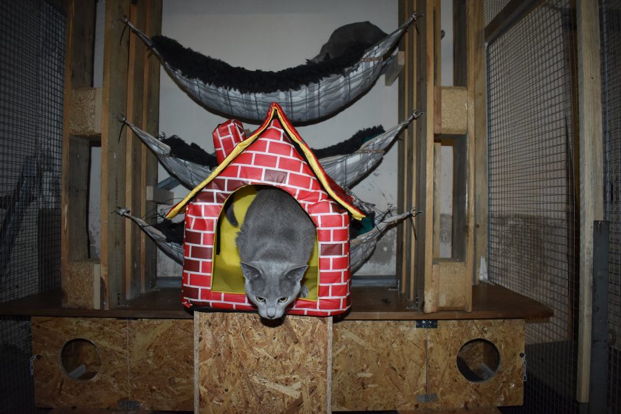 Jeg fik nogle smukke katte huse forærende fordi vedkommende der havde købt dem, havde katte der allerede havde yndlingspladser som de foretrak. Som Piet Hein skrev så er katte deres egen og det må man jo bare acceptere. Mine Russian Blue katte der har store volierer at bo i med forskellige muligheder for at klatre og huler at gemme sig i, prøver gerne noget nyt. Når mange katte bor sammen så slider det også på indretningen, så at få så fine huse bragte glæde blandt kattene og de blev undersøgt grundigt. Jeg synes jo at mine katte skal bruge arealet de har til rådighed helt op til loftet, og det betød at husene skulle fastgøres på en eller anden måde. Kattene var ret grundige i deres metoder til at prøve husene af, så det ene måtte simpelthen flyttes inden der var nogen der kom til skade. Jeg fik taget en del billeder og for en gangs skyld var kattene der hvor jeg pegede hen med kameraet, og sådan plejer det ikke at være. Alle mine katte er chippet, men det er umuligt at få dem til at beholde farvebåndet på, så jeg kan ikke fortælle hvilket navn de katte der er på billederne har, men jeg kan dog fortælle at der kun er 1 ung han kat på billederne, resten er hunkatte.