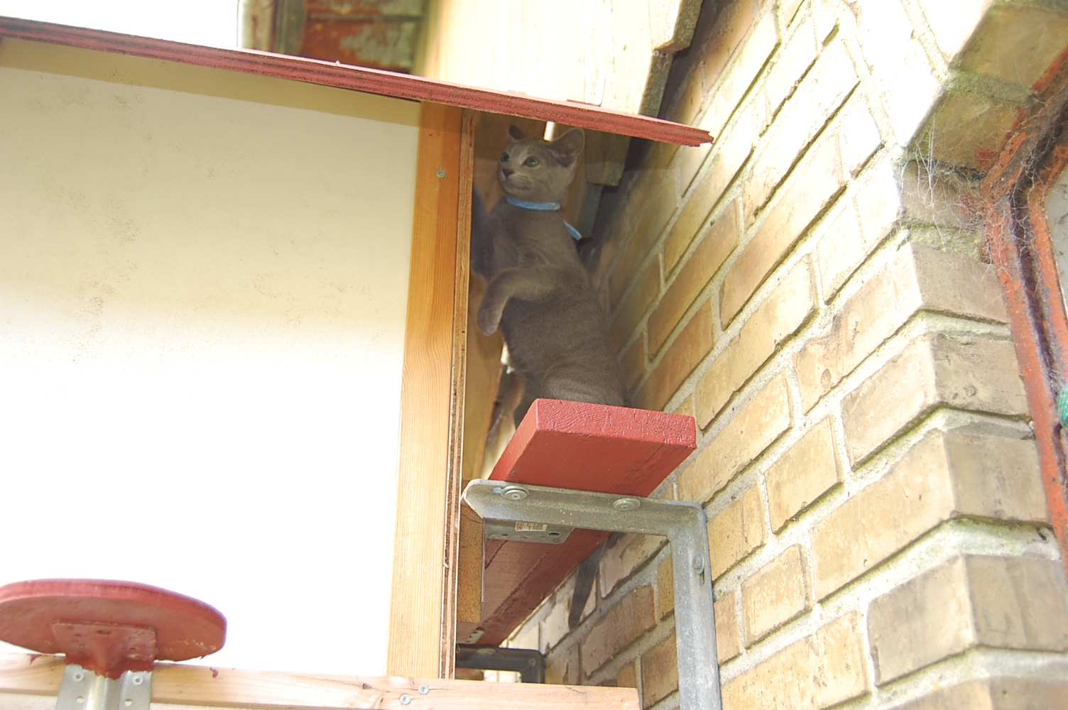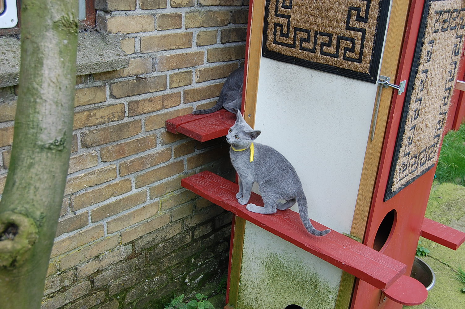 er der stadig nogen af der er til salg. De har fået rigtig smukke navne: Askim`s Blue Falcon, Askim`s Blue Fantasy, Askim`s Blue Fairy og Askim`s Blue Fame, og de var ude at lege på min store indhegnede gårdsplads. Da jeg kom derud med kameraet var det klatretårnet der blev grundigt udforsket. Det lykkedes mig dog kun at fange tre af dem på samme billede, men jeg tror at man kan se på billederne at de havde mægtigt sjovt.