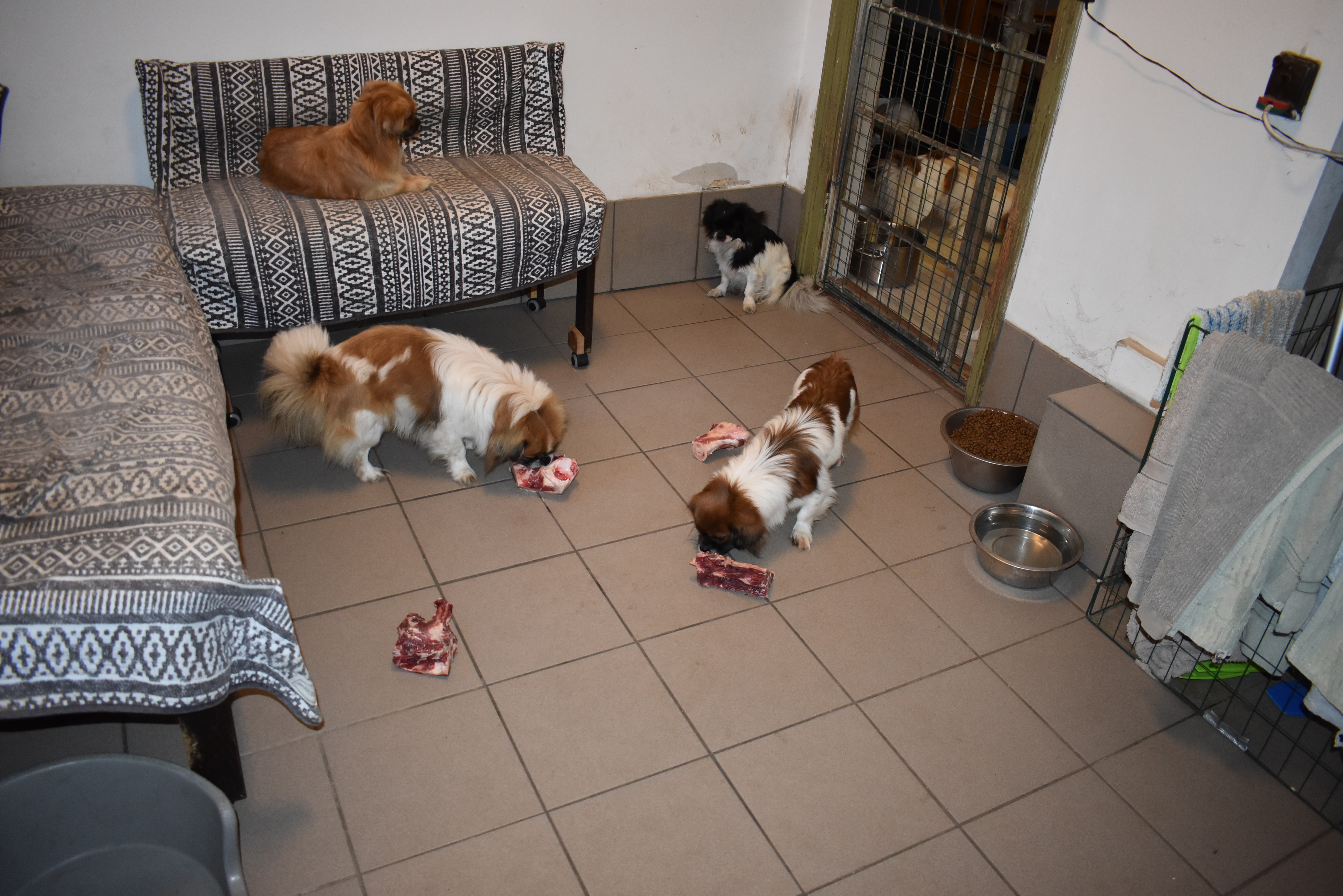 I går da vi havde gæster fik vi en meget stor pose kraftige okseknogler forærende. I dag har hundene fået lov at gnave ben inde i huset for det er bare så koldt og det stormer rigtig vildt udenfor. Det er lidt sjovt at se, at nogle af mine hunde helt sikkert ved, at de skal vente pænt til det bliver deres tur, og der bliver altid givet mindst et kødben pr hund. Det er hundenes egen rangorden der bestemmer hvem der har ret til at bestemme først hvilket ben de vil have, og det foregår stille og roligt.