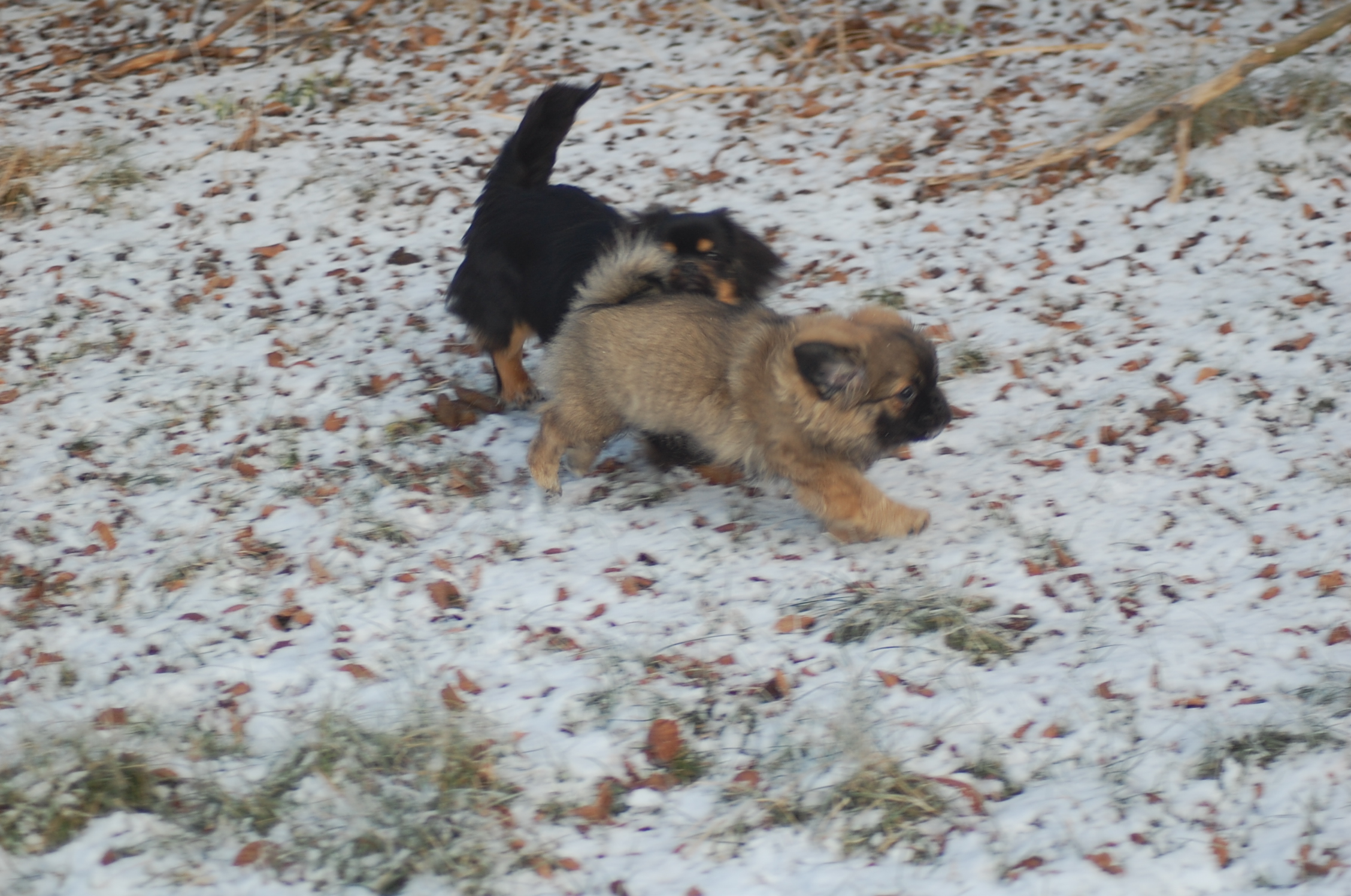 Efter mange dage uden sol nyder hundene at komme ud i haven når solen skinner og det ikke blæser. Det er vanskeligt at tage billeder når hundene har så meget krudt i sig de skal have brændt af, men der blev da nogen stykker der ikke blev helt tågede.