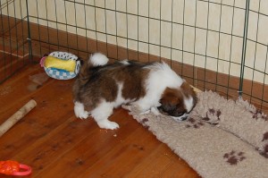 Selvom jeg tror at jeg har givet en hvalp et godt navn, så har den nye ejer af og til en anden mening, og Askim`s Xe-Ro Kenzo vil i sit nye hjem blive kaldt Mickey. Jeg ville gerne have nogle billeder udenfor, men det blev ikke til så meget for hvalpene frøs og kom hurtigt ind igen. I dag var det Santo og Olympia der påtog sig rollen som barnepiger mens hvalpene var ude.