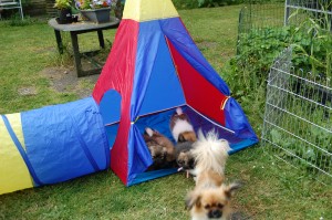 Så fik hundehvalpene lidt nyt miljø at lege i på gårdspladsen. Jeg fandt et legetelt i tre dele i Jysk der var sat ned til kun 100 kr og det måtte jeg jo lige se om mine hvalpe syntes om og det var virkeligt et hit. Især var det rigtigt sjovt at løbe rundt i tunnellen og jeg fik heldigvis taget en del billeder.