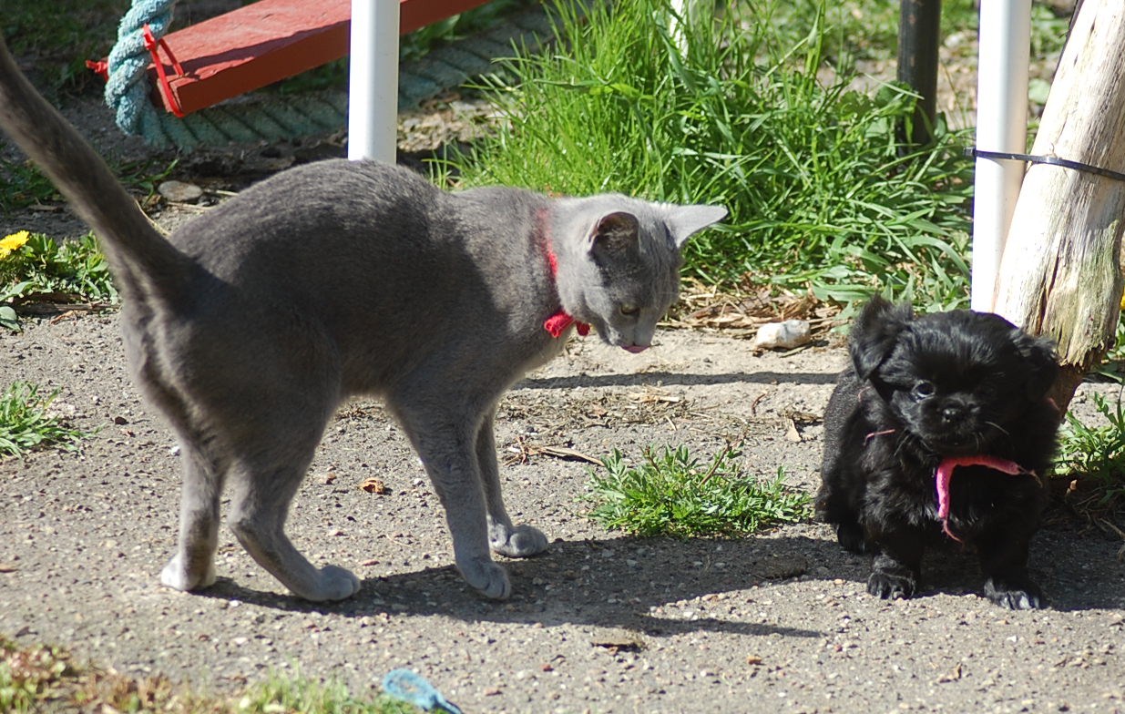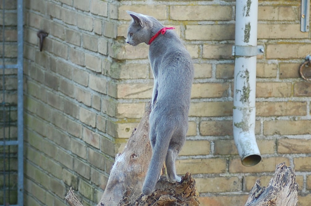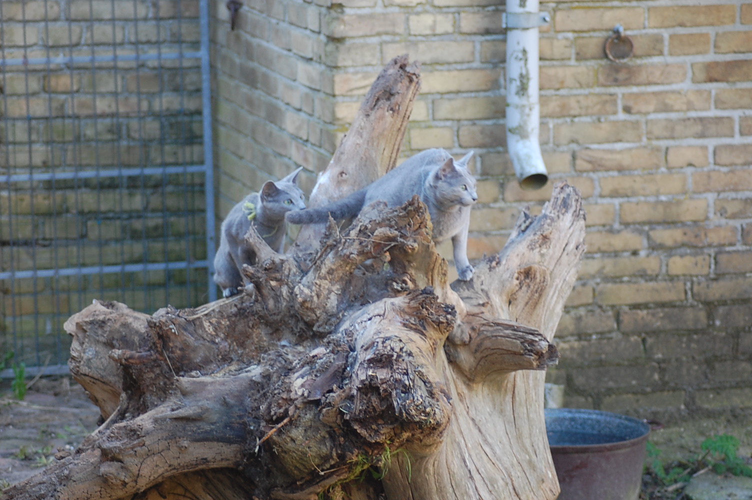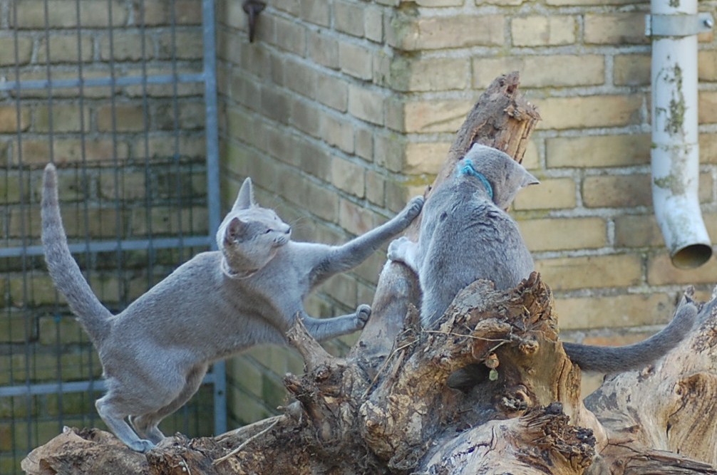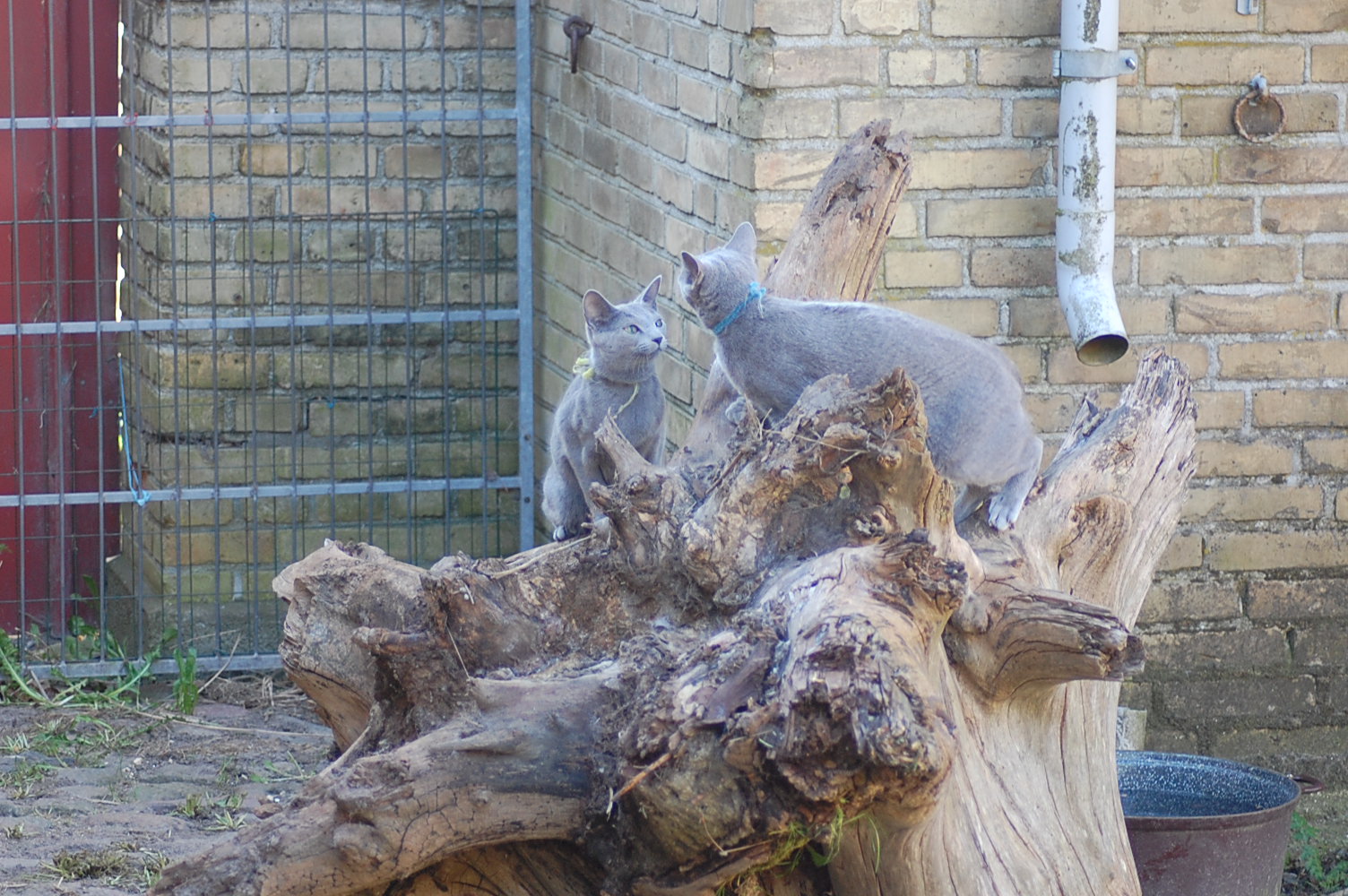bruger både katte og hunde timer på at nyde det gode vejr og på at få lov til at røre sig. De får også nogle erfaringer i hvordan man skal opføre sig overfor andre dyr, og sommetider kan det gå ret vildt til. Den store træstub der ligger derude har nærmest altid været der, men da jeg flyttede den lidt så rødderne kom op i luften blev den ny og spændende for kattene.