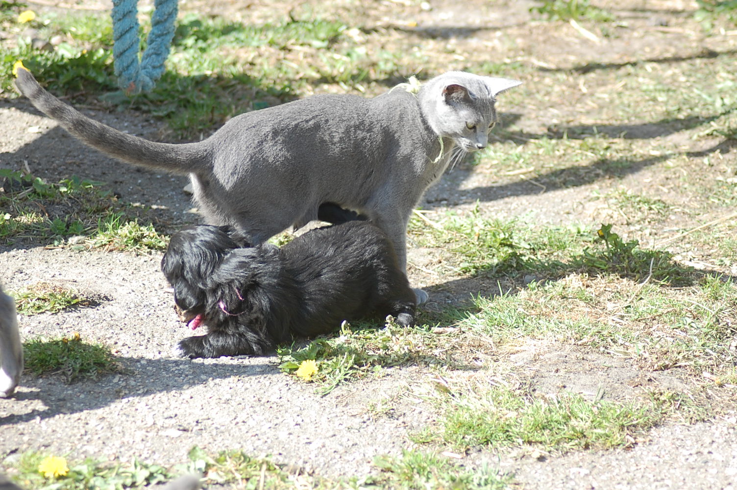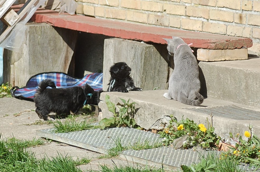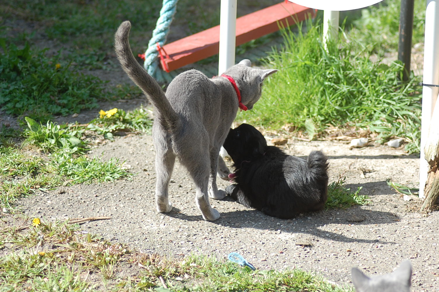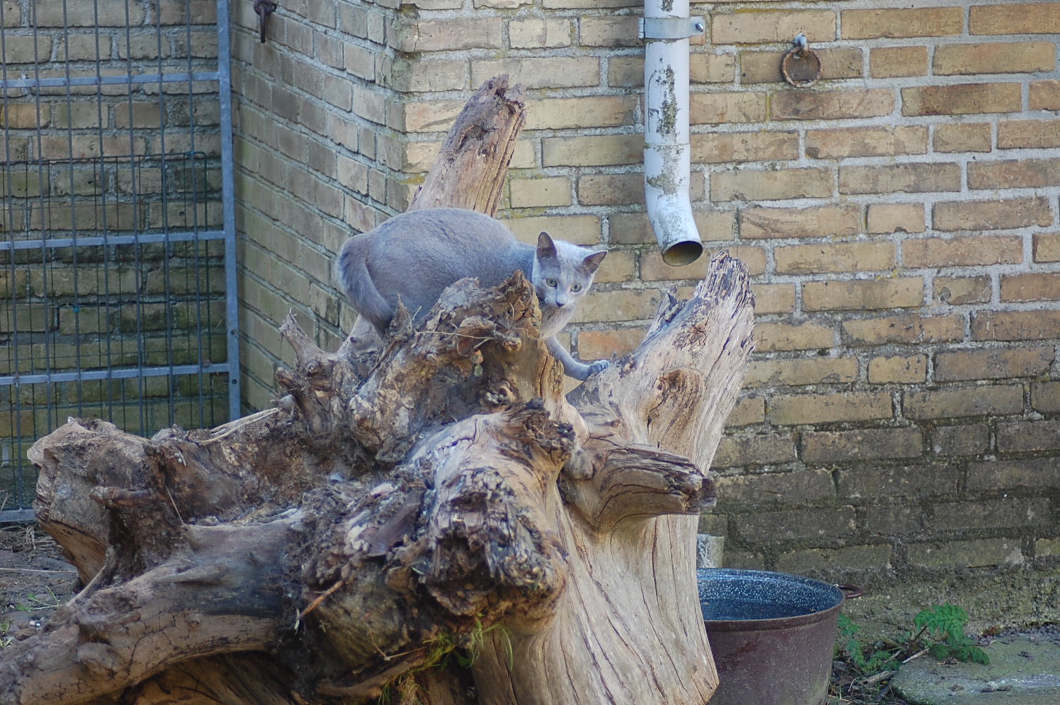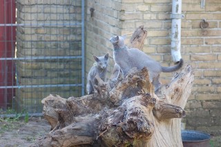 bruger både katte og hunde timer på at nyde det gode vejr og på at få lov til at røre sig. De får også nogle erfaringer i hvordan man skal opføre sig overfor andre dyr, og sommetider kan det gå ret vildt til. Den store træstub der ligger derude har nærmest altid været der, men da jeg flyttede den lidt så rødderne kom op i luften blev den ny og spændende for kattene.