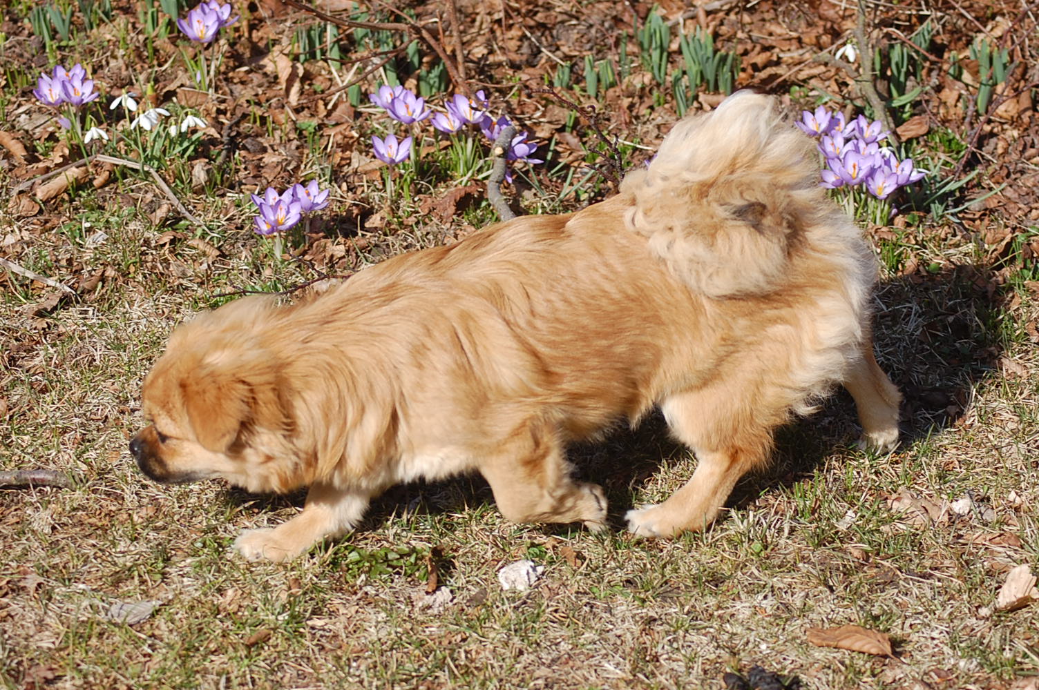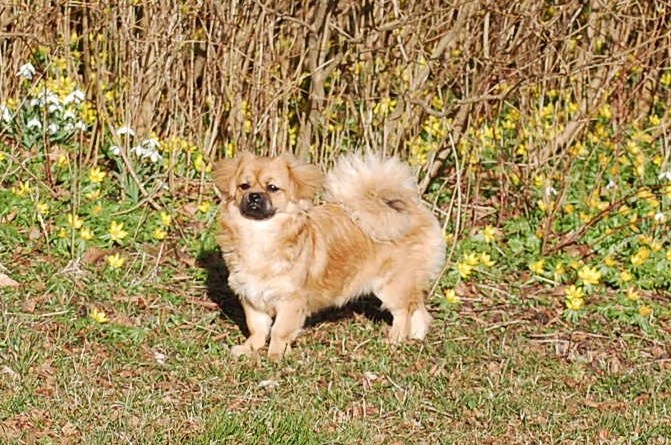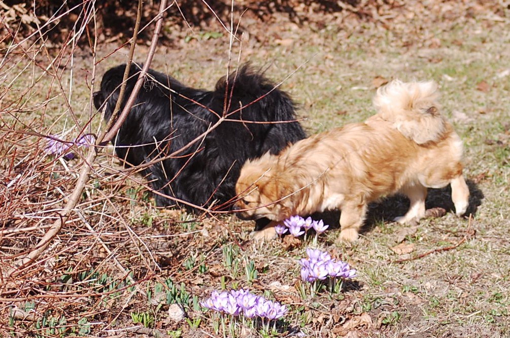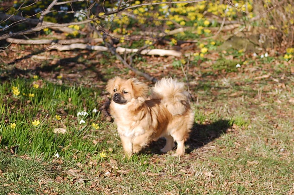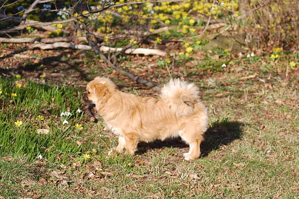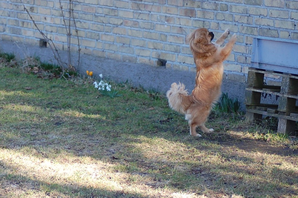 I min have blomstrer der både krokus, vintergækker og erantis og da solen skinnede så dejligt, tog jeg Ruby ud i haven sammen med kameraet. Jeg havde en idè om at jeg ville tage nogle billeder af Ruby sammen med forårsblomsterne. Der er sommetider meget langt fra idèen til det færdige resultat på hjemmesiden, og da mit kamera også løb tør for strøm, var jeg ved helt at opgive projektet. Men når man vil fotografere levende dyr så er det en stor fordel at være temmelig stædig, så efter at have haft batteriet til kameraet til opladning prøvede jeg igen, og dette her er så hvad jeg opnåede af forårsbilleder, plus de 72 jeg bare slettede da jeg havde set nærmere på dem.