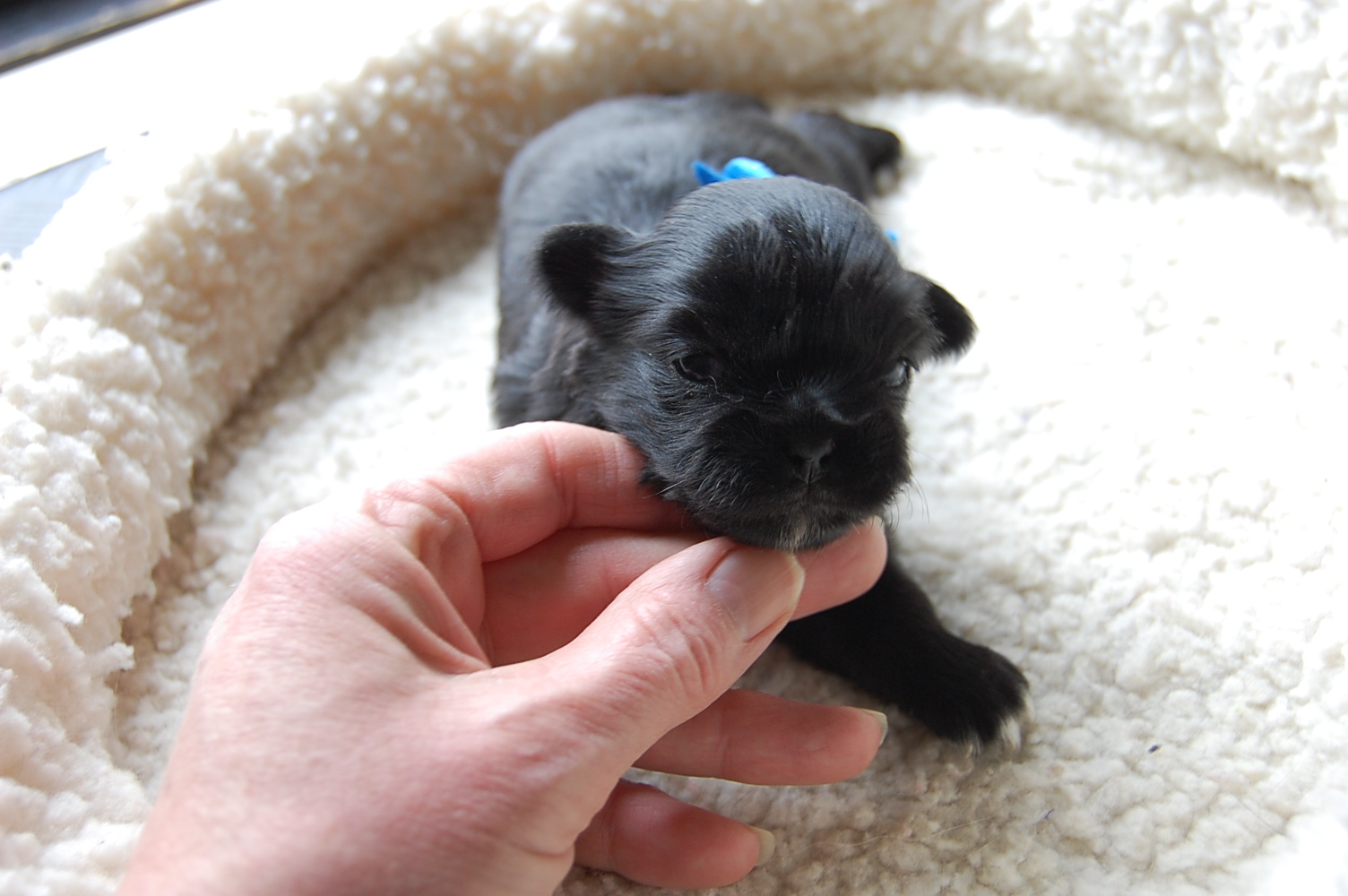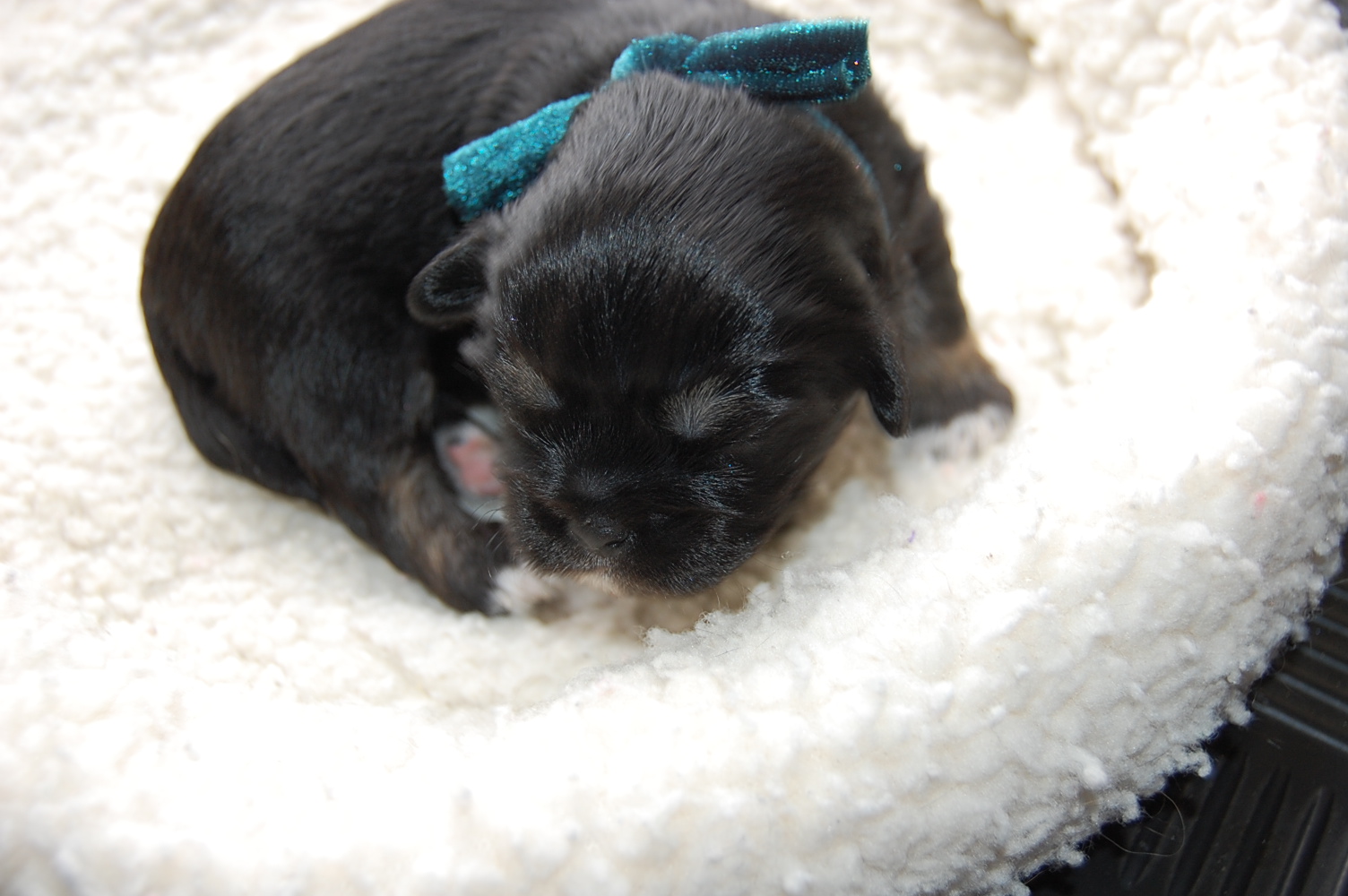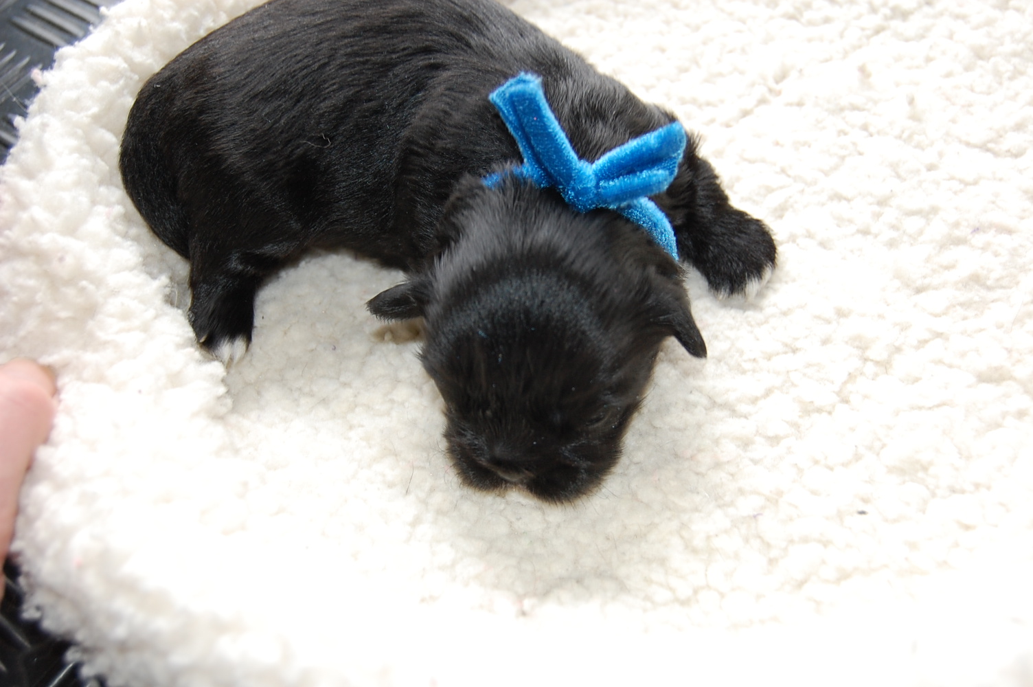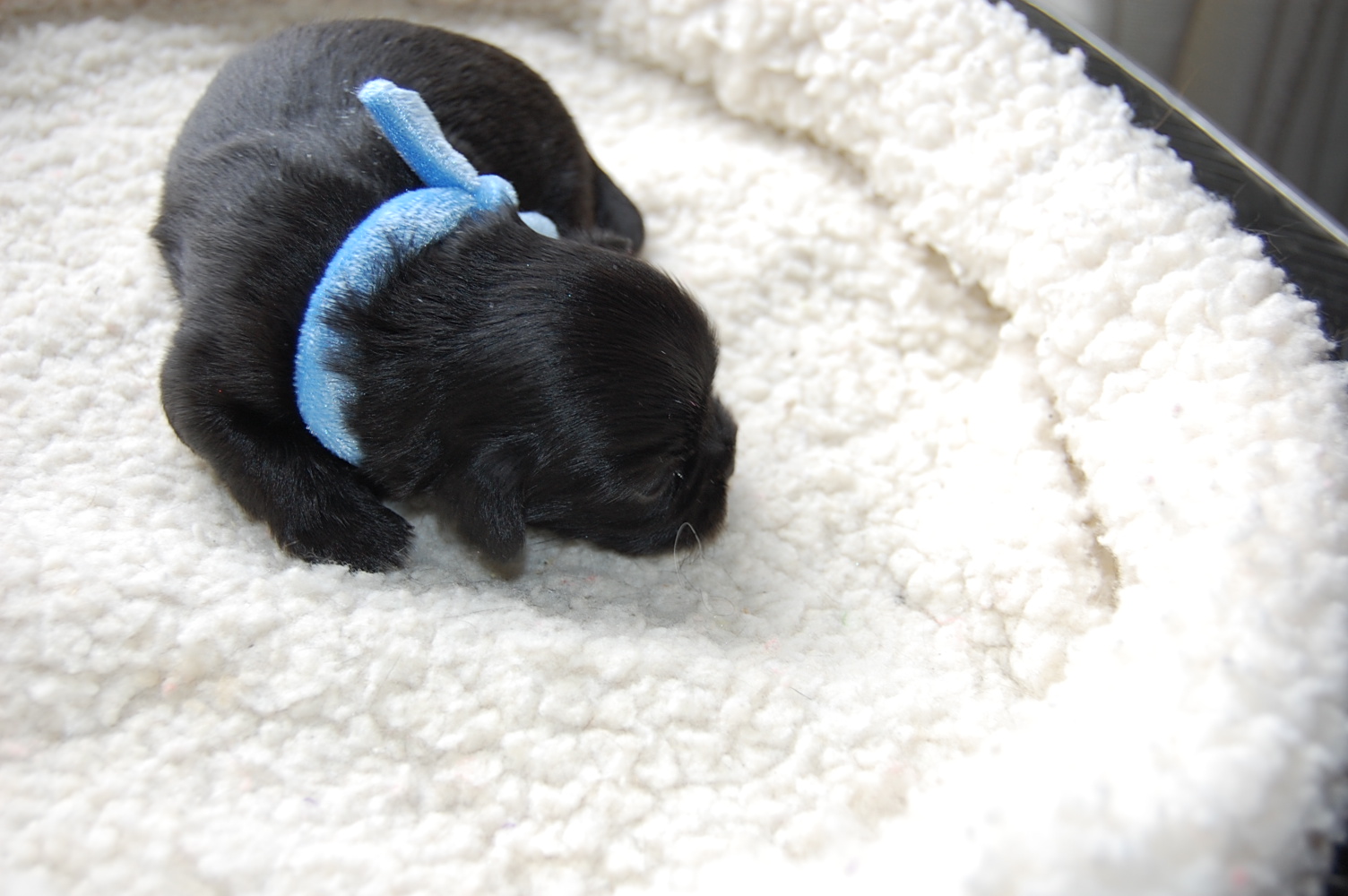 og den ene endda black og tan, er jo hvad jeg har ønsket mig meget længe. I går fik jeg taget nye billeder af hvalpene og de fik snore på, så det ikke er muligt at tage fejl af navnene. Tævehvalpen der er sort med lidt hvidt på tæerne i venstre side, kommer til at hedde Kar-Ma, hun har rødt bånd. Den sorte hvalp med hvidt på brystet kommer til at hedde Kanto, han har lyseblåt bånd. Den sorte hvalp med meget hvidt på brystet kommer til at hedde Zorro, han har blåt bånd. Den black og tan han kommer til at hedde Zanto, han har grønt bånd. Alle fire trives godt og Andie er en meget omsorgfuld mor der har sørget så godt for hvalpene at der ikke høres det mindste klynk fra hvalpesengen. Det ser ud til at alle fire hvalpe er lige så nemme som forældrene. De kan også ses på web-cam.