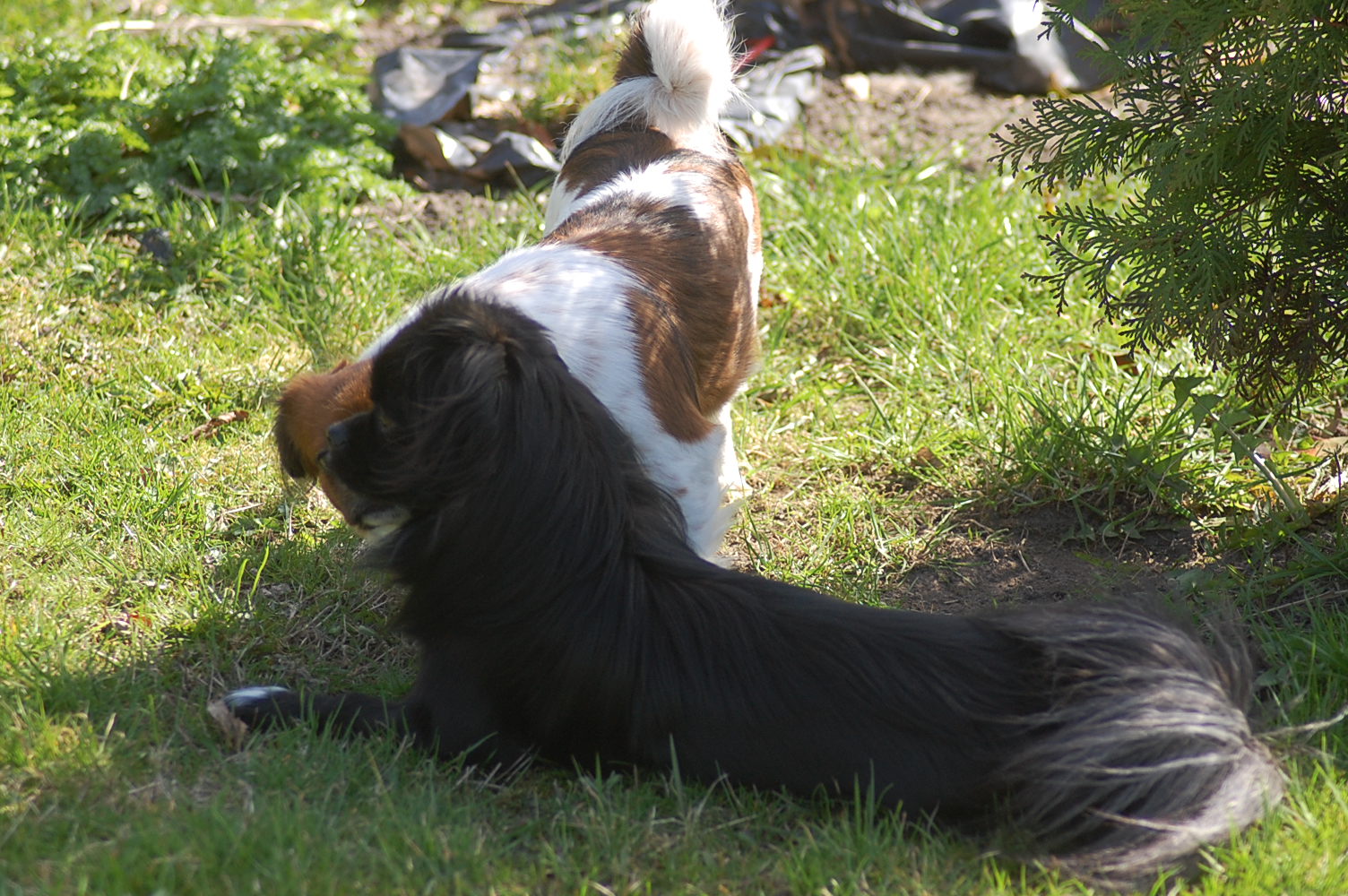 måtte det her indlæg bare hedde ! Ghana kom forbi igen i dag, inden de tog hjem, og gensynsglæden var stor mellem Ley-La og Ghana, og tiden gik med vild leg og tossestreger ude i haven. Lige nu er Ley-La jo fældet fuldstændig ned og ligner næsten ikke sig selv, men pelsen er allerede på vej igen og farverne forsvinder jo ikke, de er stadig lige glødende mahognirøde.