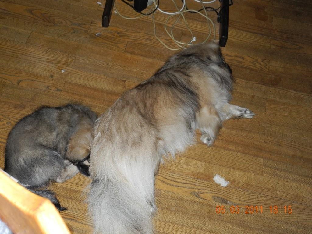 af sin nabo, og et halsbånd og en line til Frigge, og Youkki trasker jo bare trolig efter ham, men hun kom med dem, da jeg ikke kan gå så langt, men den flinke