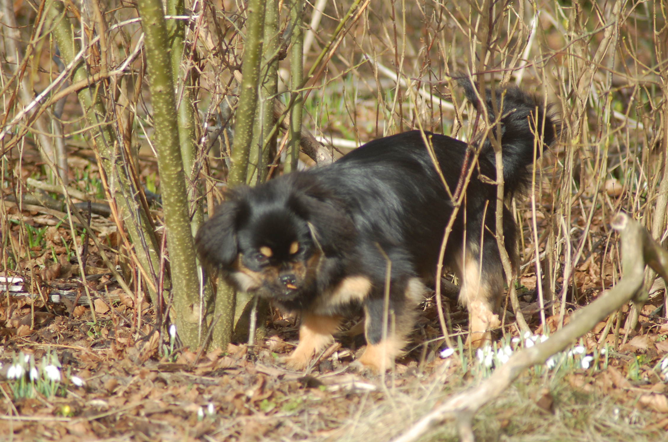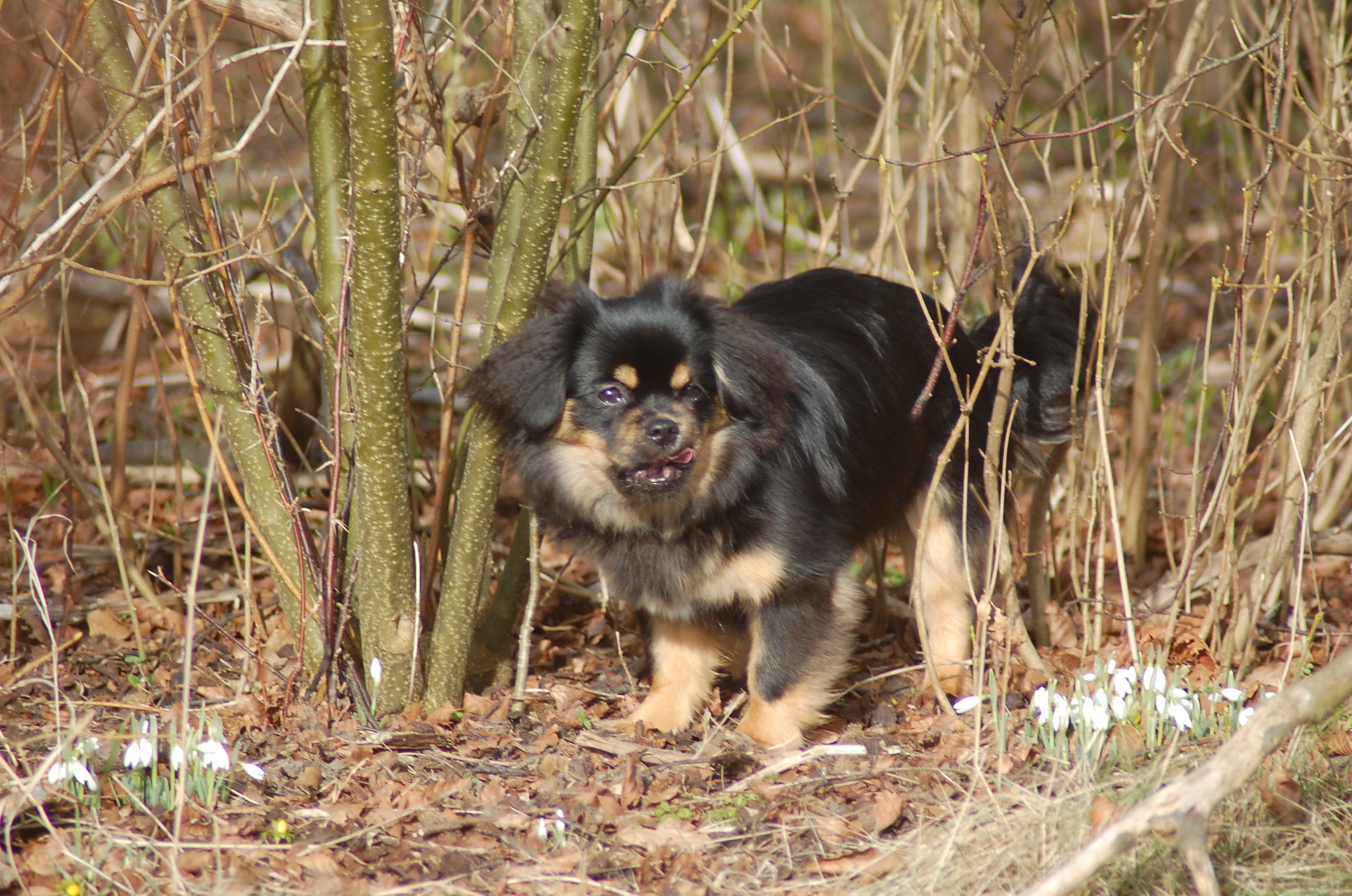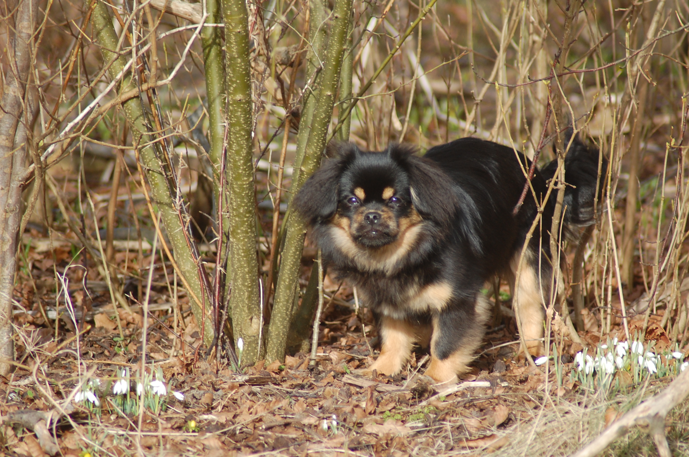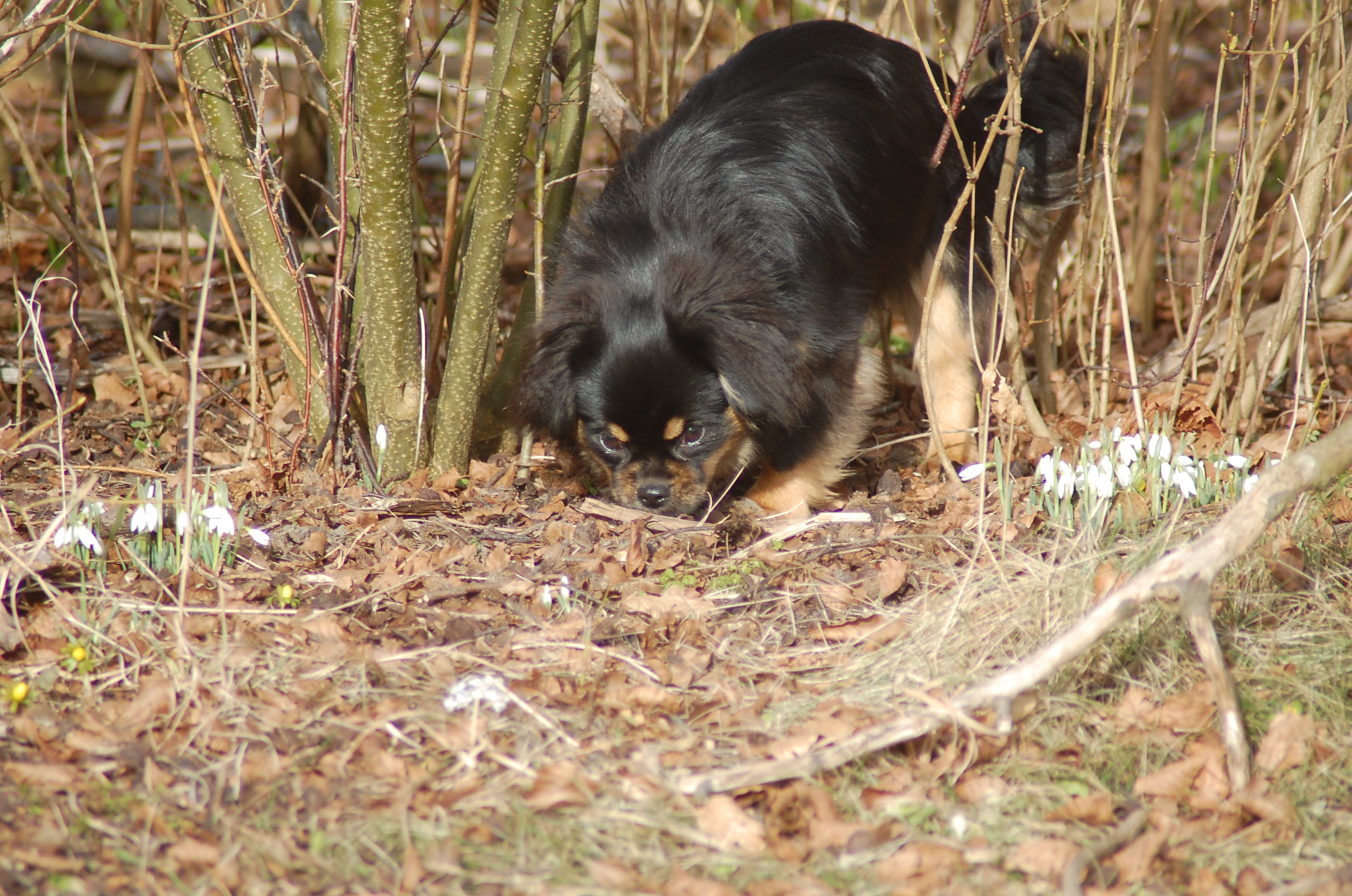var emnet jeg ønskede at fotografere i dag, men man kan nu ikke sige at hun var meget samarbejdsvillig. Jeg havde en idè om at jeg ville kunne få et rigtigt dejligt billede af hende imellem erantis og vintergækker. Jeg bevæbnede mig med en god håndfuld hundeguf og jeg prøvede længe, at få et rigtigt godt billede. Bonnie nød gufferne, men billedet fik jeg ikke. Lige pludselig var motivet der, og jeg var nær gået glip af det, for det var slet ikke Bonnie der poserede som jeg ønskede det, men derimod Ley-La der nysgerrigt kom forbi for at se hvad det var der var så interessant, og stod næsten som jeg ønskede det.