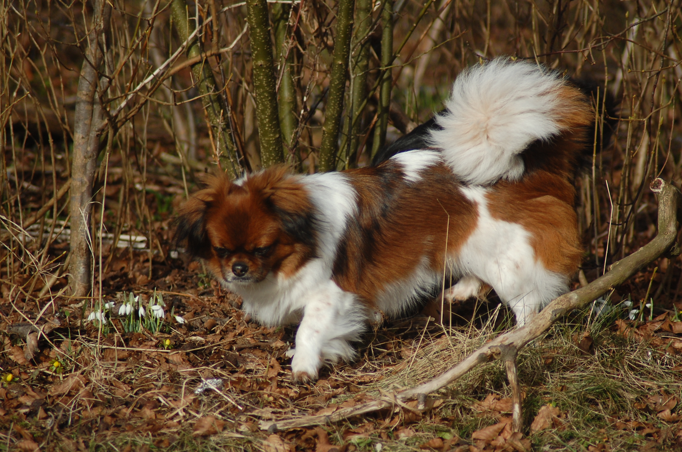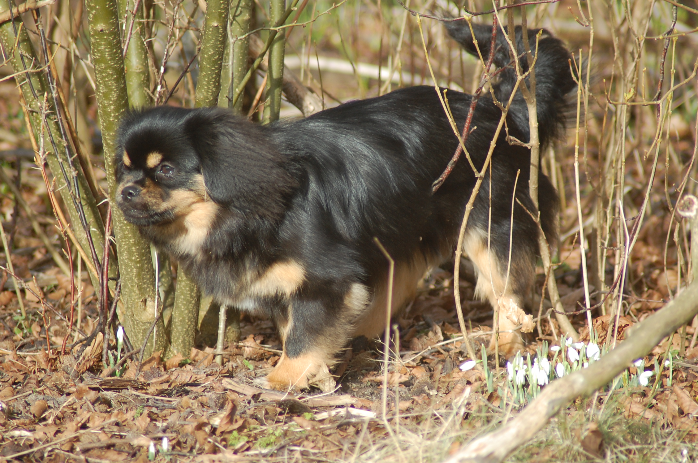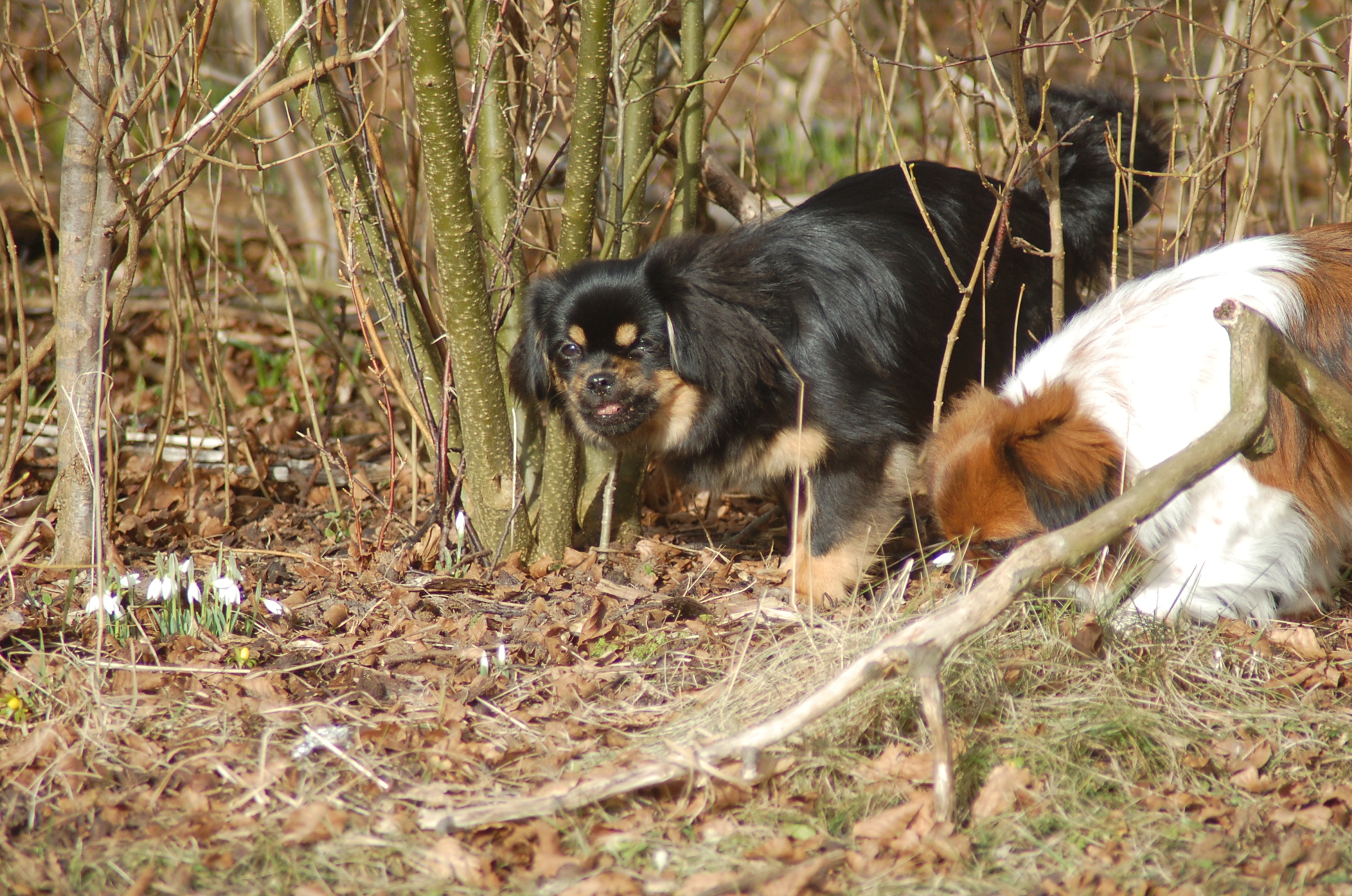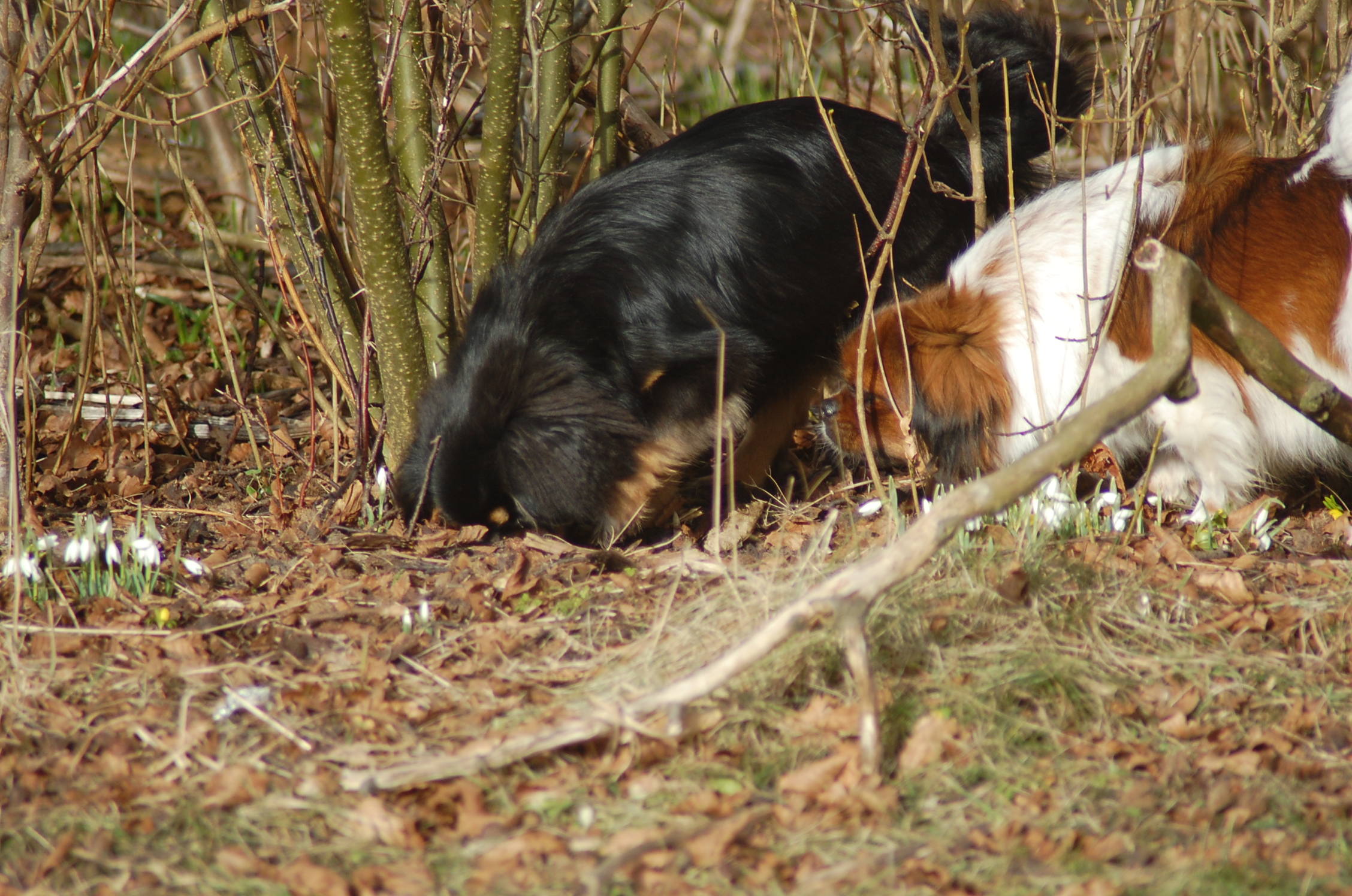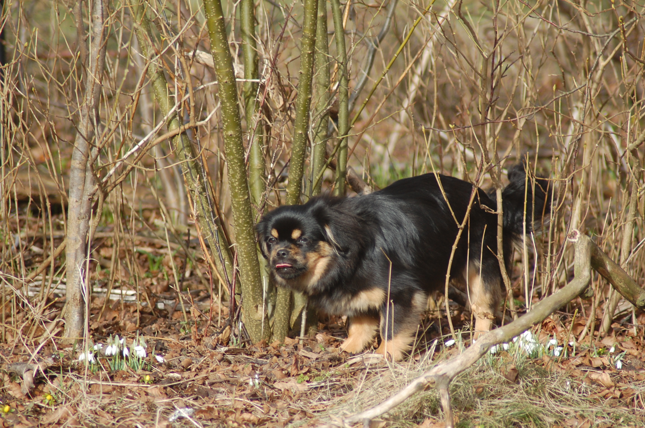 var emnet jeg ønskede at fotografere i dag, men man kan nu ikke sige at hun var meget samarbejdsvillig. Jeg havde en idè om at jeg ville kunne få et rigtigt dejligt billede af hende imellem erantis og vintergækker. Jeg bevæbnede mig med en god håndfuld hundeguf og jeg prøvede længe, at få et rigtigt godt billede. Bonnie nød gufferne, men billedet fik jeg ikke. Lige pludselig var motivet der, og jeg var nær gået glip af det, for det var slet ikke Bonnie der poserede som jeg ønskede det, men derimod Ley-La der nysgerrigt kom forbi for at se hvad det var der var så interessant, og stod næsten som jeg ønskede det.