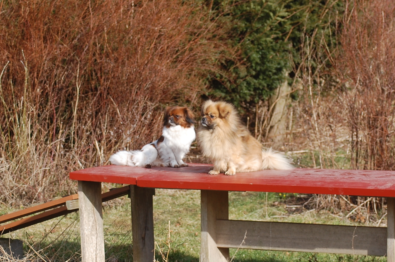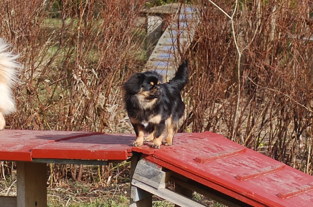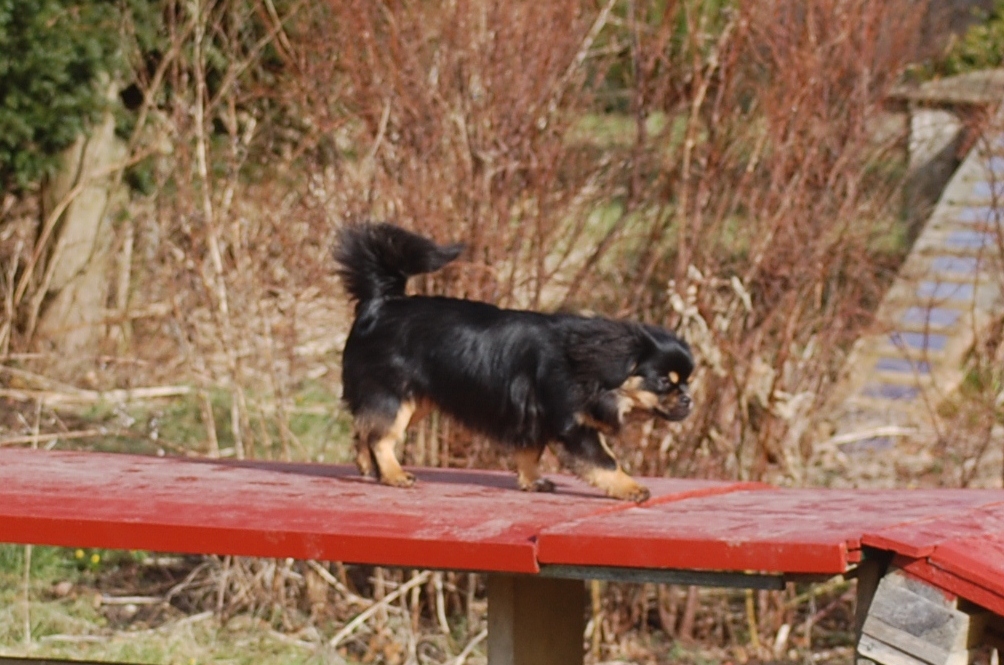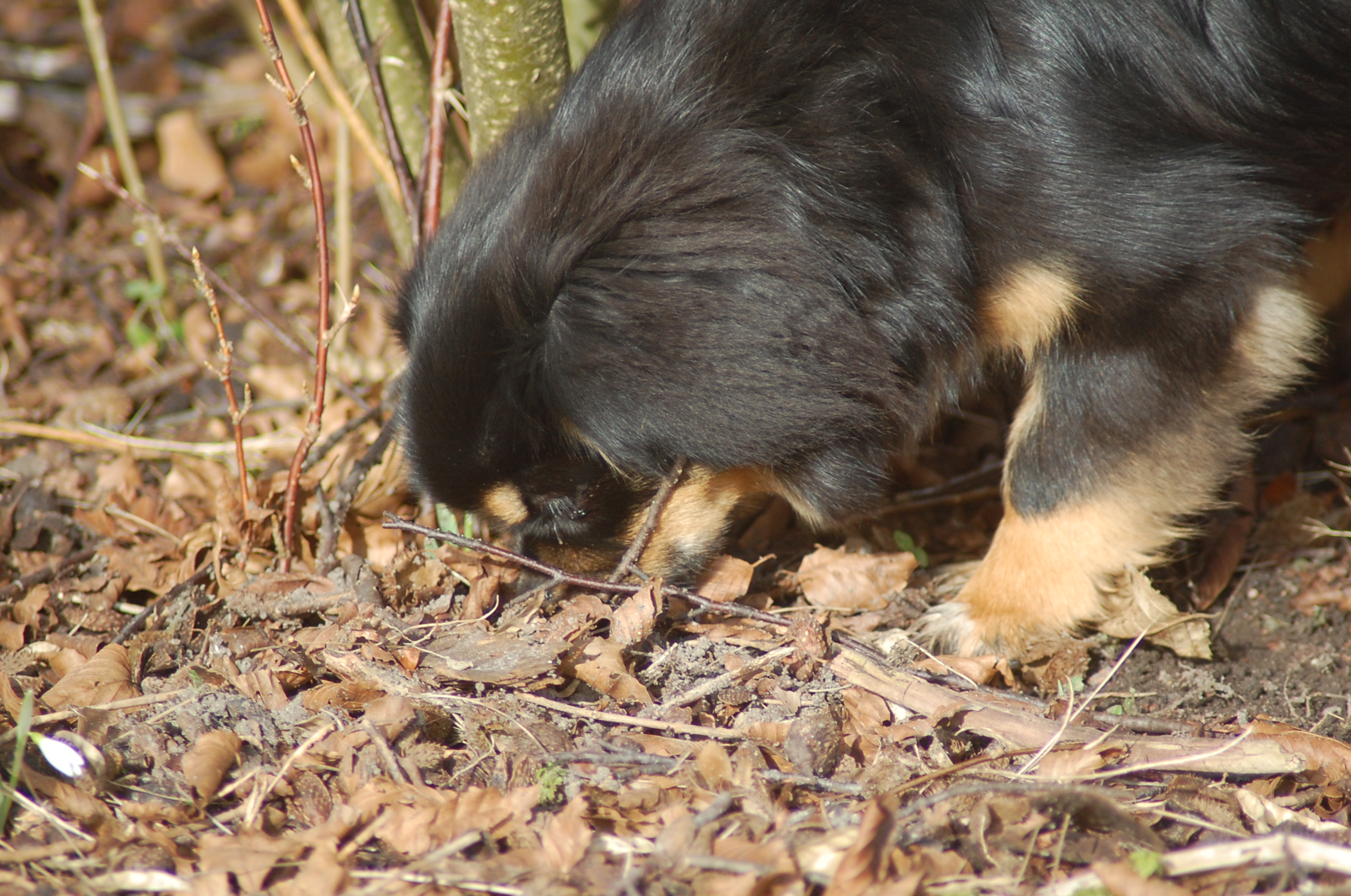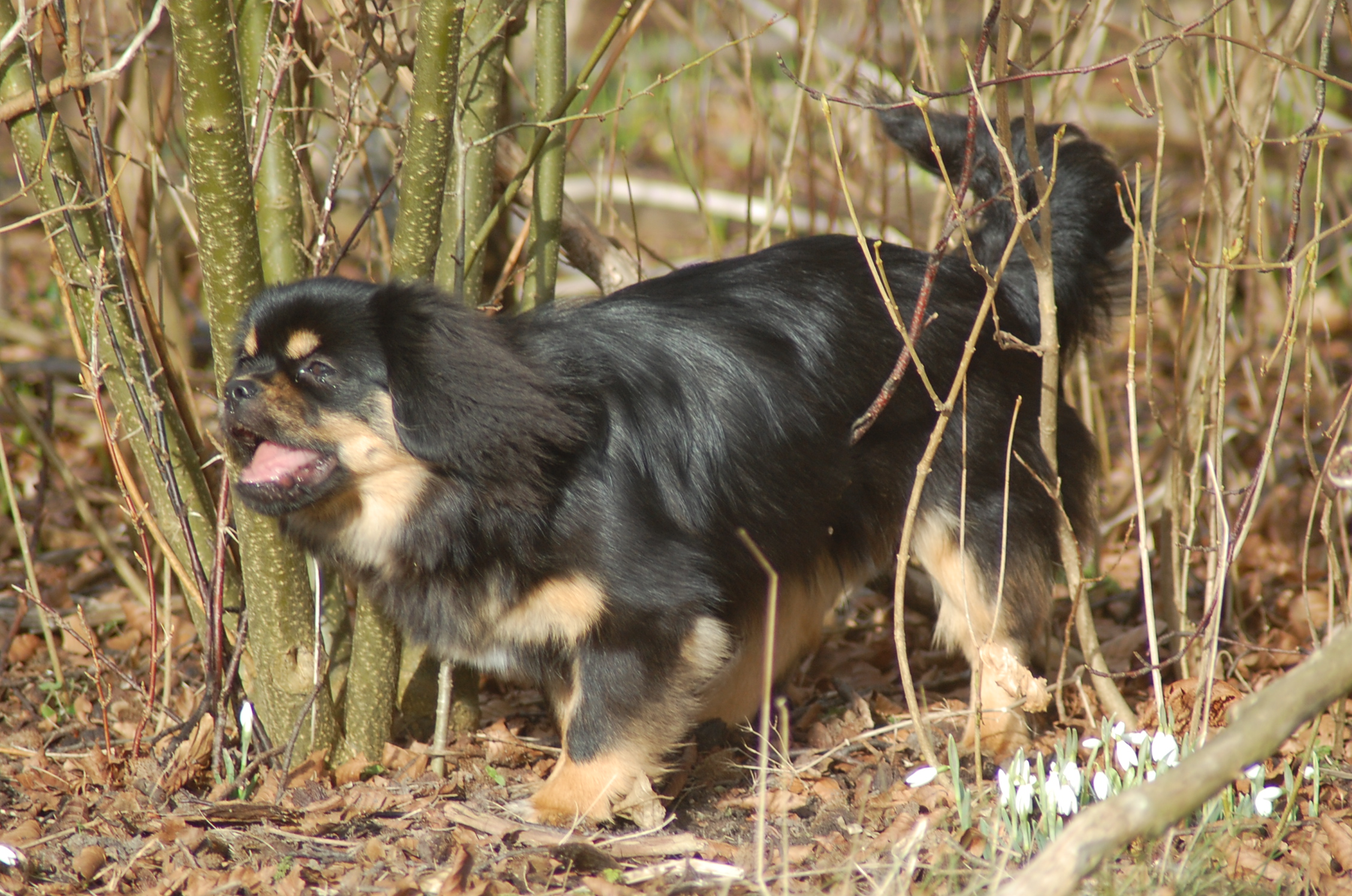 var emnet jeg ønskede at fotografere i dag, men man kan nu ikke sige at hun var meget samarbejdsvillig. Jeg havde en idè om at jeg ville kunne få et rigtigt dejligt billede af hende imellem erantis og vintergækker. Jeg bevæbnede mig med en god håndfuld hundeguf og jeg prøvede længe, at få et rigtigt godt billede. Bonnie nød gufferne, men billedet fik jeg ikke. Lige pludselig var motivet der, og jeg var nær gået glip af det, for det var slet ikke Bonnie der poserede som jeg ønskede det, men derimod Ley-La der nysgerrigt kom forbi for at se hvad det var der var så interessant, og stod næsten som jeg ønskede det.