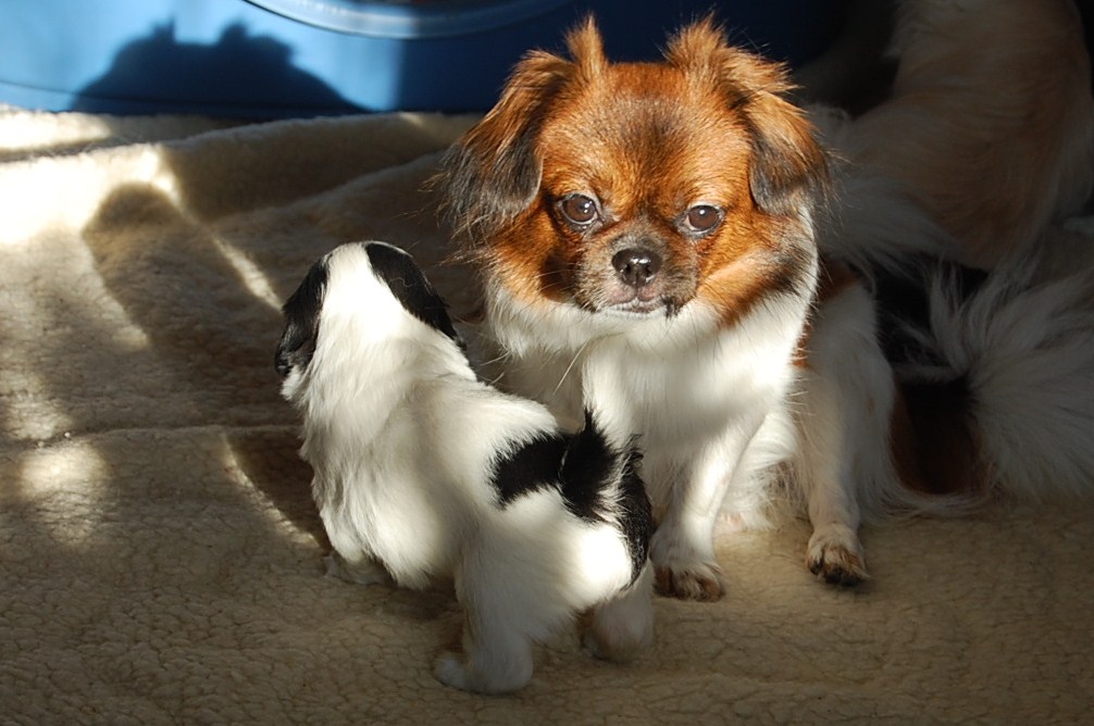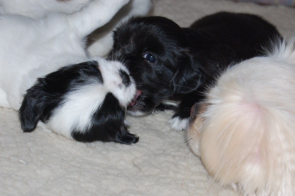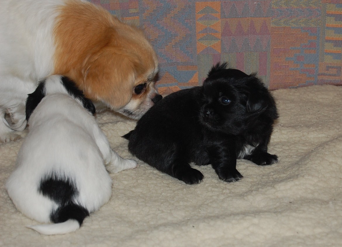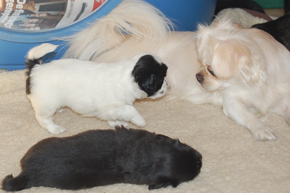 har hvalpene jo ikke , men i praksis har de tre opmærksomme tæver omkring sig, så snart de giver lyd fra sig. Faktisk er det meget svært at tage billeder af dem for alt for ofte får jeg bare en klump hunde og hvalpe, der ikke rigtig ligner noget særligt. Der er jo også det specielle ved dette kuld at de to af hvalpene er sorte og det er svært at fotografere sorte hunde, især når de ligger i nærheden af hinanden, så det er svært at se hvor den ene holder op og den anden begynder. Hvalpene vokser fint og de bliver dygtigere for hver dag der går, hundesengen er det ikke lægere noget problem at komme ud af og man kommer også fint ind igen. De kan nu begynde at gå omkring på deres usikre ben, og der er også rigtig mange lyde i dem. De er også begyndt at lege med hinanden, men der kan vi rigtig se at al begyndelse er svær, for de trimler jo ofte omkuld midt i det hele.