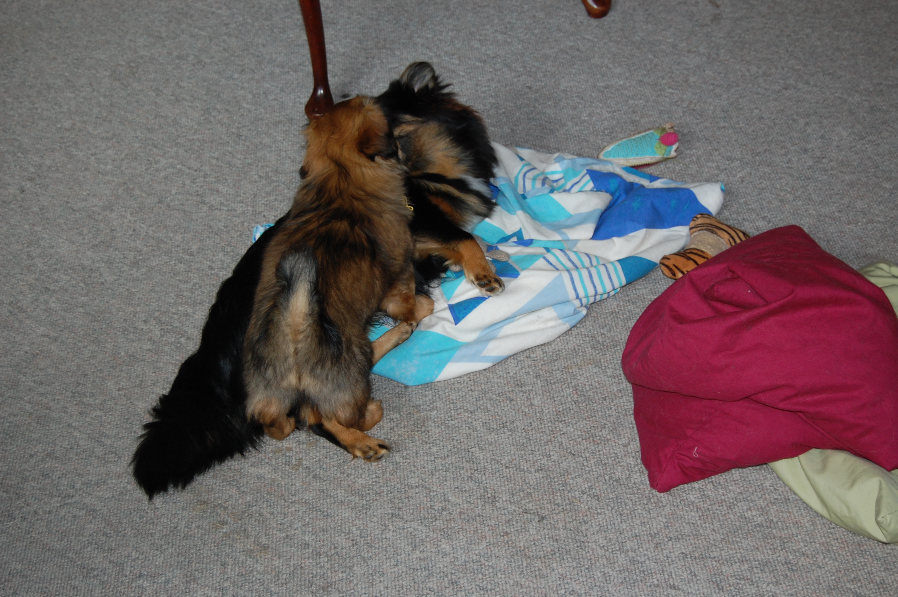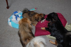 Jeg har haft besøg af en opdrætter fra Slovenien der kom til Danmark med en hanhvalp fra sit opdræt til mig : Gizmoland Cinnamon Cupcake = Simon og hun skulle så have en hvalp med fra mig Askim`s Oph-Ty Dana. Der er ikke så mange Tibetanske Spaniel i Slovenien, så de ville meget gerne se nogle tibber i Danmark, mens de var her. De havde et par overnatninger her så vi havde tid til at køre rundt og se på Danmark , men når det er hundefolk så er det jo hundene der er det primære. Selvfølgelig fik de set de voksne hunde og hvalpe først, som jeg har her hos mig, men dagen efter tog vi på en tur til Fyn hvor vi først besøgte Askim`s Ru-Fan Tyler = Tyler, der er efter P`zazz Ruby og Saffron Fanthom. Tyler er nemlig far til Dana der nu bor i Slovenien. I den samme familie bor også Askim`s Le-Gan Aske = Aske, der er efter Grothovda`s Ley-La og Shunyata Gan-Dar. Simon var med på turen og blev afleveret ved den sidste familie vi besøgte fordi det er planen at han skal leve hos en fodervært på Fyn og forhåbentlig når han bliver gammel nok, skal blive far til smukke sunde hvalpe, med en spændende stamtavle. Det allerførste billede jeg vil vise jer er der hvor hundene får besked på at de skal være rolige fordi det er en baby der er på besøg. Jeg er virkelig så imponeret, for resten af tiden vi var i hjemmet, ville hundene absolut meget gerne lege, men det foregik roligt og afbalanceret, og Simon måtte gerne ” stjæle ” deres tyggeting og deres andet legetøj.