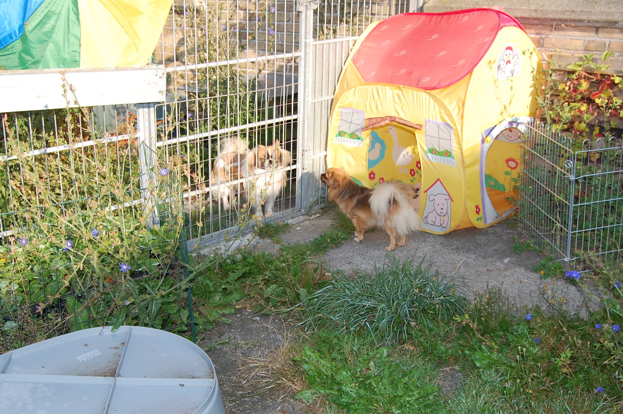 Dejlige Yoda og Tosca er på besøg og de får mine hanner til at blive meget vildt forelskede, for lækre lille Tosca er højløbsk og hende kunne de to drenge godt tænke sig at komme på nærmere hold af. Det er heldigvis så praktisk at jeg har gitterlåger som de kan se og snuse igennem, uden at de kommer sammen med hende, og jeg tror aldrig jeg har set hanner lette så meget ben som nu.