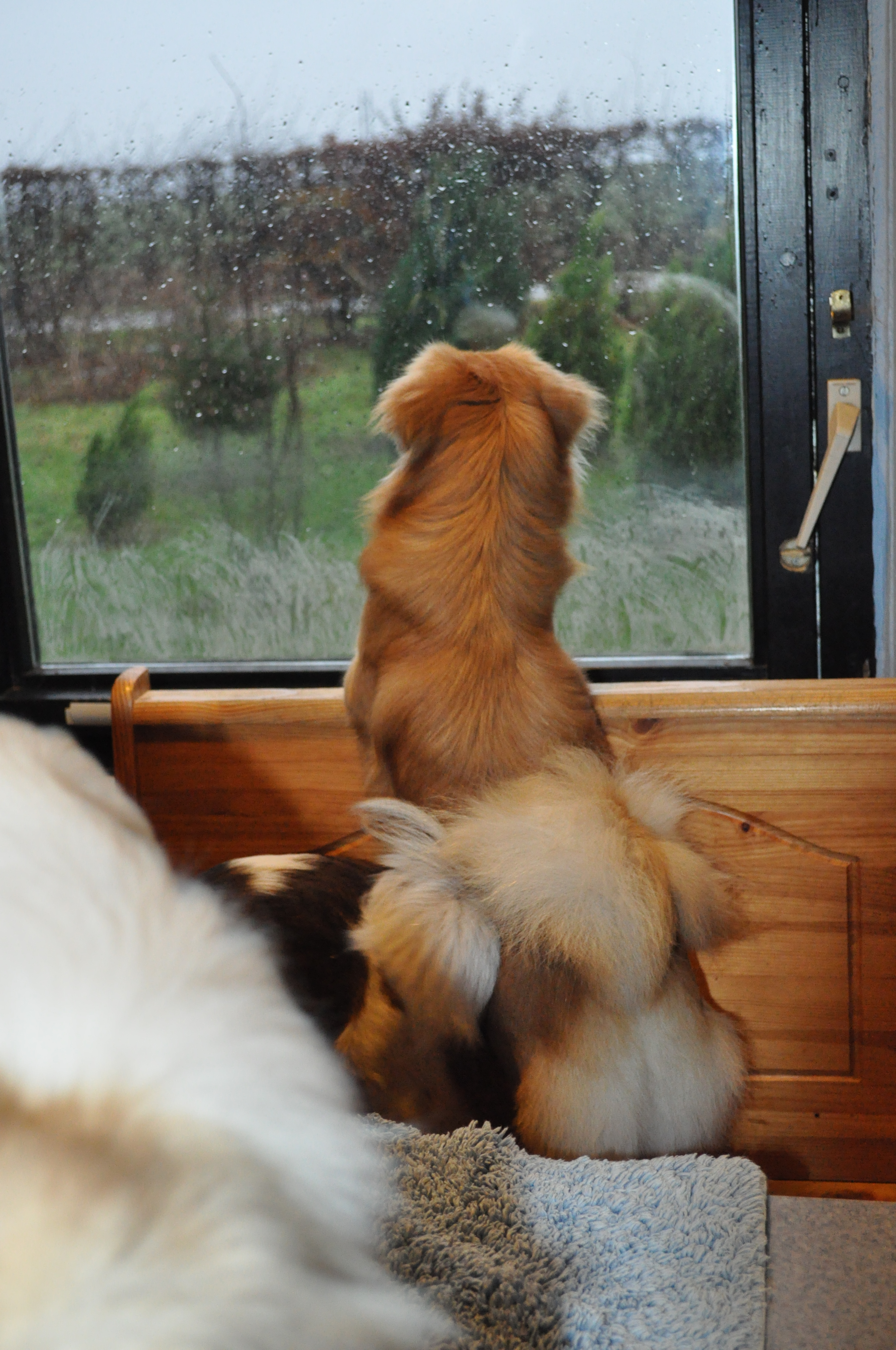 Efter mange dage uden sol nyder hundene at komme ud i haven når solen skinner og det ikke blæser. Det er vanskeligt at tage billeder når hundene har så meget krudt i sig de skal have brændt af, men der blev da nogen stykker der ikke blev helt tågede.