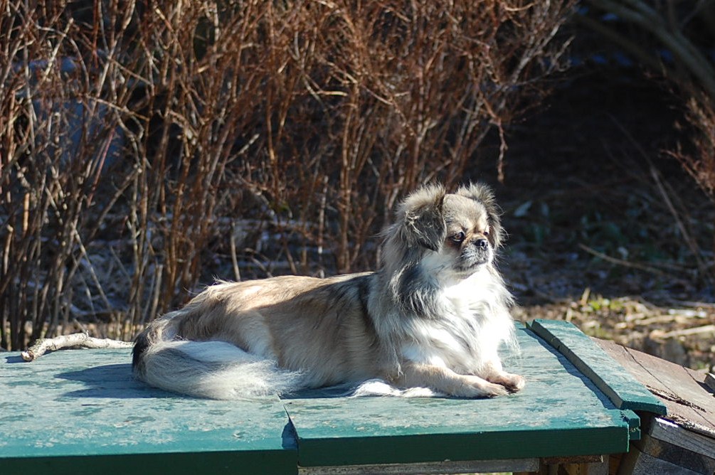 er på vej og vi glæder os til at se hvad der kommer. Næsten alle farver er en mulighed så vi håber på et broget kuld der har arvet det bedste fra begge forældre. I dag ville jeg have billeder af de vordende forældre, for det er dejligt vejr med solskin og forårsfornemmelser i luften, men Andie tripper forsigtigt rundt, med sin temmelig store mave , og Oliver var mere interesseret i forårsblomsterne i skovbunden. Jeg fik dog nogle billeder der viser et par selvsikre tibber, i fuld pels, der nyder en forårsdag i haven.